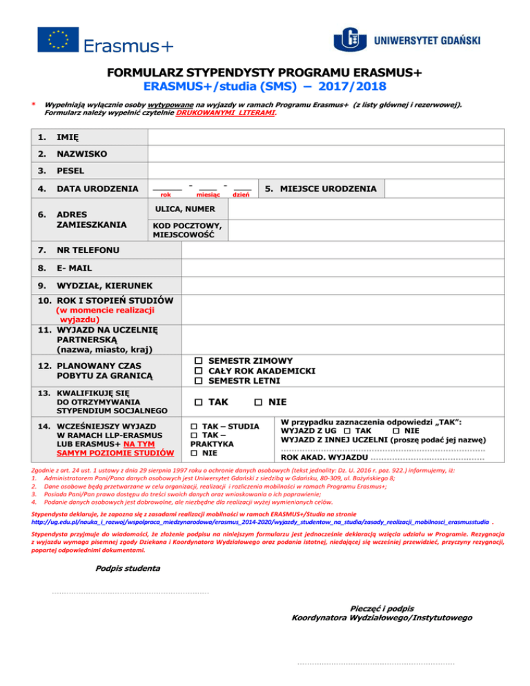 FORMULARZ STYPENDYSTY PROGRAMU ERASMUS+ ERASMUS+/studia (SMS) – 2017/2018 * Wypełniają wyłącznie osoby wytypowane na wyjazdy w ramach Programu Erasmus+ (z listy głównej i rezerwowej). Formularz należy wypełnić czytelnie DRUKOWANYMI LITERAMI. 1. IMIĘ 2. NAZWISKO 3. PESEL 4. DATA URODZENIA 6. ADRES ZAMIESZKANIA 7. NR TELEFONU 8. E- MAIL 9. WYDZIAŁ, KIERUNEK _____ - ___ - ___ rok miesiąc 5. MIEJSCE URODZENIA dzień ULICA, NUMER KOD POCZTOWY, MIEJSCOWOŚĆ 10. ROK I STOPIEŃ STUDIÓW (w momencie realizacji wyjazdu) 11. WYJAZD NA UCZELNIĘ PARTNERSKĄ (nazwa, miasto, kraj) 12. PLANOWANY CZAS POBYTU ZA GRANICĄ  SEMESTR ZIMOWY  CAŁY ROK AKADEMICKI  SEMESTR LETNI 13. KWALIFIKUJĘ SIĘ DO OTRZYMYWANIA STYPENDIUM SOCJALNEGO  TAK 14. WCZEŚNIEJSZY WYJAZD W RAMACH LLP-ERASMUS LUB ERASMUS+ NA TYM SAMYM POZIOMIE STUDIÓW  NIE  TAK – STUDIA  TAK – PRAKTYKA  NIE W przypadku zaznaczenia odpowiedzi „TAK”: WYJAZD Z UG  TAK  NIE WYJAZD Z INNEJ UCZELNI (proszę podać jej nazwę) …………………………………………..…….……………….. ROK AKAD. WYJAZDU …………………..………….……. Zgodnie z art. 24 ust. 1 ustawy z dnia 29 sierpnia 1997 roku o ochronie danych osobowych (tekst jednolity: Dz. U. 2016 r. poz. 922.) informujemy, iż: 1. Administratorem Pani/Pana danych osobowych jest Uniwersytet Gdański z siedzibą w Gdańsku, 80-309, ul. Bażyńskiego 8; 2. Dane osobowe będą przetwarzane w celu organizacji, realizacji i rozliczenia mobilności w ramach Programu Erasmus+; 3. Posiada Pani/Pan prawo dostępu do treści swoich danych oraz wnioskowania o ich poprawienie; 4. Podanie danych osobowych jest dobrowolne, ale niezbędne dla realizacji wyżej wymienionych celów. Stypendysta deklaruje, że zapozna się z zasadami realizacji mobilności w ramach ERASMUS+/Studia na stronie http://ug.edu.pl/nauka_i_rozwoj/wspolpraca_miedzynarodowa/erasmus_2014-2020/wyjazdy_studentow_na_studia/zasady_realizacji_mobilnosci_erasmusstudia . Stypendysta przyjmuje do wiadomości, że złożenie podpisu na niniejszym formularzu jest jednocześnie deklaracją wzięcia udziału w Programie. Rezygnacja z wyjazdu wymaga pisemnej zgody Dziekana i Koordynatora Wydziałowego oraz podania istotnej, niedającej się wcześniej przewidzieć, przyczyny rezygnacji, popartej odpowiednimi dokumentami. Podpis studenta ................................................................. Pieczęć i podpis Koordynatora Wydziałowego/Instytutowego .................................................................