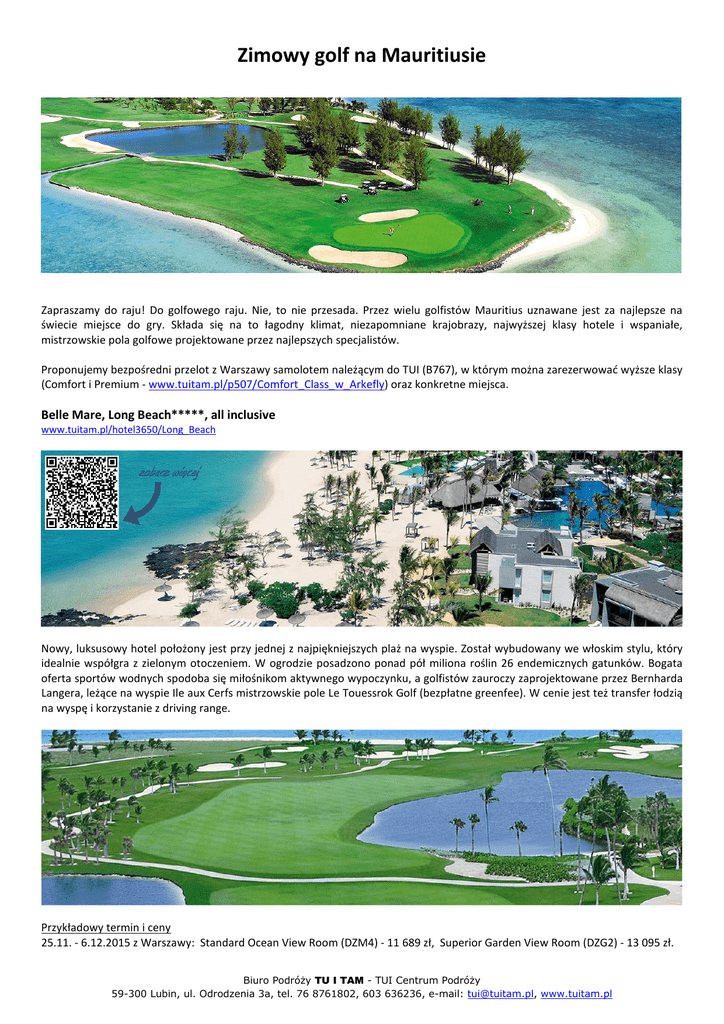 Zimowy golf na Mauritiusie Zapraszamy do raju! Do golfowego raju. Nie, to nie przesada. Przez wielu golfistów Mauritius uznawane jest za najlepsze na świecie miejsce do gry. Składa się na to łagodny klimat, niezapomniane krajobrazy, najwyższej klasy hotele i wspaniałe, mistrzowskie pola golfowe projektowane przez najlepszych specjalistów. Proponujemy bezpośredni przelot z Warszawy samolotem należącym do TUI (B767), w którym można zarezerwować wyższe klasy (Comfort i Premium - www.tuitam.pl/p507/Comfort_Class_w_Arkefly) oraz konkretne miejsca. Belle Mare, Long Beach*****, all inclusive www.tuitam.pl/hotel3650/Long_Beach Nowy, luksusowy hotel położony jest przy jednej z najpiękniejszych plaż na wyspie. Został wybudowany we włoskim stylu, który idealnie współgra z zielonym otoczeniem. W ogrodzie posadzono ponad pół miliona roślin 26 endemicznych gatunków. Bogata oferta sportów wodnych spodoba się miłośnikom aktywnego wypoczynku, a golfistów zauroczy zaprojektowane przez Bernharda Langera, leżące na wyspie Ile aux Cerfs mistrzowskie pole Le Touessrok Golf (bezpłatne greenfee). W cenie jest też transfer łodzią na wyspę i korzystanie z driving range. Przykładowy termin i ceny 25.11. - 6.12.2015 z Warszawy: Standard Ocean View Room (DZM4) - 11 689 zł, Superior Garden View Room (DZG2) - 13 095 zł. Biuro Podróży TU I TAM - TUI Centrum Podróży 59-300 Lubin, ul. Odrodzenia 3a, tel. 76 8761802, 603 636236, e-mail: [email protected], www.tuitam.pl Belle Mare, Belle Mare Plage*****, all inclusive www.tuitam.pl/hotel1992/Belle_Mare_Plage Ten luksusowy hotel z sieci Constance został uznany przez Międzynarodowe Zrzeszenie Organizatorów Turystyki Golfowej (IAGTO) za najlepszy resort golfowy na świecie. Oprócz wspaniałej lokalizacji przy białej, piaszczystej plaży, jego zaletą jest znakomita kuchnia, czego doświadczyć można w kilku restauracjach i barach. Osoby, które wykupiły opcję „all inclusive”, mogą bezpłatnie korzystać codziennie z dwóch 18-dołkowych, mistrzowskich pól - The Links i The Legend. Przykładowy termin i ceny 25.11. - 6.12.2015 z Warszawy: Prestige Room (DZX1) - 12 920 zł, Junior Suite (JSX1) - 14 156 zł. Ceny (za osobę w pokoju 2-osobowym) są kompletne i zawierają: • rabat 500 zł/os i dodatkowe 3% rabatu (First Minute do 28.05.2015), • wszystkie opłaty lotniskowe, serwisowe i paliwowe, • bezpośredni przelot tam i z powrotem, • transfer lotnisko-hotel-lotnisko, • zakwaterowanie w wybranym typie pokoju, • wyżywienie (all inclusive zgodnie z opisem), • codziennie greenfee na 18-dołkowe pole, korzystanie z DR, meleks, • gwarancję niezmienności ceny, • gwarancję najniższej ceny (jeśli w terminie późniejszym, także w ofercie „last minute”, cena spadnie, TUI zwróci różnicę), • ubezpieczenie NNW i KL (typ BOW - www.tuitam.pl/p19/podstawowe), • opiekę rezydenta TUI Service. Powyższe ceny aktualne są tylko do 28.05.2015 (promocja First Minute). Zaliczka wynosi jedynie 10% ceny. Hotele i przeloty dostępne są od 4.11.2015 do 31.03.2016. Chętnych zapraszamy do kontaktu mailowego lub telefonicznego. Na Państwa pytania i zgłoszenia czeka odpowiadający za ofertę golfową Krzysztof Raczkowiak. Biuro Podróży TU I TAM - TUI Centrum Podróży 59-300 Lubin, ul. Odrodzenia 3a, tel. 76 8761802, 603 636236, e-mail: [email protected], www.tuitam.pl