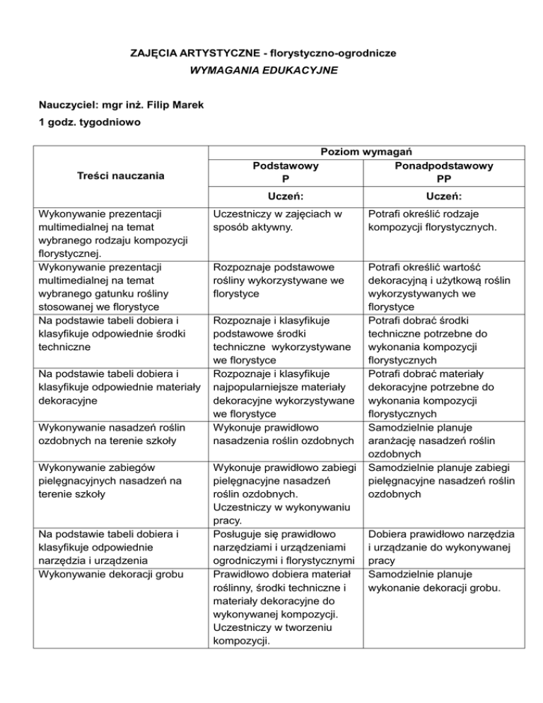 ZAJĘCIA ARTYSTYCZNE - florystyczno-ogrodnicze WYMAGANIA EDUKACYJNE Nauczyciel: mgr inż. Filip Marek 1 godz. tygodniowo Treści nauczania Poziom wymagań Podstawowy Ponadpodstawowy P PP Uczeń: Wykonywanie prezentacji multimedialnej na temat wybranego rodzaju kompozycji florystycznej. Wykonywanie prezentacji multimedialnej na temat wybranego gatunku rośliny stosowanej we florystyce Na podstawie tabeli dobiera i klasyfikuje odpowiednie środki techniczne Na podstawie tabeli dobiera i klasyfikuje odpowiednie materiały dekoracyjne Wykonywanie nasadzeń roślin ozdobnych na terenie szkoły Wykonywanie zabiegów pielęgnacyjnych nasadzeń na terenie szkoły Na podstawie tabeli dobiera i klasyfikuje odpowiednie narzędzia i urządzenia Wykonywanie dekoracji grobu Uczeń: Uczestniczy w zajęciach w sposób aktywny. Potrafi określić rodzaje kompozycji florystycznych. Rozpoznaje podstawowe rośliny wykorzystywane we florystyce Potrafi określić wartość dekoracyjną i użytkową roślin wykorzystywanych we florystyce Potrafi dobrać środki techniczne potrzebne do wykonania kompozycji florystycznych Potrafi dobrać materiały dekoracyjne potrzebne do wykonania kompozycji florystycznych Samodzielnie planuje aranżację nasadzeń roślin ozdobnych Samodzielnie planuje zabiegi pielęgnacyjne nasadzeń roślin ozdobnych Rozpoznaje i klasyfikuje podstawowe środki techniczne wykorzystywane we florystyce Rozpoznaje i klasyfikuje najpopularniejsze materiały dekoracyjne wykorzystywane we florystyce Wykonuje prawidłowo nasadzenia roślin ozdobnych Wykonuje prawidłowo zabiegi pielęgnacyjne nasadzeń roślin ozdobnych. Uczestniczy w wykonywaniu pracy. Posługuje się prawidłowo narzędziami i urządzeniami ogrodniczymi i florystycznymi Prawidłowo dobiera materiał roślinny, środki techniczne i materiały dekoracyjne do wykonywanej kompozycji. Uczestniczy w tworzeniu kompozycji. Dobiera prawidłowo narzędzia i urządzanie do wykonywanej pracy Samodzielnie planuje wykonanie dekoracji grobu. Wypełnienie przygotowanej tabeli charakteryzującej właściwości barw oraz ich symbolikę. Wskazywanie przykładów roślin. Artystyczne wycinanie dyni Wykonywanie wianków adwentowych. Wykonywanie choinek stylizowanych. Ozdobne pakowanie prezentów. Wykonywanie bukietu z okazji walentynek. Wykonywanie zabiegów pielęgnacyjnych nasadzeń na terenie szkoły. Wykonywanie kompozycji florystycznych na uroczyste zakończenie roku. Określa znaczenie symboliczne barw Charakteryzuje znaczenie barw w kształtowanym otoczeniu Prawidłowo dobiera materiał roślinny, środki techniczne i materiały dekoracyjne do wykonywanej kompozycji. Uczestniczy w tworzeniu kompozycji. Prawidłowo dobiera materiał roślinny, środki techniczne i materiały dekoracyjne do wykonywanej kompozycji. Uczestniczy w tworzeniu kompozycji. Prawidłowo dobiera materiał roślinny, środki techniczne i materiały dekoracyjne do wykonywanej kompozycji. Uczestniczy w tworzeniu kompozycji. Prawidłowo dobiera materiał roślinny, środki techniczne i materiały dekoracyjne do wykonywanej kompozycji. Uczestniczy w tworzeniu kompozycji. Prawidłowo dobiera materiał roślinny, środki techniczne i materiały dekoracyjne do wykonywanej kompozycji. Uczestniczy w tworzeniu kompozycji. Wykonuje prawidłowo zabiegi pielęgnacyjne nasadzeń roślin ozdobnych. Uczestniczy w wykonywaniu pracy. Prawidłowo dobiera materiał roślinny, środki techniczne i materiały dekoracyjne do wykonywanej kompozycji. Uczestniczy w tworzeniu kompozycji. Samodzielnie planuje wykonanie dekoracji dynii. Samodzielnie planuje wykonanie kompozycji. Samodzielnie planuje wykonanie kompozycji. Samodzielnie planuje wykonanie kompozycji. Samodzielnie planuje wykonanie kompozycji. Samodzielnie planuje zabiegi pielęgnacyjne nasadzeń roślin ozdobnych Samodzielnie planuje wykonanie kompozycji.