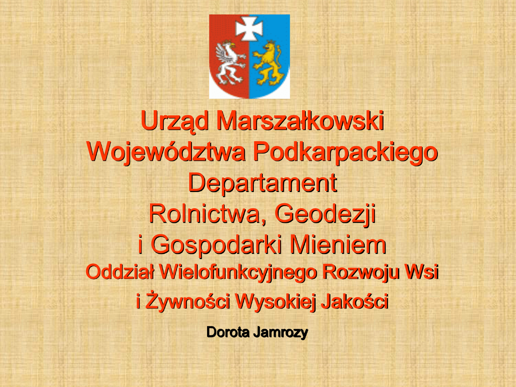 Urząd Marszałkowski Województwa Podkarpackiego Departament Rolnictwa, Geodezji i Gospodarki Mieniem Oddział Wielofunkcyjnego Rozwoju Wsi i Żywności Wysokiej Jakości Dorota Jamrozy Produkt Tradycyjny i Regionalny jako poszukiwany produkt rynkowy oraz szansa rozwoju gospodarstw rolnych W Polsce obszary wiejskie kojarzyły się zawsze z produkcją rolniczą Obecnie zmiany społeczno – gospodarcze spowodowały, że przestajemy patrzeć na polską wieś tylko poprzez pryzmat gospodarstw rolnych. Coraz częściej sytuacja rynkowa skłania rolników do poszukiwania dodatkowych źródeł dochodu lub do podjęcia dodatkowych działalności pozarolniczej Godną zainteresowania aktywnością gospodarczą jest wytwarzanie produktów tradycyjnych i regionalnych na potrzeby własne i na sprzedaż. Wytwarzanie i sprzedaż produktów nieprzetworzonych pochodzących z własnego gospodarstwa, nie wymaga rejestrowania działalności gospodarczej, jest to konieczne gdy rolnik zdecyduje na wytwarzanie i sprzedaż produktów przetworzonych Możliwości sprzedaży produktów Wytwarzane w sposób specyficzny produkty zyskują w Polsce i na świecie coraz większe uznanie i stale powiększające się grono nabywców. Na Polskim rynku produkty takie konsumenci nabywają dzięki sprzedaży bezpośredniej co stwarza możliwość lepszego promowania produktu. Żywność wysokiej jakości jak ją należy promować ? Twoja gmina miejscowość może pochwalić się bogactwem dziedzictwa kulinarnego regionu może to być kluczem do rozwoju lokalnego i stanowić element kampanii promocyjnej. Żywność wysokiej jakości można promować poprzez organizację między innymi: - Festynów i imprez targowych - Kontaktów z lokalnymi Kołami Gospodyń Wiejskich - Organizację Konkursów Kulinarnych - Organizację - cyklicznych miejsc sprzedaży bezpośredniej -Budowanie marki regionu w oparciu o produkt regionalny i tradycyjny -Wydawnictwa promocyjne - Ścieżki tematyczne łączące aspekt dziedzictwa kulturowego walorów krajobrazu Produkty regionalne integrują społeczność jak i aktywizują na rzecz wspólnych działań związanych z ich promocją. Sprzedaż tych produktów zazwyczaj dokonuje się na:. jarmarkach, targach, festynach kiermaszach, imprezach okolicznościowych. Produkty te coraz częściej możemy kupić w sprzedaży hurtowej i detalicznej, można je znaleźć na giełdach towarowych i wybranych delikatesach. Rezultaty działalności promocyjnej Samorządu Województwa Podkarpackiego Dzięki organizowanym w/w przedsięwzięciom coraz większym zainteresowaniem kupujących cieszą się produkty tradycyjne i regionalne. Dostrzega się potrzebę wpisywania unikatowych produktów na Listę Produktów Tradycyjnych, oraz rejestrowania ich jako oznaczenia unijne, widząc w tym korzyści zarówno dla Przedsiębiorców jak i Stowarzyszeń, Kół Gospodyń Wiejskich oraz osób fizycznych Rezultaty działalności promocyjnej Samorządu Województwa Podkarpackiego Aktualnie w systemie unijnym woj. Podkarpackie ma zarejestrowane 2 produkty regionalne, natomiast 183 produktów zarejestrowanych jest w systemie krajowym na Ministerialnej Liście Produktów Tradycyjnych. Atrakcje na pokaz Produkty tradycyjne i regionalne są produktami wysokiej jakości. Wytwarzane są przy wykorzystaniu specyficznych umiejętności i tradycyjnej technologii. Promocja i sprzedaż produktów regionalnych i tradycyjnych - podnosi atrakcyjność regionu - przyciąga turystów i inwestorów - poprawia jakość życia mieszkańców - daje szansę tworzenia nowych miejsc pracy Przedsięwzięcia realizowane przez Samorząd Województwa Podkarpackiego -Międzynarodowe Targi Żywności Ekologicznych „BIOFACH” w 11-14.02.2015 r. i Produktów Norymberdze, -Międzynarodowe Targi Produktów i Żywności Wysokiej Jakości „EKOGALA” w Rzeszowie, 29-31.05. 2015 r - Ogólnopolski konkurs pn. „ Mój Rynek - Mój Produkt” 16.05.2015 r Warszawa - Festiwal Podkarpackich 14.06.2015 r. - Smaków w Górnie Przedsięwzięcia realizowane przez Samorząd Województwa Podkarpackiego -Udział w Projekcie Komisji Europejskiej TRADEIT, 17-19.06 2015 r w Poznaniu Nasze Kulinarne Dziedzictwo – Smaki Regionów Boguchwała w dniu 21.06.2015 r „II Podkarpackie Smaki Myśliwskie”, w Lesku 2-3. 08.2015r. - Targi Rzemiosła i Przedsiębiorczości „ AGROBIESZCZADY”. - Międzynarodowe Targi Żywności POLAGRA FOOD w Poznaniu 21-24.09.2015 r. Dożynki Prezydenckie w Spale na przełomie września – października Dziękuję za uwagę kontakt. (17)74763-38