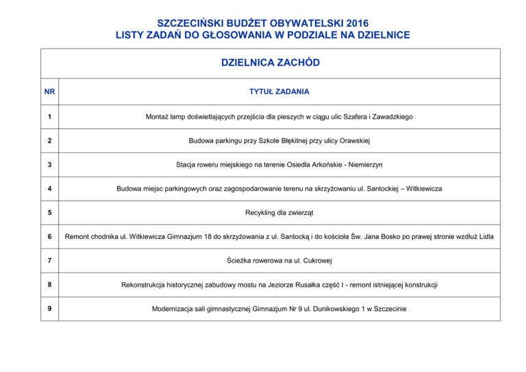 SZCZECIŃSKI BUDŻET OBYWATELSKI 2016 LISTY ZADAŃ DO GŁOSOWANIA W PODZIALE NA DZIELNICE DZIELNICA ZACHÓD NR TYTUŁ ZADANIA 1 Montaż lamp doświetlających przejścia dla pieszych w ciągu ulic Szafera i Zawadzkiego 2 Budowa parkingu przy Szkole Błękitnej przy ulicy Orawskiej 3 Stacja roweru miejskiego na terenie Osiedla Arkońskie - Niemierzyn 4 Budowa miejsc parkingowych oraz zagospodarowanie terenu na skrzyżowaniu ul. Santockiej – Witkiewicza 5 Recykling dla zwierząt 6 Remont chodnika ul. Witkiewicza Gimnazjum 18 do skrzyżowania z ul. Santocką i do kościoła Św. Jana Bosko po prawej stronie wzdłuż Lidla 7 Ścieżka rowerowa na ul. Cukrowej 8 Rekonstrukcja historycznej zabudowy mostu na Jeziorze Rusałka część I - remont istniejącej konstrukcji 9 Modernizacja sali gimnastycznej Gimnazjum Nr 9 ul. Dunikowskiego 1 w Szczecinie 10 Budowa dróg wraz z kanalizacją deszczową na Osiedlu Skarbówek etap I 11 Różanka - Arkonka - Głębokie. Zwiększenie bezpieczeństwa osób aktywnie korzystających ze ścieżki turystyczno - rekreacyjnej poprzez prawidłowe oznakowanie poz. i pion. 12 Zakup i montaż 20 tablic dynamicznej informacji pasażerskiej na przystankach autobusowych i tramwajowych dla Dzielnicy Zachód 13 Budowa świetlicy dla dzieci, domu seniora, placu zabaw, siłowni, wybiegu dla psów, ogólnodostępnych miejsc do grillowania i palenia ognisk oraz parku 14 Modernizacja budynku Biblioteki Publicznej - Filia Nr 38 przy ul. 26 Kwietnia 15 Budowa ogrodzonego placu zabaw w obszarze zieleni miejskiej przy ulicy Poronińskiej i Krakowskiej na Gumieńcach 16 Utworzenie strefy 30 w obrębie ulic Reymonta, Przybyszewskiego i Grzegorza z Sanoka na Pogodnie 17 Ogólnodostępna ścianka wspinaczkowa niewymagająca specjalistycznego sprzętu do asekuracji 18 Zagospodarowanie terenu działki nr 5 na Osiedlu Zawadzkiego – Klonowica 19 Mini wioska „Słowińców" - wersja dla dzieci 20 Szczeciński Rower Miejski - drugi etap 21 Wykonanie oświetlenia parku przy ul. Jagny - Boryny 22 Szczeciński Rower Miejski na Pomorzanach 23 Budowa mostu nad strumieniem Zielonka w Lasku Arkońskim 24 Modernizacja Placu im. Waleriana Pawłowskiego przy ulicy Brodzińskiego na Pogodnie 25 Rozbudowa Parku Przygodna 26 Zakup książek ekonomicznych do Filii Biblioteki Publicznej 27 Piesza rewolucja - poprawa warunków ruchu pieszych w dzielnicy Zachód na ulicach Taczaka, Derdowskiego, 26 Kwietnia, Santockiej, Ku Słońcu, Kupczyka 28 Szlak historyczno - przyrodniczy „Pogodny" Dzielnicy Zachód (Pogodno, Krzekowo - Bezrzecze, Zawadzkiego, Łękno) 29 Renowacja Parku im. F. Chopina 30 Oświetlenie na ul. Zbójnickiej, Harnasiów, Tynieckiej 31 Pływająca scena na uwięzi na Jeziorku Słonecznym 32 Remont drogi oraz wykonanie miejsc postojowych przy ul. Budziszyńskiej 35 - 36 33 Budowa placu zabaw w parku przy ulicy Budziszyńskiej 34 Ukwiećmy ulicę Kwiatową 35 Budwa placu zabaw - Park Arkoński. Zespół przyrodniczo krajobrazowy - Zespół Parków Kasprowicza i Arkoński 36 Skatepark na Pomorzanach 37 Doposażenie w infrastrukturę międzyosiedlowego parku rekreacyjnego przy ulicy Kutrzeby w Szczecinie 38 Boisko i teren rekreacyjno - sportowy dla mieszkańców Pomorzan 39 Budowa ścieżki rowerowej na ul. Szerokiej 40 Remont chodników przy ul. Różanej i ul. Łódzkiej 41 Ścieżka rowerowa do Osowa 42 Budowa boiska wielofunkcyjnego z kompleksem lekkoatletycznym przy Gimnazjum Nr 9 ul. Dunikowskiego 1 w Szczecinie 43 Bezpieczna ulica Mickiewicza 44 Budowa miejsca spotkań i wypoczynku przy ul. Dunikowskiego 45 Wykonanie parkingu samochodowego naprzeciw budynków ul. Szafera 128, 136, 138, 140 46 Budowa sygnalizacji świetlnej na skrzyżowaniu Ku Słońcu i Różana/Źródlana 47 Aleja zasłużonych portowców na stadionie miejskim 48 Wybieg dla psów Osiedle Zawadzkiego - Klonowica 49 Szczeciński treningowy plac zabaw 50 Otwarta siłownia na terenie Szkoły Podstawowej Nr 16 na Gumieńcach 51 Remont asfaltu na ulicy Budziszyńskiej Pomorzany 52 Przebudowa fragmentu kanalizacji deszczowej w ulicy Płockiej 53 Dokończenie wymiany chodnika przy ulicy Budziszyńskiej (odcinek od ul. Gnieźnieńskiej do ul. Włościańskiej) 54 Stacja roweru miejskiego na pętli Głębokie 55 Parking 2016 - nowe miejsce parkingowe w twojej dzielnicy - Zachód 56 Położenie nakładki asfaltowej na ul. Wiosny Ludów DZIELNICA PÓŁNOC NR TYTUŁ ZADANIA 57 Zakup książek ekonomicznych do Filii Biblioteki Publicznej 58 Utworzenie parkingu dla aut osobowych przy ul. Przyjaciół Żołnierza 59 Zakup i montaż 10 tablic dynamicznej informacji pasażerskiej na przystankach autobusowych i tramwajowych dla Dzielnicy Północ 60 Stanica wodniacka „WODNA" 61 Rewitalizacja stawów bliźniaczych przy ul. Studziennej 62 Park Kumaka - park edukacyjno - rekreacyjny przy ulicy Warcisława 63 Park rekreacyjno - sportowy w obrębie Warszewo - Żelechowa przy ul. Królewskiego 64 Piesza rewolucja - Wilcza, Przyjaciół Ronda, Sczanieckiej, Wszystkich Świętych, Obotrycka 65 Budowa sygnalizacji świetlnej skrzyżowanie Duńska - Złotowska 66 Wykonanie oświetlenia w części ul. M. Rapackiego - pomiędzy ul. Sosnową a Osiedlem Poziomkowym 67 Recykling dla zwierząt 68 Naprawa ul. Wkrzańskiej - poprawa nawierzchni - instalacja oświetlenia 69 Budowa Skate Parku dla młodzieży przy obiekcie sportowym MOSIR, przy ul. Nehringa, Osiedle Stołczyn 70 Chodnik jako bezpieczeństwo dla dzieci 71 Park Warszewo - Podbórz 72 Budowa placu zabaw na terenie nieczynnego kąpieliska Paprotka 73 Wykonanie oświetlenia ulicznego w ulicy Perłowej Dz. Nr 15/1; 15/2 Obr 3007 nad Odrą 74 Szczeciński Rower Miejski - drugi etap 75 Parking 2016 - nowe miejsce parkingowe w twojej dzielnicy - Północ 76 Stworzenie stref rekreacyjnych na Osiedlu Żelechowa 77 Zainstalowanie oświetlenia na słupach elektrycznych w rejonie ulic Ceglana, Miedziana, Bożeny (w sąsiedztwie Przedszkola Ekolandia oraz byłego kąpieliska Gontynka) 78 Miastec