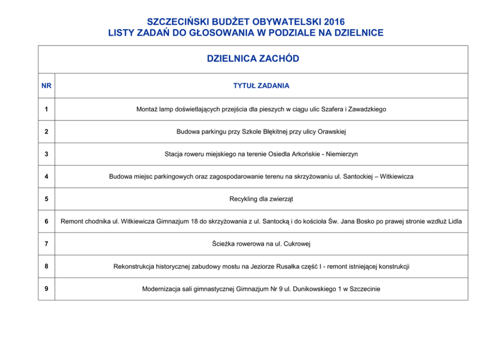 szczeciński budżet obywatelski 2016 listy zadań do głosowania w