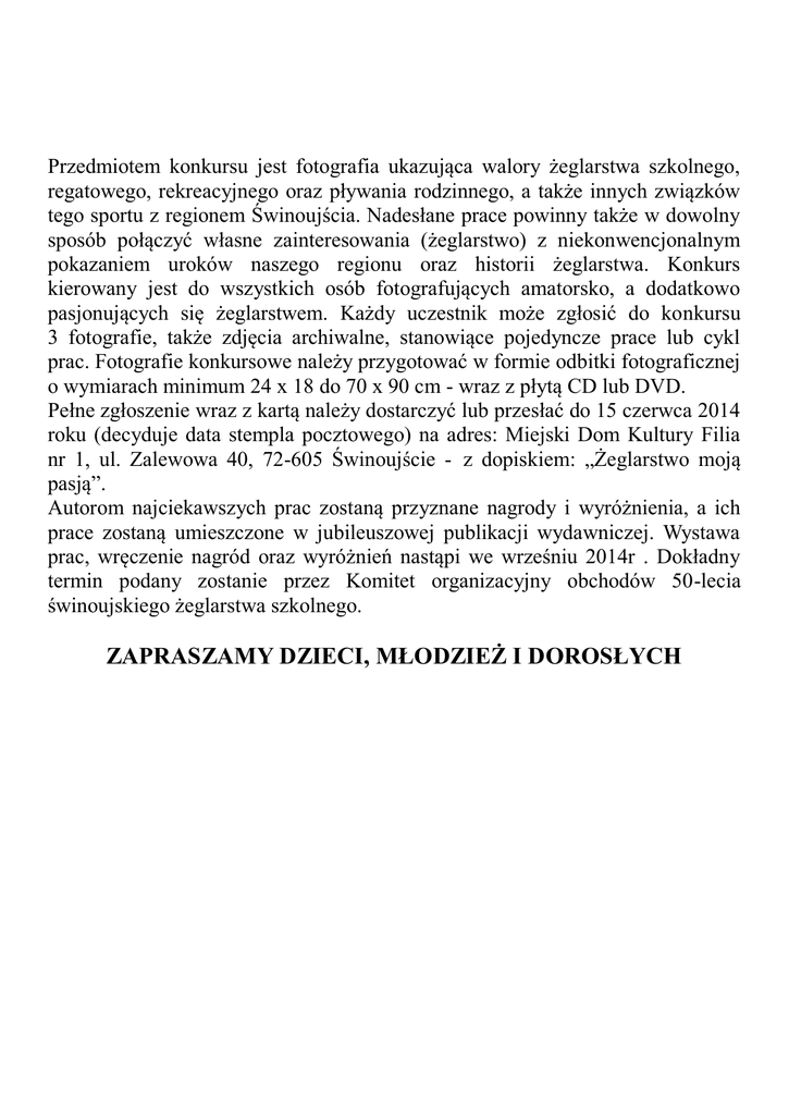 Przedmiotem konkursu jest fotografia ukazująca walory żeglarstwa szkolnego, regatowego, rekreacyjnego oraz pływania rodzinnego, a także innych związków tego sportu z regionem Świnoujścia. Nadesłane prace powinny także w dowolny sposób połączyć własne zainteresowania (żeglarstwo) z niekonwencjonalnym pokazaniem uroków naszego regionu oraz historii żeglarstwa. Konkurs kierowany jest do wszystkich osób fotografujących amatorsko, a dodatkowo pasjonujących się żeglarstwem. Każdy uczestnik może zgłosić do konkursu 3 fotografie, także zdjęcia archiwalne, stanowiące pojedyncze prace lub cykl prac. Fotografie konkursowe należy przygotować w formie odbitki fotograficznej o wymiarach minimum 24 x 18 do 70 x 90 cm - wraz z płytą CD lub DVD. Pełne zgłoszenie wraz z kartą należy dostarczyć lub przesłać do 15 czerwca 2014 roku (decyduje data stempla pocztowego) na adres: Miejski Dom Kultury Filia nr 1, ul. Zalewowa 40, 72-605 Świnoujście - z dopiskiem: „Żeglarstwo moją pasją”. Autorom najciekawszych prac zostaną przyznane nagrody i wyróżnienia, a ich prace zostaną umieszczone w jubileuszowej publikacji wydawniczej. Wystawa prac, wręczenie nagród oraz wyróżnień nastąpi we wrześniu 2014r . Dokładny termin podany zostanie przez Komitet organizacyjny obchodów 50-lecia świnoujskiego żeglarstwa szkolnego. ZAPRASZAMY DZIECI, MŁODZIEŻ I DOROSŁYCH REGULAMIN KONKURSU FOTOGRAFICZNEGO 50-LECIE ŚWINOUJSKIEGO ŻEGLARSTWA SZKOLNEGO 2014 „ŻEGLARSTWO MOJĄ PASJĄ” ZAŁOŻENIA KONKURSU 1. Zwrócenie uwagi na znaczenie żeglarstwa szkolnego i rekreacyjnego, ukazanie piękna naszego regionu oraz zarejestrowanie zmian zachodzących przez lata w dziedzinie żeglarstwa . 2. Możliwość zaprezentowania prac oraz konfrontacji z innymi uczestnikami konkursu oraz zamieszczenie najciekawszych zdjęć w jubileuszowej publikacji wydawniczej . REGULAMIN KONKURSU 1. W konkursie mogą wziąć udział wszyscy fotografujący amatorsko (bez ograniczeń wiekowych). 2. Każdy autor może nadesłać do 3 prac w formacie minimum 24x18 cm do 70x90cm wykonanych dowolną techniką, a także prace archiwalne związane z historią świnoujskiego żeglarstwa szkolnego. 3. Prace nagrodzone w innych konkursach nie mogą brać udziału w konkursie „Żeglarstwo moją pasją”. 4. Organizatorzy nie ponoszą odpowiedzialności za uszkodzenie prac lub ich zaginięcie w czasie przesyłki. 5. Każda praca musi być na odwrocie opisana: imię i nazwisko autora, adres i telefon kontaktowy. 6. Do przesyłki należy dołączyć prace w formie cyfrowej, CD lub DVD. Fotografie mogą być wykorzystane w celach rozpropagowania konkursu. 7. Terminarz konkursu: konkurs trwa od 15.04. do 30 czerwca 2014r.(data stempla pocztowego). Nadsyłanie prac do dnia 30 czerwca 2014 roku na adres: Miejski Dom Kultury Filia nr 1 72-605 Świnoujście , ul. Zalewowa 40. 8. Wystawa, wręczenie nagród oraz wyróżnień nastąpi w miesiącu wrześniu. Dokładny termin podany zostanie przez Komitet organizacyjny obchodów 50-lecia świnoujskiego żeglarstwa szkolnego. 9. Nagrody: I, II, III miejsce oraz wyróżnienia w kategoriach wiekowych dzieci do 12 lat, młodzież do 18 lat i dorośli. Jury przysługuje prawo innego podziału nagród. 10. Oceny prac dokona Jury powołane przez organizatora. 11. Organizatorzy nie zwracają otrzymanych prac na konkurs. 12. Nadesłanie prac na konkurs jest jednoznaczne z akceptacją niniejszego regulaminu. Organizator: Komitet Organizacyjny przy Zespole Szkół Morskich w Świnoujściu, ul. Jana Sołtana 2 tel. 91 321 62 87 Współorganizator: Miejski Dom Kultury w Świnoujściu filia nr 1 w Przytorze, ul. Zalewowa 40 tel. 91 322 17 27, e- mail: [email protected] Karta zgłoszenia NA KONKURS FOTOGRAFICZNY 50-LECIE ŚWINOUJSKIEGO ŻEGLARSTWA SZKOLNEGO 2014 „ŻEGLARSTWO MOJĄ PASJĄ” Imię i nazwisko:..................................................................................................................................... Adres zamieszkania:............................................................................................................................... Lp Tytuł pracy Ocena Jury Uwagi 1. 2. 3. Telefon kontaktowy:....................................................... e-mail:........................................................... Uwagi : „w”- prace zakwalifikowane na wystawę, „K”-zakwalifikowana do jubileuszowej książki Wyrażam zgodę na zachowanie i przetwarzanie moich danych osobowych zgodnie z ustawą z dnia 29 sierpnia 1997 r. o ochronie danych osobowych (Dz. U. z 2002 r. Nr 101, poz. 926 z późn. zm.). Poniższy podpis jest jednoznaczny z akceptacją warunków uczestnictwa w konkursie. ................................................... miejscowość i data ...................................................... podpis