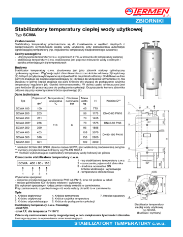WROCŁAW ZBIORNIKI Stabilizatory temperatury ciepłej wody użytkowej Typ SCWA Zastosowanie Stabilizatory temperatury przeznaczone są do instalowania w węzłach cieplnych z przepływowymi wymiennikami ciepłej wody użytkowej, przy zastosowaniu automatyki ograniczającej temperaturę (np. regulatorów temperatury bezpośredniego działania) Cechy szczególne - utrzymywanie temperatury c.w.u. w granicach ±1°C, w stosunku do temperatury zadanej - stabilizacja temperatury c.w.u. realizowana jest poprzez mieszanie wody o różnych i szybko zmieniających się temperaturach Budowa Stabilizator temperatury c.w.u. zbudowany jest jako zbiornik stalowy cylindryczny cynkowany ogniowo . W górnej części zbiornika umieszczono króciec wlotowy (1) i wylotowy (2), których przyłącza wykonywane są indywidualnie do potrzeb odbiorcy. Dodatkowo w dnie górnym znajduje się króciec odpowietrzający (3) i króciec do wkręcenia termometru (4). Na płaszczu w górnej części znajduje się para króćców (5) służąca do podłączenie czujnika temperatury regulatora jak również termomanometru. W dolnej części umieszczona jest para króćców (6) przeznaczona do podłączenia cyrkulacji. Oczyszczanie komory zbiornika odbywa się przy wykorzystaniu króćca spustowego (7). Dane techniczne H SCWA 100 100 45 775 SCWA 200 203 58 1175 SCWA 250 251 70 1405 SCWA 286* 286 79 1575 SCWA 350 350 95 1885 SCWA 400 403 105 2075 SCWA 500 510 150 2600 SCWA 600 601 190 3000 110 6 Króciec D** 1 D DN40-80 PN16 DN40-80 PN6 2 275 Pojemność Temperatura Ciśnienie Masa nominalna nominalne netto 3 dm °C bar kg 140 Typ G1” 5 550 * wielkość SCWA 286 DN80 (dawna nazwa SCWA) jest wielkością produkowaną seryjnie ** wymiary przyłączeniowe kołnierzy wg PN-EN 1092-1 *** możliwe wykonania jako stabilizatory temperatury wody lodowej lub glikolu 6 125 H DN40-150 PN16 G1¼” 1 2 3 4 Wykonanie specjalne: - kołnierze przyłączeniowe na ciśnienie PN6 lub PN16, inne niż podane w tabeli - króćce gwintowane G3” (króciec wlotowy i wylotowy). Dla wykonań specjalnych rodzaj zmian należy określić w zamówieniu. Przy zastosowaniu czynnika innego niż woda należy określić to w zamówieniu. 7 G2” 185 1 - typ stabilizatora temperatury c.w.u. 2 - oznaczenie pojemności zbiornika 3 - średnica nominalna DN króćca wlotowego i wylotowego 4 - temperatura obliczeniowa 350 3 G2” 390 450 SCWA 400 / 80 / 110 425 Oznaczenie stabilizatora temperatury c.w.u. G1” Opis 20o 1. Króciec dopływowy 4. Króciec termometru 5. Króćce czujnika temperatury 2. Króciec odpływowy 6. Króćce do podłączenia cyrkulacji 3. Króciec odpowietrzający Stabilizatory temperatury c.w.u. Posiadają: - atest PZH. - znak dla temperatur T>110°C 7. Króciec spustowy 4 150 Stabilizator temperatury ciepłej wody użytkowej typ SCWA (budowa i wymiary) Zaleca się zastosowanie anody magnetycznej w celu zwiększenia żywotności zbiornika. Zastrzega się prawo do wprowadzenia zmian konstrukcyjnych. STABILIZATORY TEMPERATURY c.w.u.