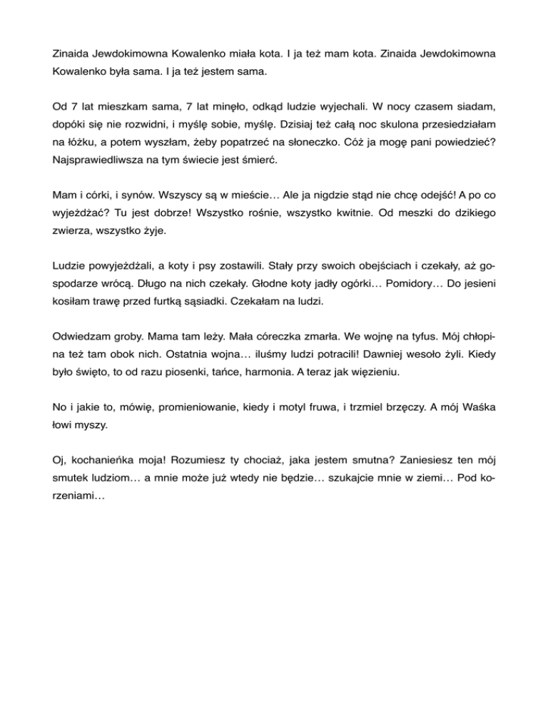 Zinaida Jewdokimowna Kowalenko miała kota. I ja też mam kota. Zinaida Jewdokimowna Kowalenko była sama. I ja też jestem sama. Od 7 lat mieszkam sama, 7 lat minęło, odkąd ludzie wyjechali. W nocy czasem siadam, dopóki się nie rozwidni, i myślę sobie, myślę. Dzisiaj też całą noc skulona przesiedziałam na łóżku, a potem wyszłam, żeby popatrzeć na słoneczko. Cóż ja mogę pani powiedzieć? Najsprawiedliwsza na tym świecie jest śmierć. Mam i córki, i synów. Wszyscy są w mieście… Ale ja nigdzie stąd nie chcę odejść! A po co wyjeżdżać? Tu jest dobrze! Wszystko rośnie, wszystko kwitnie. Od meszki do dzikiego zwierza, wszystko żyje. Ludzie powyjeżdżali, a koty i psy zostawili. Stały przy swoich obejściach i czekały, aż gospodarze wrócą. Długo na nich czekały. Głodne koty jadły ogórki… Pomidory… Do jesieni kosiłam trawę przed furtką sąsiadki. Czekałam na ludzi. Odwiedzam groby. Mama tam leży. Mała córeczka zmarła. We wojnę na tyfus. Mój chłopina też tam obok nich. Ostatnia wojna… iluśmy ludzi potracili! Dawniej wesoło żyli. Kiedy było święto, to od razu piosenki, tańce, harmonia. A teraz jak więzieniu. No i jakie to, mówię, promieniowanie, kiedy i motyl fruwa, i trzmiel brzęczy. A mój Waśka łowi myszy. Oj, kochanieńka moja! Rozumiesz ty chociaż, jaka jestem smutna? Zaniesiesz ten mój smutek ludziom… a mnie może już wtedy nie będzie… szukajcie mnie w ziemi… Pod korzeniami…