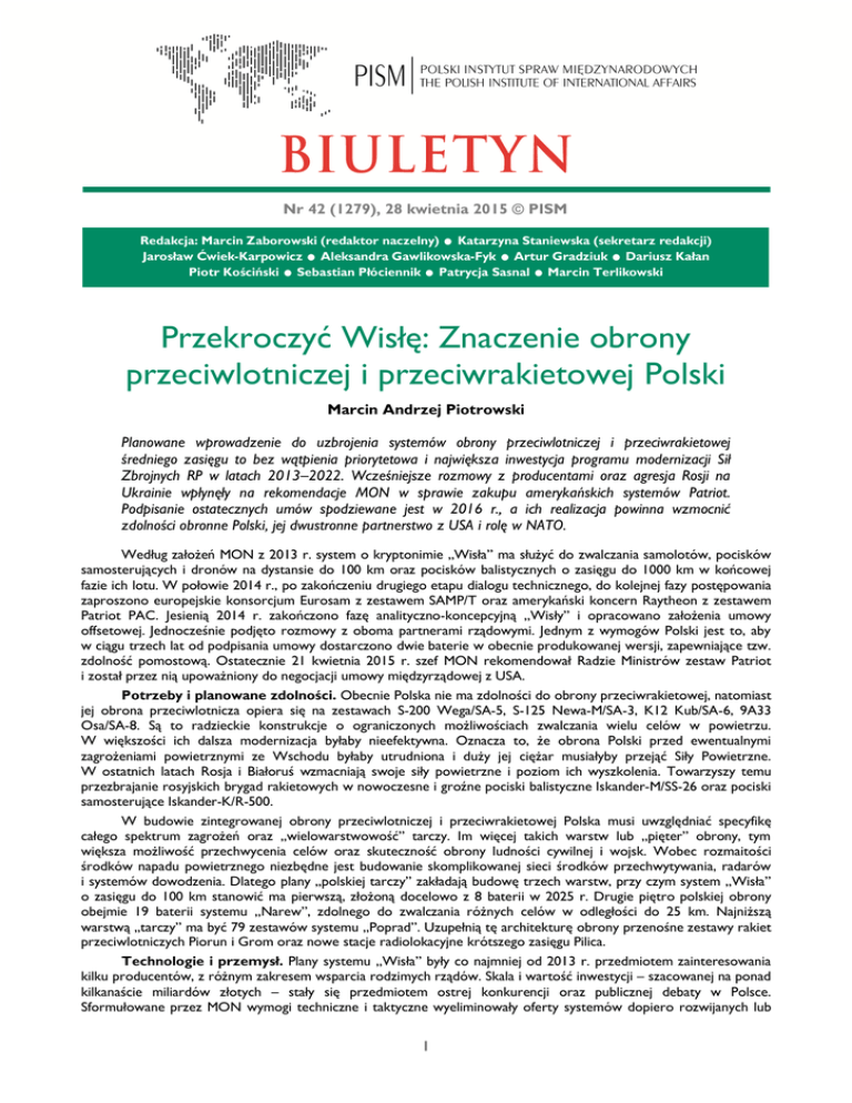 Nr 42 (1279), 28 kwietnia 2015 © PISM .. . . . . Redakcja: Marcin Zaborowski (redaktor naczelny) Katarzyna Staniewska (sekretarz redakcji) Jarosław Ćwiek-Karpowicz Aleksandra Gawlikowska-Fyk Artur Gradziuk Dariusz Kałan Piotr Kościński Sebastian Płóciennik Patrycja Sasnal Marcin Terlikowski . Przekroczyć Wisłę: Znaczenie obrony przeciwlotniczej i przeciwrakietowej Polski Marcin Andrzej Piotrowski Planowane wprowadzenie do uzbrojenia systemów obrony przeciwlotniczej i przeciwrakietowej średniego zasięgu to bez wątpienia priorytetowa i największa inwestycja programu modernizacji Sił Zbrojnych RP w latach 2013–2022. Wcześniejsze rozmowy z producentami oraz agresja Rosji na Ukrainie wpłynęły na rekomendacje MON w sprawie zakupu amerykańskich systemów Patriot. Podpisanie ostatecznych umów spodziewane jest w 2016 r., a ich realizacja powinna wzmocnić zdolności obronne Polski, jej dwustronne partnerstwo z USA i rolę w NATO. Według założeń MON z 2013 r. system o kryptonimie „Wisła” ma służyć do zwalczania samolotów, pocisków samosterujących i dronów na dystansie do 100 km oraz pocisków balistycznych o zasięgu do 1000 km w końcowej fazie ich lotu. W połowie 2014 r., po zakończeniu drugiego etapu dialogu technicznego, do kolejnej fazy postępowania zaproszono europejskie konsorcjum Eurosam z zestawem SAMP/T oraz amerykański koncern Raytheon z zestawem Patriot PAC. Jesienią 2014 r. zakończono fazę analityczno-koncepcyjną „Wisły” i opracowano założenia umowy offsetowej. Jednocześnie podjęto rozmowy z oboma partnerami rządowymi. Jednym z wymogów Polski jest to, aby w ciągu trzech lat od podpisania umowy dostarczono dwie baterie w obecnie produkowanej wersji, zapewniające tzw. zdolność pomostową. Ostatecznie 21 kwietnia 2015 r. szef MON rekomendował Radzie Ministrów zestaw Patriot i został przez nią upoważniony do negocjacji umowy międzyrządowej z USA. Potrzeby i planowane zdolności. Obecnie Polska nie ma zdolności do obrony przeciwrakietowej, natomiast jej obrona przeciwlotnicza opiera się na zestawach S-200 Wega/SA-5, S-125 Newa-M/SA-3, K12 Kub/SA-6, 9A33 Osa/SA-8. Są to radzieckie konstrukcje o ograniczonych możliwościach zwalczania wielu celów w powietrzu. W większości ich dalsza modernizacja byłaby nieefektywna. Oznacza to, że obrona Polski przed ewentualnymi zagrożeniami powietrznymi ze Wschodu byłaby utrudniona i duży jej ciężar musiałyby przejąć Siły Powietrzne. W ostatnich latach Rosja i Białoruś wzmacniają swoje siły powietrzne i poziom ich wyszkolenia. Towarzyszy temu przezbrajanie rosyjskich brygad rakietowych w nowoczesne i groźne pociski balistyczne Iskander-M/SS-26 oraz pociski samosterujące Iskander-K/R-500. W budowie zintegrowanej obrony przeciwlotniczej i przeciwrakietowej Polska musi uwzględniać specyfikę całego spektrum zagrożeń oraz ,,wielowarstwowość” tarczy. Im więcej takich warstw lub „pięter” obrony, tym większa możliwość przechwycenia celów oraz skuteczność obrony ludności cywilnej i wojsk. Wobec rozmaitości środków napadu powietrznego niezbędne jest budowanie skomplikowanej sieci środków przechwytywania, radarów i systemów dowodzenia. Dlatego plany ,,polskiej tarczy” zakładają budowę trzech warstw, przy czym system „Wisła” o zasięgu do 100 km stanowić ma pierwszą, złożoną docelowo z 8 baterii w 2025 r. Drugie piętro polskiej obrony obejmie 19 baterii systemu „Narew”, zdolnego do zwalczania różnych celów w odległości do 25 km. Najniższą warstwą ,,tarczy” ma być 79 zestawów systemu „Poprad”. Uzupełnią tę architekturę obrony przenośne zestawy rakiet przeciwlotniczych Piorun i Grom oraz nowe stacje radiolokacyjne krótszego zasięgu Pilica. Technologie i przemysł. Plany systemu „Wisła” były co najmniej od 2013 r. przedmiotem zainteresowania kilku producentów, z różnym zakresem wsparcia rodzimych rządów. Skala i wartość inwestycji – szacowanej na ponad kilkanaście miliardów złotych – stały się przedmiotem ostrej konkurencji oraz publicznej debaty w Polsce. Sformułowane przez MON wymogi techniczne i taktyczne wyeliminowały oferty systemów dopiero rozwijanych lub 1 będących poza uzbrojeniem NATO, jak izraelski David’s Sling czy międzynarodowy MEADS. Przewaga zestawów Patriot polega na tym, że są poddawane systematycznej modernizacji oraz użytkowane przez 13 państw, a Siły Lądowe USA zamierzają je wykorzystywać do 2048 r. W dalszych negocjacjach istotnym kryterium dla Polski będą warunki umowy offsetowej. Według założeń MON udział polskich podmiotów w rozwoju i produkcji docelowych zestawów Patriot (wersja Next Gen) będzie sięgał 50% wartości kontraktu. W myśl deklaracji Raytheona w Polsce mają się odbywać produkcja i serwisowanie pocisku PAC-2 GEM-T, produkcja podzespołów pocisku PAC-3 MSE, mobilnych podwozi dla ich wyrzutni, jak również nowych modeli radarów dookólnych (360°). Oznaczałoby to udział polskich firm w dostawach nie tylko na potrzeby Polski, lecz także dla globalnej sieci oraz rozwoju innych systemów, jakie koncern ten może wytwarzać. Kooperacja ta powinna z czasem zwiększać samowystarczalność produkcyjną, technologiczną i rozwojową Polski w dziedzinie radarów, pocisków przechwytujących oraz innych rodzajów pocisków i rakiet. Partnerstwo strategiczne z USA. Bardzo ważnym aspektem negocjacji w sprawie pozyskania zestawów Patriot będzie przejście od tych czysto komercyjnych do międzyrządowych polsko-amerykańskich, które mają zakończyć się w drugiej połowie 2016 r. Zwiększa to transparentność kolejnych etapów oraz angażuje administrację USA w negocjacje z producentem. W ten sposób USA staną się prawnym gwarantem dostaw sprzętu i ochrony wrażliwych informacji. Zawarciu umowy z rządem USA będzie towarzyszyła umowa offsetowa między Polską a Raytheonem. Takie rozwiązania służyć powinny g