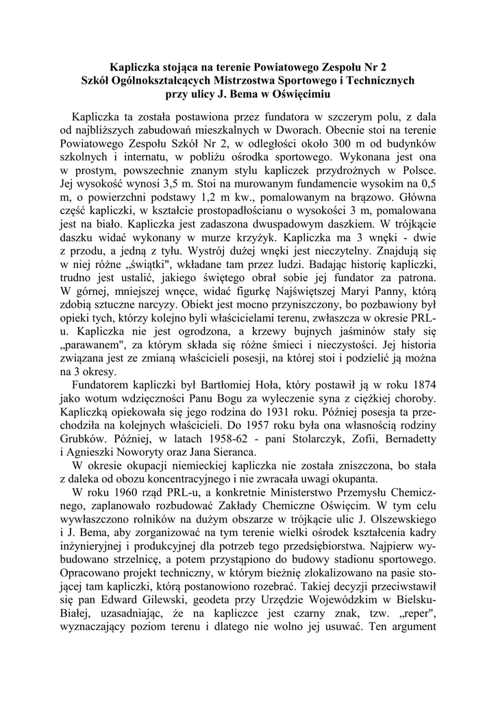 Kapliczka stojąca na terenie Powiatowego Zespołu Nr 2 Szkół Ogólnokształcących Mistrzostwa Sportowego i Technicznych przy ulicy J. Bema w Oświęcimiu Kapliczka ta została postawiona przez fundatora w szczerym polu, z dala od najbliższych zabudowań mieszkalnych w Dworach. Obecnie stoi na terenie Powiatowego Zespołu Szkół Nr 2, w odległości około 300 m od budynków szkolnych i internatu, w pobliżu ośrodka sportowego. Wykonana jest ona w prostym, powszechnie znanym stylu kapliczek przydrożnych w Polsce. Jej wysokość wynosi 3,5 m. Stoi na murowanym fundamencie wysokim na 0,5 m, o powierzchni podstawy 1,2 m kw., pomalowanym na brązowo. Główna część kapliczki, w kształcie prostopadłościanu o wysokości 3 m, pomalowana jest na biało. Kapliczka jest zadaszona dwuspadowym daszkiem. W trójkącie daszku widać wykonany w murze krzyżyk. Kapliczka ma 3 wnęki - dwie z przodu, a jedną z tyłu. Wystrój dużej wnęki jest nieczytelny. Znajdują się w niej różne „świątki", wkładane tam przez ludzi. Badając historię kapliczki, trudno jest ustalić, jakiego świętego obrał sobie jej fundator za patrona. W górnej, mniejszej wnęce, widać figurkę Najświętszej Maryi Panny, którą zdobią sztuczne narcyzy. Obiekt jest mocno przyniszczony, bo pozbawiony był opieki tych, którzy kolejno byli właścicielami terenu, zwłaszcza w okresie PRLu. Kapliczka nie jest ogrodzona, a krzewy bujnych jaśminów stały się „parawanem", za którym składa się różne śmieci i nieczystości. Jej historia związana jest ze zmianą właścicieli posesji, na której stoi i podzielić ją można na 3 okresy. Fundatorem kapliczki był Bartłomiej Hoła, który postawił ją w roku 1874 jako wotum wdzięczności Panu Bogu za wyleczenie syna z ciężkiej choroby. Kapliczką opiekowała się jego rodzina do 1931 roku. Później posesja ta przechodziła na kolejnych właścicieli. Do 1957 roku była ona własnością rodziny Grubków. Później, w latach 1958-62 - pani Stolarczyk, Zofii, Bernadetty i Agnieszki Noworyty oraz Jana Sieranca. W okresie okupacji niemieckiej kapliczka nie została zniszczona, bo stała z daleka od obozu koncentracyjnego i nie zwracała uwagi okupanta. W roku 1960 rząd PRL-u, a konkretnie Ministerstwo Przemysłu Chemicznego, zaplanowało rozbudować Zakłady Chemiczne Oświęcim. W tym celu wywłaszczono rolników na dużym obszarze w trójkącie ulic J. Olszewskiego i J. Bema, aby zorganizować na tym terenie wielki ośrodek kształcenia kadry inżynieryjnej i produkcyjnej dla potrzeb tego przedsiębiorstwa. Najpierw wybudowano strzelnicę, a potem przystąpiono do budowy stadionu sportowego. Opracowano projekt techniczny, w którym bieżnię zlokalizowano na pasie stojącej tam kapliczki, którą postanowiono rozebrać. Takiej decyzji przeciwstawił się pan Edward Gilewski, geodeta przy Urzędzie Wojewódzkim w BielskuBiałej, uzasadniając, że na kapliczce jest czarny znak, tzw. „reper", wyznaczający poziom terenu i dlatego nie wolno jej usuwać. Ten argument ocalił ją od zniszczenia. Bieżnię przesunięto nieco dalej, bliżej boiska sportowego. Mimo uratowania kapliczki, pozostawała ona bez opieki ze strony ZChO i dyrekcji Technikum Chemicznego jako bezpośredniego gospodarza terenu. Wszak było to w czasach, gdy z sal szkolnych usunięto nawet krzyże. Stan kapliczki pogarszał się z roku na rok. W 1978 roku ktoś pokrył ją nową dachówką, ale niefachowo. W tym okresie zabytkiem opiekowali się - w miarę swoich możliwości - panowie Janusz Grobelny i Knap oraz p. Maria Gabryś. Mimo wszystko pamiętano o niej, choć nie było mowy o organizowaniu przy niej nabożeństw majowych. Dalsze dzieje kapliczki wyznaczyła decyzja władz centralnych PRL-u o przeniesieniu „wielkiej chemii" z Oświęcimia do Polic oraz wielki ruch patriotyczny „Solidarność”. W tym okresie zabytek nieco odnowiono. Niezbędne prace wykonali pp. Janusz Grobelny i Józef Kluska, a potrzebny materiał dostarczył ks. kanonik Stanisław Górny. W tym okresie był} już organizowane - choć sporadycznie - nabożeństwa majowe, a od 1996 roku juz regularnie w każdą sobotę wieczorem. Do organizowania tych nabożeństw włączali młodzież szkolną katecheci z parafii św. Maksymiliana przy współudziale zespołów Żywego Różańca i Najświętszej Maryi Panny Patronki Dobrej Śmierć W 1995 roku teren szkolny Technikum Chemicznego przeszedł w administrację Firmy Chemicznej „Dwory” S.A., w związku z restrukturyzacją ZChO. W roku 1996 Firma przekazała teren szkolny i wszystkie budynki z internatem aktem notarialnym darowizny na rzecz Skarbu Państwa i Kuratorium Oświaty w Bielsku-Białej. Teren ten przejął w administrację Powiat, a Zespół Szkół Nr 2 - Kuratorium. Dyrektorem tego Zespołu został mgr inż. Piotr Kućka. Pojawiła się nadzieja odrestaurowania zniszczonej kapliczki. W tym celu przeprowadzono rozmowę z dyrektorem Zespołu w 2000 roku, któremu przedstawiono stan techniczny tego obiektu. Zaproponowano wykonanie niezbędnych prac. Wystrój wnęk powierzono ks. katechecie Piotrowi Homlowi. Podczas rozmowy wręczono panu dyrektorowi - na jego życzenie - zdjęcie kapliczki. Pan dyrektor przychylnie ustosunkował się do propozycji jej odnowienia i można było mieć nadzieję, że stanie się to do maja 2001 roku, aby mogły się odbywać przed nią - jak dawniej -nabożeństwa majowe z udziałem młodzieży i mieszkańców Osiedla Chemików. Do prac nad odrestaurowaniem kapliczki i uporządkowania terenu wokół niej przystąpiono jednak dopiero w dniach 23-25.04.2002 roku. Kapliczkę odnowiono i stała się ona symbolem triumfu nad ponurymi czasami PRL-u. Poświęcenie jej wyznaczono na dzień 26.04.2002 roku, łącząc tę uroczystość szkolną z apelem pożegnalnym klas czwartych Liceum Ogólnokształcącego. Po zakończeniu tej części programu, wszyscy zebrani: dyrekcja szkoły, grono pedagogiczne, młodzież i zapros
