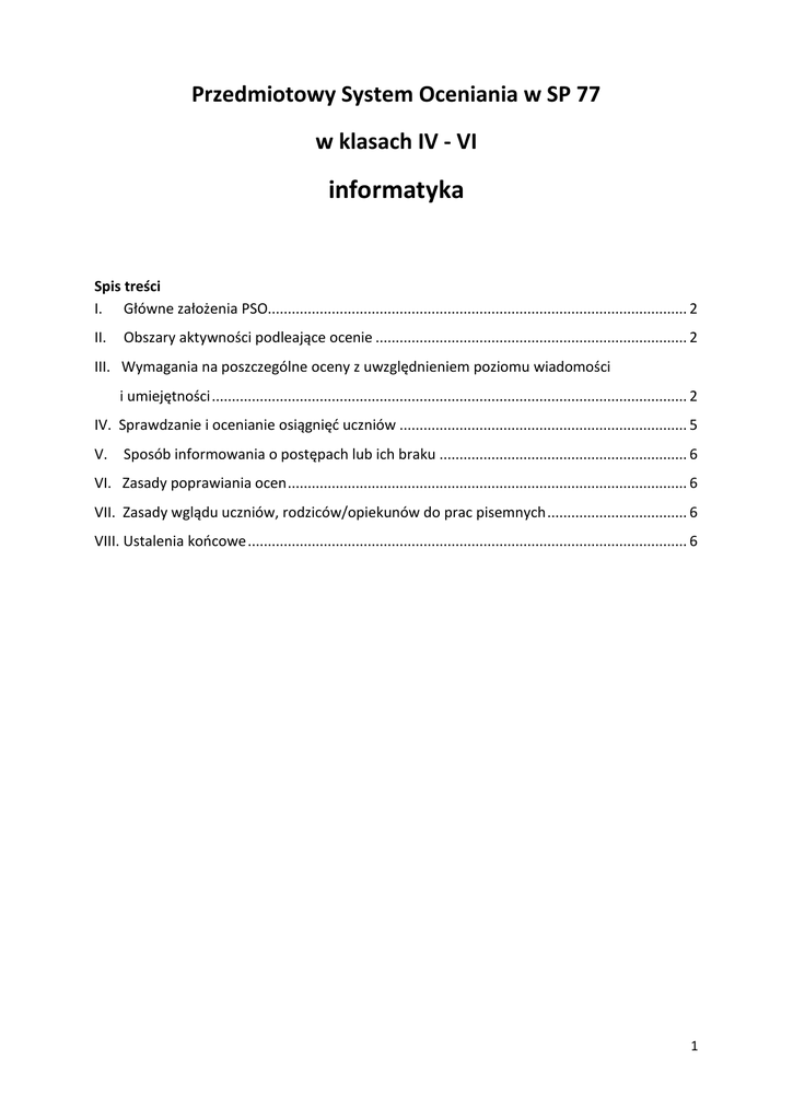 Przedmiotowy System Oceniania w SP 77 w klasach IV - VI informatyka Spis treści I. Główne założenia PSO......................................................................................................... 2 II. Obszary aktywności podleające ocenie .............................................................................. 2 III. Wymagania na poszczególne oceny z uwzględnieniem poziomu wiadomości i umiejętności ....................................................................................................................... 2 IV. Sprawdzanie i ocenianie osiągnięć uczniów ........................................................................ 5 V. Sposób informowania o postępach lub ich braku .............................................................. 6 VI. Zasady poprawiania ocen .................................................................................................... 6 VII. Zasady wglądu uczniów, rodziców/opiekunów do prac pisemnych ................................... 6 VIII. Ustalenia końcowe .............................................................................................................. 6 1 I. Główne założenia PSO Celem oceniania na lekcjach informatyki jest bieżące, okresowe, roczne rozpoznanie i określenie poziomu opanowania kompetencji przewidzianych programem nauczania. W pierwszym tygodniu każdego roku szkolnego uczniowie i ich rodzice zostają zapoznani z zasadami i kryteriami oceniania na lekcjach informatyki. Ten fakt jest odnotowywany w dzienniku lekcyjnym i zeszycie przedmiotowym ucznia, a następnie potwierdzony podpisami uczniów i rodziców. Ocena umiejętności i wiadomości edukacyjnych uczniów dokonywana jest systematycznie i sprawiedliwie. II. Obszary aktywności podlegające ocenie - III. przygotowanie stanowiska komputerowego do pracy według zasad bezpieczeństwa i higieny pracy; organizacja pracy; praca z programem – stosowanie odpowiednich metod, sposobów wykonania i osiąganie przewidzianych rezultatów; rozwiązywanie problemów – dobór właściwego narzędzia oraz dostosowanie środowiska programu do rozwiązywanego zadania; stosowanie wiedzy przedmiotowej w sytuacjach praktycznych; aktywność na lekcjach i zajęciach pozalekcyjnych, np. udział w konkursach przedmiotowych itp.; współpraca w grupie; wkład pracy ucznia; stopień i rodzaj motywacji uczenia się; posługiwanie się w opisie pojęć, środków, narzędzi i metod informatyki prawidłową terminologią informatyczną. Wymagania na poszczególne oceny z uwzględnieniem poziomu wiadomości i umiejętności Ocena celująca: Uczeń otrzymuje ocenę celującą, jeśli jego wiedza i umiejętności wykraczają poza obowiązujący program nauczania: - twórczo i samodzielnie wykonuje wszystkie zadania przewidziane programem oraz wykazuje - operatywność w wykorzystywaniu wiadomości i umiejętności do rozwiązywania zadań trudnych, - w nowych sytuacjach; - rozwija zainteresowania i uzdolnienia, samodzielnie formułuje wnioski, które potrafi uzasadnić; 2 - jest zaangażowany emocjonalnie w pracę klasy, grupy, bardzo aktywny i odpowiedzialny, motywuje kolegów do pokonywania trudności, szanuje pracę innych; przygotowuje dodatkowe informacje na zajęcia; wykorzystuje z własnej inicjatywy umiejętności informatyczne na innych lekcjach; bierze udział w konkursach komputerowych i osiąga w nich sukcesy; przestrzega zasad regulaminu pracowni komputerowej. Ocena bardzo dobra: Uczeń otrzymuje ocenę bardzo dobrą, jeśli opanował zakres wiadomości oraz poniższe umiejętności: - sprawnie rozpoczyna i kończy pracę z komputerem; - samodzielnie uruchamia programy, których ikony znajdują się na pulpicie; - zmienia wielkość okna, przesuwa ruchome obiekty na ekranie; - kreśli linie, wypełnia kontury kolorem, wstawia gotowe figury geometryczne i stemple; - zapisuje i odczytuje kartkę w komputerze; - znajduje gotowy rysunek w komputerze i poprawia go; - zapisuje ponownie pod tą samą nazwą lub inną; - wpisuje tekst z zachowaniem zasad poprawnego wpisywania tekstu; - redaguje i formatuje tekst według podanego wzoru; - umieszcza gotowe rysunki i teksty na jednej kartce; - samodzielnie wypełnia komórki arkusza liczbami i napisami, dokonuje zmian w arkuszu; - stosuje wbudowane w arkusz operacje i wpisując je w postaci formuły; - tworzy wykresy dla danych z tabeli; - bezbłędnie wyszczególnia elementy zestawu komputerowego; - podaje przykłady urządzeń opartych na technice komputerowej; - wie, co oznacza pojęcie multimedia, samodzielnie korzysta z informacji zawartych w programach - multimedialnych; - posługuje się programem komputerowym do wysyłania i odbierania wiadomości; - samodzielnie przygotowuje swoje prace do prezentacji; - przestrzega zasad regulaminu pracowni komputerowej. Ocena dobra: Uczeń otrzymuje ocenę dobrą, jeśli nie opanował całkowicie zakresu wiadomości oraz poniższych umiejętności: - samodzielnie rozpoczyna i kończy pracę z komputerem; - uruchamia programy, których ikony znajdują się na pulpicie; 3 - zmienia wielkość okna, przesuwa ruchome obiekty na ekranie; kreśli linie, wypełnia kontury kolorem, wstawia gotowe figury geometryczne i stemple; z niewielką pomocą zapisuje i odczytuje kartkę w komputerze; poprawia gotowy rysunek i zapisuje go; wpisuje tekst na komputerową kartkę z zachowaniem zasad poprawnego wpisywania tekstu; wykonuje operacje formatowania tekstu: wyrównywanie tekstu, zmiana rodzajów czcionki i jej atrybutów; z niewielką pomocą umieszcza na jednej kartce rysunki i teksty; zna elementy zestawu komputerowego; umie podać przykłady urządzeń opartych na technice komputerowej; wie, co oznacza pojęcie multimedia; z niewielką pomocą korzysta z informacji zawartych w programach multimedialnych; umie wysyłać i odbierać wiadomości; po odpowiednim instruktażu nauczyciela przygotowuje swoje prace do prezentacji; wypełnia komórki arkusza licz