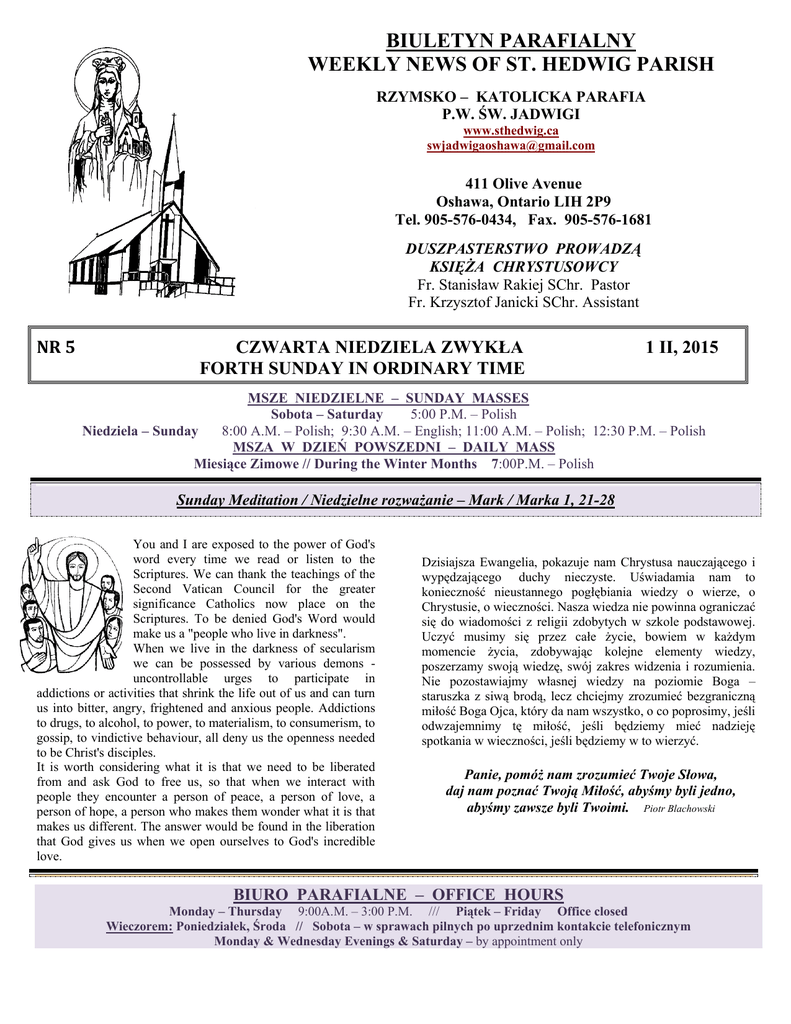BIULETYN PARAFIALNY WEEKLY NEWS OF ST. HEDWIG PARISH RZYMSKO – KATOLICKA PARAFIA P.W. ŚW. JADWIGI www.sthedwig.ca [email protected] 411 Olive Avenue Oshawa, Ontario LIH 2P9 Tel. 905-576-0434, Fax. 905-576-1681 DUSZPASTERSTWO PROWADZĄ KSIĘŻA CHRYSTUSOWCY Fr. Stanisław Rakiej SChr. Pastor Fr. Krzysztof Janicki SChr. Assistant NR 5 CZWARTA NIEDZIELA ZWYKŁA FORTH SUNDAY IN ORDINARY TIME 1 II, 2015 MSZE NIEDZIELNE – SUNDAY MASSES Sobota – Saturday 5:00 P.M. – Polish Niedziela – Sunday 8:00 A.M. – Polish; 9:30 A.M. – English; 11:00 A.M. – Polish; 12:30 P.M. – Polish MSZA W DZIEŃ POWSZEDNI – DAILY MASS Miesiące Zimowe // During the Winter Months 7:00P.M. – Polish Sunday Meditation / Niedzielne rozważanie – Mark / Marka 1, 21-28 You and I are exposed to the power of God's word every time we read or listen to the Scriptures. We can thank the teachings of the Second Vatican Council for the greater significance Catholics now place on the Scriptures. To be denied God's Word would make us a "people who live in darkness". When we live in the darkness of secularism we can be possessed by various demons uncontrollable urges to participate in addictions or activities that shrink the life out of us and can turn us into bitter, angry, frightened and anxious people. Addictions to drugs, to alcohol, to power, to materialism, to consumerism, to gossip, to vindictive behaviour, all deny us the openness needed to be Christ's disciples. It is worth considering what it is that we need to be liberated from and ask God to free us, so that when we interact with people they encounter a person of peace, a person of love, a person of hope, a person who makes them wonder what it is that makes us different. The answer would be found in the liberation that God gives us when we open ourselves to God's incredible love. Dzisiajsza Ewangelia, pokazuje nam Chrystusa nauczającego i wypędzającego duchy nieczyste. Uświadamia nam to konieczność nieustannego pogłębiania wiedzy o wierze, o Chrystusie, o wieczności. Nasza wiedza nie powinna ograniczać się do wiadomości z religii zdobytych w szkole podstawowej. Uczyć musimy się przez całe życie, bowiem w każdym momencie życia, zdobywając kolejne elementy wiedzy, poszerzamy swoją wiedzę, swój zakres widzenia i rozumienia. Nie pozostawiajmy własnej wiedzy na poziomie Boga – staruszka z siwą brodą, lecz chciejmy zrozumieć bezgraniczną miłość Boga Ojca, który da nam wszystko, o co poprosimy, jeśli odwzajemnimy tę miłość, jeśli będziemy mieć nadzieję spotkania w wieczności, jeśli będziemy w to wierzyć. Panie, pomóż nam zrozumieć Twoje Słowa, daj nam poznać Twoją Miłość, abyśmy byli jedno, abyśmy zawsze byli Twoimi. Piotr Blachowski BIURO PARAFIALNE – OFFICE HOURS Monday – Thursday 9:00A.M. – 3:00 P.M. /// Piątek – Friday Office closed Wieczorem: Poniedziałek, Środa // Sobota – w sprawach pilnych po uprzednim kontakcie telefonicznym Monday & Wednesday Evenings & Saturday – by appointment only INTENCJE MSZALNE - MASS INTENTIONS JANUARY / STYCZEŃ 31, SATURDAY – SOBOTA ~~św. Jana Bosko~ Fuel Collection 5:00PM O Boże błogosławieństwo i światło Ducha św. dla Łukasza z okazji urodzin – Rodzice i Brat FEBRUARY/ LUTY 1, SUNDAY – NIEDZIELA Fuel Collection 8:00AM †† Maria i Adolf Felsztyński – Córka z Rodziną 9:30AM †† Harold & Rita Tindale – Son with Family 11:00AM †† Bogusława i Bronisław Zubrzycki – Rodzina Gardziński 12:30PM Dziękczynna za 40 lat małżeństwa Barbary i Andrzeja Buchner, z prośbą o dalsze łaski i Boże błogosławieństwo Po ostatniej Mszy św. zapraszamy do naszej Kawiarenki February/ Luty 2, Monday – Poniedziałek ~The Presentation Of The Lord ~ Ofiarowanie Pańskie~ 11:00AM W intencji osób konsekrowanych, łaskę trwania i wierność powołaniu 7:00PM †† Maria i Stefan Rogoziński – Córka February/ Luty 3, Tuesday – Wtorek ~Św. Błażeja // błogosławieństwo gardła~ 11:00AM † Alfreda Pieciul – Ann S. 7:00PM O zdrowie dla Leny i Mamy Jolanty – Rodzina Matusiak February/ Luty 4, Wednesday – Środa 7:00PM †† Antoni, Stefania i Mikołaj Urbanowicz – Z. Urbanowicz 7:00PM Intencja wolna February/ Luty 5, Thursday – Czwartek ~Św. Agaty // poświęcenie chleba~ 7:00PM †† Stanisław, Józef i Eugeniusz oraz zmarłych z Rodziny Rejczak – A. Sydor 7:00PM Intencja wolna Uwaga: Na Matki Bożej Gromnicznej Przynosimy do Kościoła Gromnice February/ Luty 6, First Friday – Pierwszy Piątek ~Św. Męczenników Pawła Miki i Towarzyszy~ 8:00AM O Boże błogosławieństwo dla Mariusza w Nowym Roku – Mama 7:00PM Dziękczynna, z prośbą o dalsze Boże błogosławieństwo i opiekę Matki Bożej dla Adama z okazji 82 urodzin – Córka z Rodziną FEBRUARY/ LUTY 7, SATURDAY – SOBOTA 8:00AM †† Janina i Kazimierz Gardziński i zmarłych z Rodziny – Rodzina 5:00PM †† Anna i Stanisław Bukowski oraz Raymond i Irena Mackay – A. Pudlis FEBRUARY/ LUTY 8, SUNDAY – NIEDZIELA 8:00AM O Boże błogosławieństwo, opiekę Matki Bożęj, zdrowie i potrzebne łaski dla Męża – Żona 9:30AM †† For deceased Family Members, especially for: Pietowski, Polec, Walasek, Boduch & Wieczorek Family – Pietowski Family 11:00AM †† Kazimierz Kubas i Józef Hyjek – Rodzina 12:30PM W intencji żyjących i zmarłych zesłańców Sybiru (75 rocz. zesłania) – Związek Sybiraków Po Mszy Św. Zapraszamy do Sali Parafialnej na Akademię z okazji „Dnia Sybiraków“ LEKTORZY / LECTORS NA NIEDZIELĘ 8 LUTEGO/ 8th OF FEBRUARY 2015 5:00PM 8:00AM 9:30AM 11:00AM 12:00PM E. Gajer T. Dzięgiel, H. Łakomy J. Rzeszut, H. Ciosk, M. Prazmowski I. Kryńska, I. Sagan, J. Kryńska, O. Sagan M. Świrski, Z. Sokołowska, D. Bagińska Wszystkim Solenizantom i Jubilatom Tygodnia Składamy Najserdeczniejsze Życzenia – Przede Wszystkim Zdrowia i Obfitości Łask Bożych, Wypraszanych Przez Patronkę Naszej Parafii, Św. Jadwig