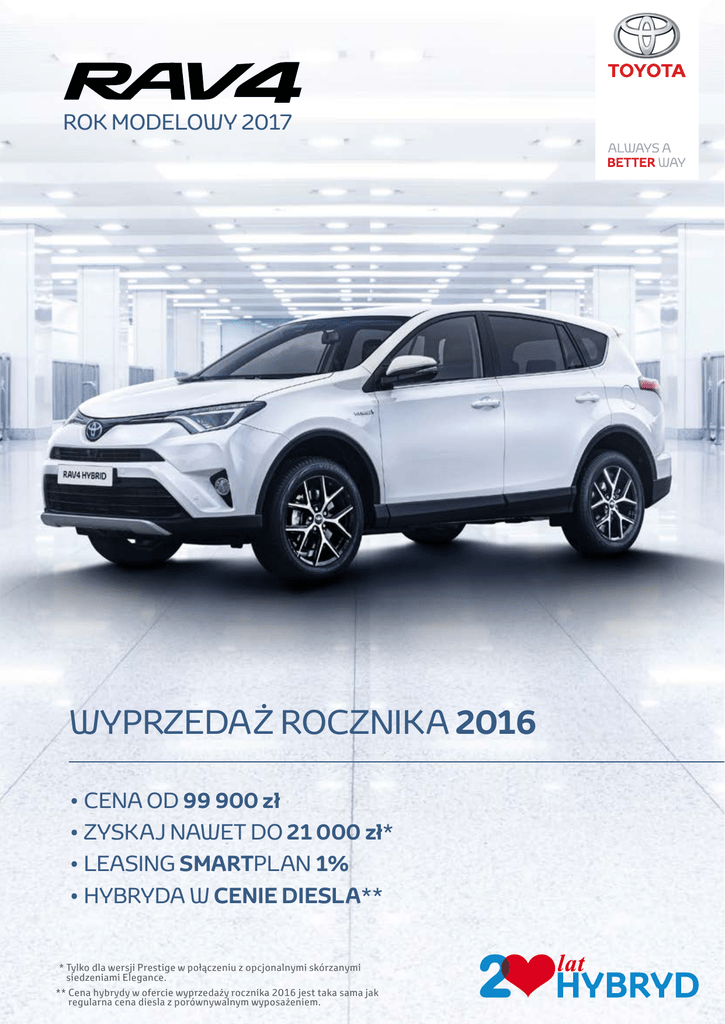 ROK MODELOWY 2017 WYPRZEDAŻ ROCZNIKA 2016 • CENA OD 99 900 zł • ZYSKAJ NAWET DO 21 000 zł* • LEASING SMARTPLAN 1% • HYBRYDA W CENIE DIESLA** * Tylko dla wersji Prestige w połączeniu z opcjonalnymi skórzanymi siedzeniami Elegance. ** Cena hybrydy w ofercie wyprzedaży rocznika 2016 jest taka sama jak regularna cena diesla z porównywalnym wyposażeniem. CENY BRUTTO (PLN) Cennik obowiązuje od 2 stycznia 2017 r. Rok produkcji: 2016, rok modelowy: 2017 Dla Twojej Firmy Dla Ciebie Rata Leasingu SMARTPLAN* Cena katalogowa Rabat Cena po rabacie Active – 110 900 11 000 99 900 Premium + VIP – 127 800 12 000 115 800 Premium + Style + VIP – 137 700 12 000 125 700 Prestige + VIP – 151 800 12 000 139 800 Premium + Style + VIP – 145 200 12 000 133 200 Prestige + VIP – 159 300 12 000 147 300 2,0 D-4D (143 KM) 6 M/T Start&Stop diesel 4x2 Premium + Style + VIP – 137 700 12 000 125 700 2,5 Hybrid (197 KM) E-CVT hybryda 4x2 Premium + Style + VIP** 1 547 154 700 17 000 137 700 Prestige + VIP** 1 678 167 800 17 000 150 800 Premium + Style + VIP** 1 647 164 700 17 000 147 700 Prestige + VIP** 1 778 177 800 17 000 160 800 Prestige + Winter + VIP** 1 817 181 700 17 000 164 700 SUV Wersja wyposażenia 2,0 Valvematic (152 KM) 6 M/T Start&Stop benzyna 4x4 2,0 Valvematic (152 KM) Mutidrive S Start&Stop benzyna 4x4 2,5 Hybrid (197 KM) E-CVT hybryda 4x4 Lakier metalik 2 900 Lakier biały perłowy 4 400 Nawigacja Toyota Touch 2 with Go Wyprzedaż rocznika 2016 ważna od 14.11.2016 r. do wyczerpania zapasów. Prosimy o potwierdzenie dostępności wybranej wersji u Autoryzowanego Dilera Toyoty. * Miesięczna rata Leasingu SMARTPLAN netto. ** Wyprzedaż rocznika 2016 ważna od 5.12.2016 r. do wyczerpania zapasów. Prosimy o potwierdzenie dostępności wybranej wersji u Autoryzowanego Dilera Toyoty. 3 200 PAKIETY DODATKOWE PAKIET VIP 4 900 PLN –Nawigacja Toyota Touch 2 with Go –Relingi dachowe Dostępny w wersjach Premium, Premium Hybrid, Prestige, Prestige Hybrid PAKIET SAFETY 0 PLN –Układ wczesnego reagowania w razie ryzyka zderzenia (PCS) z systemem wykrywania pieszych (PD) –Układ ostrzegania o niezamierzonej zmianie pasa ruchu (LDA) z funkcją powrotu na zadany tor jazdy (SC) – Układ rozpoznawania znaków drogowych (RSA) –Automatyczne światła drogowe (AHB) –Układ wykrywania zmęczenia kierowcy (SWS) –Aktywny tempomat (ACC) –Przednie i tylne czujniki parkowania Dostępny w wersjach Premium, Premium Hybrid, Prestige, Prestige Hybrid PAKIET STYLE 9 900 PLN –Przednie lampy typu Bi-LED –Automatyczna regulacja świateł głównych –Czarna podsufitka –Przyciemniane tylne szyby –Felgi aluminiowe 18" – System „Inteligentny kluczyk” – Elektrycznie unoszone drzwi bagażnika Dostępny w wersjach Premium i Premium Hybrid1 1 Pakiet Style w wersji Premium Hybrid nie posiada systemu „Inteligentny kluczyk” oraz elektrycznie unoszonych drzwi bagażnika, które są w tej wersji standardem. PAKIET WINTER 1 900 PLN / 3 900 PLN konwencjonalne/hybryda –Spryskiwacze reflektorów – Podgrzewana kierownica – Podgrzewanie dysz spryskiwaczy przedniej szyby – Podgrzewanie wycieraczek przedniej szyby – Nagrzewnica silnika (tylko dla 2,0 D-4D) – Podgrzewana tylna kanapa (hybryda) – Podgrzewana przednia szyba (hybryda) Dostępny w wersjach Prestige i Prestige Hybrid Opcje Active Premium Premium Hybrid Prestige Prestige Hybrid Pakiet LED: przednie lampy typu Bi-LED, automatyczna regulacja świateł głównych – 5 000 PLN 5 000 PLN – – Pakiet Premium Audio JBL: system Premium Audio JBL z 11 głośnikami i wzmacniaczem, głośnik bezprzewodowy JBL Charge 3 – – – – 5 900 PLN2 System multimedialny Toyota Touch 2 with Go (nawigacja) – 3 200 PLN 3 200 PLN 3 200 PLN 3 200 PLN Podgrzewanie przednich foteli – 1 000 PLN3 1 000 PLN3 2 000 PLN Safety Safety Safety Safety 1 700 PLN 1 700 PLN 1 700 PLN 1 700 PLN 1 700 PLN 990 PLN 990 PLN 990 PLN 990 PLN 990 PLN Skórzane siedzenia z elementami skóry naturalnej i syntetycznej Club w kolorze Light Beige lub Dark Rose – 5 900 PLN 5 900 PLN – – Skórzane siedzenia z elementami skóry naturalnej i syntetycznej Elegance w kolorze Light Beige, Dark Rose lub Deep Black – – – 5 900 PLN 1 900 PLN 5 900 PLN 1 900 PLN Elektroniczny system zabezpieczenia antykradzieżowego komputera i złącza diagnostycznego z możliwością dodatkowego zwiększenia jego stopnia ochrony5 990 PLN 0 PLN 990 PLN 0 PLN 990 PLN 0 PLN 990 PLN 0 PLN 990 PLN 0 PLN Rozszerzenie zabezpi eczenia pojazdu o elektroniczny system antykradzieżowy: ochrony wnętrza, dźwiękowej sygnalizacji włamania oraz identyfikację kierowcy poprzez kartę PROXY w przypadku kradzieży kluczyków samochodu6 880 PLN 880 PLN 880 PLN 880 PLN 880 PLN Przednie i tylne czujniki parkowania Relingi dachowe Rozszerzony system oświetlenia wnętrza diodami LED 4 2 Nie łączy się z Pakietem Winter. 3 Opcja dostępna tylko i wyłącznie z tapicerką skórzaną. 4 Cena brutto bez montażu. O szczegóły zapytaj sprzedawcę. 5 Bezobsługowy system renomowanej firmy Cobra AT, światowego lidera w branży samochodowych zabezpieczeń elektronicznych. 6 Klasa skuteczności PIMOT: profesjonalna. Koszt brutto z montażem w ASD. WYPOSAŻENIE Bezpieczeństwo Active ABS, EBD, BA System stabilizacji toru jazdy (VSC+) i kontrola trakcji (TRC) System stabilizacji toru jazdy przyczepy (TSC) System wspomagający pokonywanie podjazdu (HAC) System wspomagający zjazd ze wzniesienia (DAC) – tylko ze skrzynią automatyczną Multidrive S 7 poduszek powietrznych: przednie i boczne kierowcy i pasażera, kolanowa kierowcy, kurtyny boczne Wyłącznik przedniej poduszki powietrznej pasażera Sygnalizacja niezapiętych pasów bezpieczeństwa Aktywne zagłówki z regulacją wysokości Zabezpieczenie tylnych drzwi przed otwarciem przez dzieci Immobilizer ISOFIX na tylnych siedzeniach Czujnik ciśnienia powietrza w oponach Światła do jazdy dziennej typu LED Tylne światła typu LED Projekt