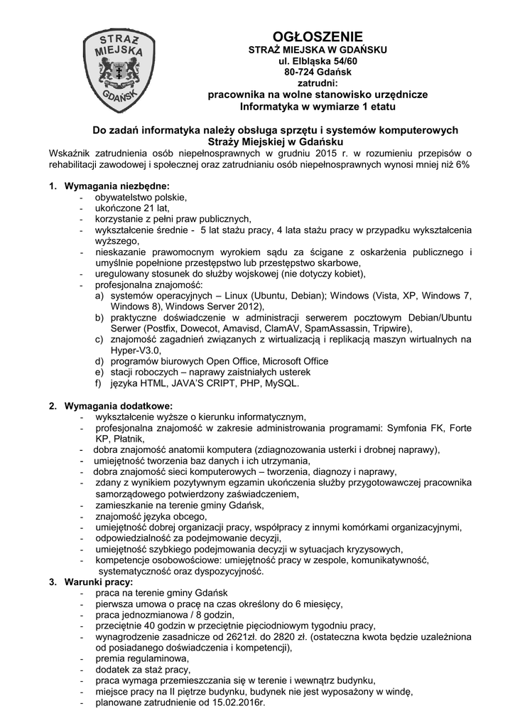 OGŁOSZENIE STRAŻ MIEJSKA W GDAŃSKU ul. Elbląska 54/60 80-724 Gdańsk zatrudni: pracownika na wolne stanowisko urzędnicze Informatyka w wymiarze 1 etatu Do zadań informatyka należy obsługa sprzętu i systemów komputerowych Straży Miejskiej w Gdańsku Wskaźnik zatrudnienia osób niepełnosprawnych w grudniu 2015 r. w rozumieniu przepisów o rehabilitacji zawodowej i społecznej oraz zatrudnianiu osób niepełnosprawnych wynosi mniej niż 6% 1. Wymagania niezbędne: - obywatelstwo polskie, - ukończone 21 lat, - korzystanie z pełni praw publicznych, - wykształcenie średnie - 5 lat stażu pracy, 4 lata stażu pracy w przypadku wykształcenia wyższego, - nieskazanie prawomocnym wyrokiem sądu za ścigane z oskarżenia publicznego i umyślnie popełnione przestępstwo lub przestępstwo skarbowe, - uregulowany stosunek do służby wojskowej (nie dotyczy kobiet), - profesjonalna znajomość: a) systemów operacyjnych – Linux (Ubuntu, Debian); Windows (Vista, XP, Windows 7, Windows 8), Windows Server 2012), b) praktyczne doświadczenie w administracji serwerem pocztowym Debian/Ubuntu Serwer (Postfix, Dowecot, Amavisd, ClamAV, SpamAssassin, Tripwire), c) znajomość zagadnień związanych z wirtualizacją i replikacją maszyn wirtualnych na Hyper-V3.0, d) programów biurowych Open Office, Microsoft Office e) stacji roboczych – naprawy zaistniałych usterek f) języka HTML, JAVA’S CRIPT, PHP, MySQL. 2. Wymagania dodatkowe: - wykształcenie wyższe o kierunku informatycznym, - profesjonalna znajomość w zakresie administrowania programami: Symfonia FK, Forte KP, Płatnik, - dobra znajomość anatomii komputera (zdiagnozowania usterki i drobnej naprawy), - umiejętność tworzenia baz danych i ich utrzymania, - dobra znajomość sieci komputerowych – tworzenia, diagnozy i naprawy, - zdany z wynikiem pozytywnym egzamin ukończenia służby przygotowawczej pracownika samorządowego potwierdzony zaświadczeniem, - zamieszkanie na terenie gminy Gdańsk, - znajomość języka obcego, - umiejętność dobrej organizacji pracy, współpracy z innymi komórkami organizacyjnymi, - odpowiedzialność za podejmowanie decyzji, - umiejętność szybkiego podejmowania decyzji w sytuacjach kryzysowych, - kompetencje osobowościowe: umiejętność pracy w zespole, komunikatywność, systematyczność oraz dyspozycyjność. 3. Warunki pracy: - praca na terenie gminy Gdańsk - pierwsza umowa o pracę na czas określony do 6 miesięcy, - praca jednozmianowa / 8 godzin, - przeciętnie 40 godzin w przeciętnie pięciodniowym tygodniu pracy, - wynagrodzenie zasadnicze od 2621zł. do 2820 zł. (ostateczna kwota będzie uzależniona od posiadanego doświadczenia i kompetencji), - premia regulaminowa, - dodatek za staż pracy, - praca wymaga przemieszczania się w terenie i wewnątrz budynku, - miejsce pracy na II piętrze budynku, budynek nie jest wyposażony w windę, - planowane zatrudnienie od 15.02.2016r. 4. Wymagane dokumenty: 1. CV, 2. list motywacyjny, 3. wypełniony kwestionariusz osobowy dla osób ubiegających się o zatrudnienie (do pobrania na stronie internetowej: www.strazmiejska.gda.pl lub BIP Straży Miejskiej w Gdańsku ), 4. oświadczenie o niekaralności oraz o wyrażeniu zgody na przetwarzanie danych osobowych do celu realizacji procesu rekrutacji (do pobrania na stronie internetowej: www.strazmiejska.gda.pl lub BIP Straży Miejskiej w Gdańsku), 5. kserokopię dokumentów potwierdzających wykształcenie (świadectwa/dyplomu ukończenia szkoły średniej lub wyższej - oryginał do wglądu), 6. kserokopie innych dokumentów potwierdzających posiadane kwalifikacje, 7. kserokopia książeczki wojskowej. (Uwaga: CV, list motywacyjny, wypełniony kwestionariusz osobowy dla osób ubiegających się o zatrudnienie i oświadczenie o niekaralności oraz o wyrażeniu zgody na przetwarzanie danych osobowych - należy podpisać własnoręcznie). 5. Termin i miejsce składania dokumentów: Oferty zawierające komplet wymaganych dokumentów w zaklejonej kopercie z dopiskiem „Oferta pracy na stanowisko informatyka” prosimy składać w Kancelarii Straży Miejskiej w Gdańsku przy ul. Elbląskiej 54/60 do dnia 25.01.2016r. do godz. 15.30, (liczy się data wpływu oferty do Kancelarii Straży Miejskiej w Gdańsku). 6. Informacje: Aplikacje niekompletne, własnoręcznie nie podpisane lub które wpłyną do Straży Miejskiej po wyżej określonym terminie nie będą rozpatrywane. Komendant Straży Miejskiej w Gdańsku