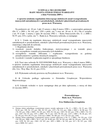 UCHWAŁA NR LII/1581/2009 RADY MIASTA STOŁECZNEGO WARSZAWY z dnia 9 kwietnia 2009 r. w sprawie ustalenia regulaminu dotyczącego niektórych zasad wynagradzania nauczycieli zatrudnionych w przedszkolach, szkołach i placówkach prowadzonych przez m.st. Warszawę Na podstawie art. 18 ust. 2 pkt 15 ustawy z dnia 8 marca 1990 r. o samorządzie gminnym (Dz. U. z 2001 r. Nr 142, poz. 1591 z późn. zm.1)) oraz art. 30 ust. 6, 10 i 10a w związku z art. 91 d pkt 1 ustawy z dnia 26 stycznia 1982 r. – Karta Nauczyciela (Dz. U. z 2006 r. Nr 97, poz. 674, z późn. zm.2)) - Rada m.st. Warszawy uchwala, co następuje: § 1. 1. Ustala się regulamin dotyczący niektórych zasad wynagradzania nauczycieli zatrudnionych w przedszkolach, szkołach i placówkach prowadzonych przez m.st. Warszawę, stanowiący załącznik do uchwały. 2. Regulamin określa: 1) wysokość stawek dodatku funkcyjnego, motywacyjnego i za warunki pracy oraz szczegółowe warunki przyznawania tych dodatków; 2) szczegółowe warunki obliczania i wypłacania wynagrodzenia za godziny ponadwymiarowe i godziny doraźnych zastępstw; 3) wysokość i warunki wypłacania nagród ze specjalnego funduszu. § 2. Traci moc uchwała Nr XXV/850/2008 Rady m.st. Warszawy z dnia 6 marca 2008 r. w sprawie ustalenia regulaminu dotyczącego niektórych zasad wynagradzania nauczycieli zatrudnionych w przedszkolach, szkołach i placówkach prowadzonych przez m.st. Warszawę (Dz. Urz.. Woj. Maz. Nr 43, poz.1533). § 3. Wykonanie uchwały powierza się Prezydentowi m.st. Warszawy. § 4. Uchwała Mazowieckiego. podlega ogłoszeniu w Dzienniku Urzędowym Województwa § 5. Uchwała wchodzi w życie następnego dnia po dniu ogłoszenia, z mocą od dnia 22 stycznia 2009 r. Przewodnicząca Rady m.st. Warszawy (-) Ewa Malinowska-Grupińska 1) Zmiany tekstu jednolitego wymienionej ustawy zostały ogłoszone w Dz. U. z 2002 r. Nr 23, poz. 220, Nr 62, poz. 558, Nr 113, poz. 984, Nr 153, poz. 1271 i Nr 214, poz. 1806, z 2003 r. Nr 80, poz. 717 i Nr 162, poz. 1568, z 2004 r. Nr 102, poz. 1055, Nr 116, poz. 1203 i Nr 167, poz. 1759, z 2005 r. Nr 172, poz. 1441 i Nr 175, poz. 1457, z 2006 r. Nr 17, poz. 128 i Nr 181, poz. 1337, z 2007 r. Nr 48, poz. 327, Nr 138, poz. 974 i Nr 173, poz. 1218 oraz z 2008 r. Nr 180, poz. 1111 i Nr 223, poz. 1458. 2) Zmiany tekstu jednolitego wymienionej ustawy zostały ogłoszone w Dz. U. z 2006 r. Nr 170, poz. 1218 i Nr 220, poz. 1600, z 2007 r. Nr 17, poz. 95, Nr 80, poz. 542, Nr 102, poz. 689, Nr 158, poz. 1103, Nr 176, poz. 1238, Nr 191, poz. 1369 i Nr 247, poz. 1821 z 2008 r. Nr 145, poz. 917 i Nr 227, poz. 1505 oraz z 2009r. Nr 1, poz.1. Załącznik do uchwały Nr LII/1581/2009 Rady m.st. Warszawy z dnia 9 kwietnia 2009 r. w sprawie ustalenia regulaminu dotyczącego niektórych zasad wynagradzania nauczycieli zatrudnionych w przedszkolach, szkołach i placówkach prowadzonych przez m.st. Warszawę Regulamin dotyczący niektórych zasad wynagradzania nauczycieli zatrudnionych w przedszkolach, szkołach i placówkach prowadzonych przez m.st. Warszawę Ilekroć w regulaminie jest mowa bez bliższego określenia o: 1) oddziale – należy przez to rozumieć także grupę wychowawczą. Rozdział 1 Wynagrodzenie nauczycieli § 1.1. Wynagrodzenie zasadnicze dla nauczycieli stażystów zwiększa się o 100 złotych oraz dla nauczycieli kontraktowych o 65 złotych. 2. Wynagrodzenie zasadnicze nauczycieli legitymujących się dyplomem ukończenia studium nauczycielskiego, pedagogicznego studium technicznego, studium wychowania przedszkolnego oraz studium nauczania początkowego zrównuje się z wynagrodzeniem zasadniczym nauczycieli legitymujących się tytułem zawodowym licencjata bez przygotowania pedagogicznego, dyplomem ukończenia kolegium nauczycielskiego lub nauczycielskiego kolegium języków obcych, określonych na podstawie art. 30 ust. 5 pkt 1 ustawy z dnia 26 stycznia 1982r.- Karta Nauczyciela (Dz. U. z 2006r. Nr 97, poz. 674, z późn. zm.). Rozdział 2 Dodatek funkcyjny § 2.1. Wysokość dodatku funkcyjnego dla dyrektora szkoły ustala Prezydent m.st. Warszawy uwzględniając: 1) liczbę oddziałów i strukturę organizacyjną szkoły; 2) złożoność zadań wynikających z zajmowanego stanowiska oraz warunki społeczne i środowiskowe, w jakich szkoła funkcjonuje. 2. Wysokość dodatku funkcyjnego dla doradcy metodycznego ustala dyrektor szkoły, w której doradca metodyczny jest zatrudniony, po zasięgnięciu opinii Biura Edukacji Urzędu m.st. Warszawy, uwzględniając obszar działania doradcy metodycznego oraz złożoność zadań wynikających z pełnionej funkcji. 3. Wysokość dodatku funkcyjnego dla wicedyrektora i innych osób zajmujących stanowiska kierownicze w szkole - w granicach stawek określonych w regulaminie - ustala, w ramach przyznanych na ten cel środków, dyrektor szkoły uwzględniając złożoność zadań wynikających z pełnionej funkcji. 4. Dodatek funkcyjny dla dyrektora zespołu szkół, w skład którego wchodzą szkoły różnych typów, ustala się według typu szkoły realizującej w tym zespole najwyższy poziom kształcenia. Przy ustalaniu wysokości dodatku funkcyjnego uwzględnia się łączną liczbę oddziałów szkół wchodzących w skład zespołu. § 3. 1.Określa się następujące stawki dodatku funkcyjnego: Lp. 1 Stanowisko kierownicze lub pełniona funkcja Stawki w zł Przedszkola: 1) dyrektor przedszkola liczącego: • do 3 oddziałów 400 zł – 750 zł • 4 - 5 oddziałów 600 zł – 900 zł • 6 i więcej oddziałów 900 zł – 1300 zł 2) wicedyrektor 2 300 zł - 600 zł Szkoły podstawowe: 1) dyrektor szkoły liczącej: 3 • do 5 oddziałów 600 zł – 1000 zł • 6 - 9 oddziałów 800 zł - 1200 zł • 10 - 18 oddziałów 1000 zł - 1400 zł • 19 - 27 oddziałów 1200 zł - 1600 zł • 28 – 39 oddziałów 1400 zł - 2000 zł • 40 i więcej oddziałów 1600 zł – 2200 zł 2) wicedyrektor 400 zł - 800 zł 3) kierownik świetlicy szkolnej, ki