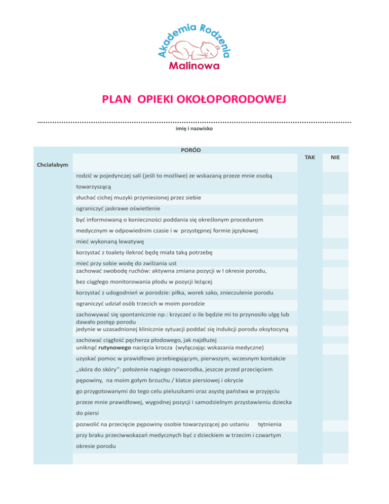 PLAN OPIEKI OKOŁOPORODOWEJ …........................................................................................................................................ imię i nazwisko PORÓD TAK Chciałabym rodzić w pojedynczej sali (jeśli to możliwe) ze wskazaną przeze mnie osobą towarzyszącą słuchać cichej muzyki przyniesionej przez siebie ograniczyć jaskrawe oświetlenie być informowaną o konieczności poddania się określonym procedurom medycznym w odpowiednim czasie i w przystępnej formie językowej mieć wykonaną lewatywę korzystać z toalety ilekroć będę miała taką potrzebę mieć przy sobie wodę do zwilżania ust zachować swobodę ruchów: aktywna zmiana pozycji w I okresie porodu, bez ciągłego monitorowania płodu w pozycji leżącej korzystać z udogodnień w porodzie: piłka, worek sako, znieczulenie porodu ograniczyć udział osób trzecich w moim porodzie zachowywać się spontanicznie np.: krzyczeć o ile będzie mi to przynosiło ulgę lub dawało postęp porodu jedynie w uzasadnionej klinicznie sytuacji poddać się indukcji porodu oksytocyną zachować ciągłość pęcherza płodowego, jak najdłużej uniknąć rutynowego nacięcia krocza (wyłączając wskazania medyczne) uzyskać pomoc w prawidłowo przebiegającym, pierwszym, wczesnym kontakcie „skóra do skóry”: położenie nagiego noworodka, jeszcze przed przecięciem pępowiny, na moim gołym brzuchu / klatce piersiowej i okrycie go przygotowanymi do tego celu pieluszkami oraz asystę państwa w przyjęciu przeze mnie prawidłowej, wygodnej pozycji i samodzielnym przystawieniu dziecka do piersi pozwolić na przecięcie pępowiny osobie towarzyszącej po ustaniu tętnienia przy braku przeciwwskazań medycznych być z dzieckiem w trzecim i czwartym okresie porodu NIE w przypadku konieczności zastosowania krótkotrwałego znieczulenia ogólnego powierzyć moje dziecko w ręce osoby towarzyszącej w porodzie, tak abym zaraz po wybudzeniu mogła z nim być w przebiegu ewentualnego operacyjnego zakończenia porodu mieć zapewniony choćby krótki kontakt z dzieckiem W połogu Chciałabym TAK karmić piersią zacząć karmienie w najkrótszym czasie po porodzie, jak tylko to możliwe mieć dziecko przy sobie przez cały czas pobytu liczyć na wsparcie i pomoc w karmieniu piersią: asysta w prawidłowym przystawianiu do piersi i doborze właściwej pozycji w karmieniu, nie dokarmianiu noworodka bez uzgodnienia ze mną być obecna, jeśli to możliwe przy realizacji procedur medycznych u mojego dziecka po porodzie drogą cięcia cesarskiego w znieczuleniu podpajęczynówkowym i przybyciu z sali operacyjnej być w bliskim kontakcie z dzieckiem mimo braku możliwości wstawania wsparcia i pomocy w skutecznym karmieniu piersią wprowadzenia do samoobserwacji i samoopieki oraz pielęgnacji noworodka Akademia Rodzenia Malinowa Łódź, ul.Kilińskiego 21, tel. kom. 731 189 069, [email protected] NIE