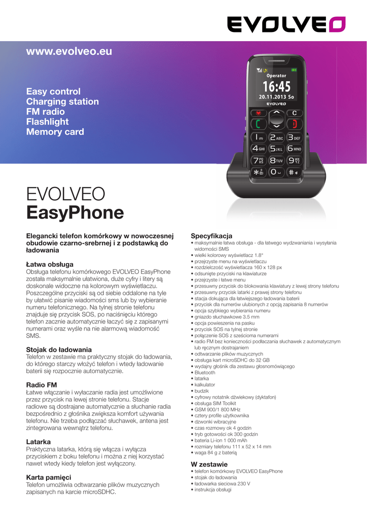 www.evolveo.eu Easy control Charging station FM radio Flashlight Memory card EVOLVEO EasyPhone Elegancki telefon komórkowy w nowoczesnej obudowie czarno-srebrnej i z podstawką do ładowania Łatwa obsługa Obsługa telefonu komórkowego EVOLVEO EasyPhone została maksymalnie ułatwiona, duże cyfry i litery są doskonale widoczne na kolorowym wyświetlaczu. Poszczególne przyciski są od siebie oddalone na tyle by ułatwić pisanie wiadomości sms lub by wybieranie numeru telefonicznego. Na tylnej stronie telefonu znajduje się przycisk SOS, po naciśnięciu którego telefon zacznie automatycznie łaczyć się z zapisanymi numerami oraz wyśle na nie alarmową wiadomość SMS. Stojak do ładowania Telefon w zestawie ma praktyczny stojak do ładowania, do którego starczy włożyć telefon i wtedy ładowanie baterii się rozpocznie automatycznie. Radio FM Łatwe włączanie i wyłaczanie radia jest umożliwione przez przycisk na lewej stronie telefonu. Stacje radiowe są dostrajane automatycznie a słuchanie radia bezpośrednio z głośnika zwiększa komfort używania telefonu. Nie trzeba podłączać słuchawek, antena jest zintegrowana wewnątrz telefonu. Latarka Praktyczna latarka, którą się włącza i wyłącza przyciskiem z boku telefonu i można z niej korzystać nawet wtedy kiedy telefon jest wyłączony. Karta pamięci Telefon umożliwia odtwarzanie plików muzycznych zapisanych na karcie microSDHC. Specyfikacja • maksymalnie łatwa obsługa - dla łatwego wydzwaniania i wysyłania widomości SMS • wielki kolorowy wyświetlacz 1.8“ • przejrzyste menu na wyświetlaczu • rozdzielczość wyświetlacza 160 x 128 px • odsunięte przyciski na klawiaturze • przejrzyste i łatwe menu • przesuwny przycisk do blokowania klawiatury z lewej strony telefonu • przesuwny przycisk latarki z prawej strony telefonu • stacja dokująca dla łatwiejszego ładowania baterii • przycisk dla numerów ulubionych z opcją zapisania 8 numerów • opcja szybkiego wybierania numeru • gniazdo słuchawkowe 3.5 mm • opcja powieszenia na pasku • przycisk SOS na tylnej stronie • połączenie SOS z sześcioma numerami • radio FM bez konieczności podłaczania słuchawek z automatycznym lub ręcznym dostrajaniem • odtwarzanie plików muzycznych • obsługa kart microSDHC do 32 GB • wydajny głośnik dla zestawu głosnomówiącego • Bluetooth • latarka • kalkulator • budzik • cyfrowy notatnik dźwiekowy (dyktafon) • obsługa SIM Toolkit • GSM 900/1 800 MHz • cztery profile użytkownika • dzwonki wibracyjne • czas rozmowy ok 4 godzin • tryb gotowości ok 300 godzin • bateria Li-ion 1 000 mAh • rozmiary telefonu 111 x 52 x 14 mm • waga 84 g z baterią W zestawie • telefon komórkowy EVOLVEO EasyPhone • stojak do ładowania • ładowarka sieciowa 230 V • instrukcja obsługi