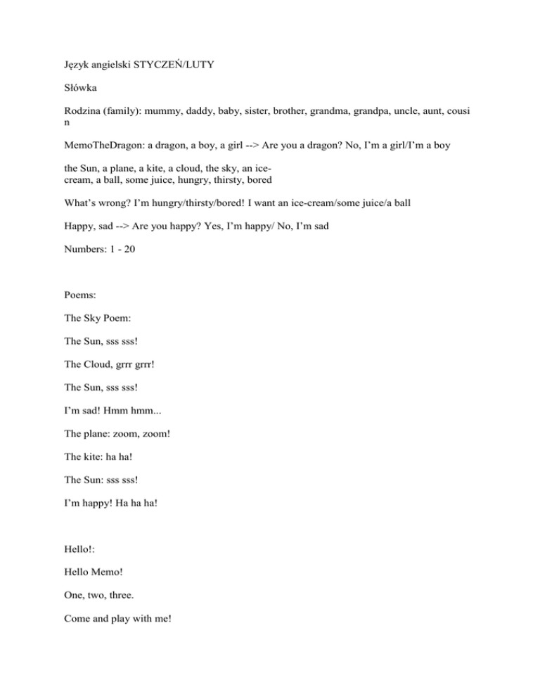 Język angielski STYCZEŃ/LUTY Słówka Rodzina (family): mummy, daddy, baby, sister, brother, grandma, grandpa, uncle, aunt, cousi n MemoTheDragon: a dragon, a boy, a girl --> Are you a dragon? No, I’m a girl/I’m a boy the Sun, a plane, a kite, a cloud, the sky, an icecream, a ball, some juice, hungry, thirsty, bored What’s wrong? I’m hungry/thirsty/bored! I want an ice-cream/some juice/a ball Happy, sad --> Are you happy? Yes, I’m happy/ No, I’m sad Numbers: 1 - 20 Poems: The Sky Poem: The Sun, sss sss! The Cloud, grrr grrr! The Sun, sss sss! I’m sad! Hmm hmm... The plane: zoom, zoom! The kite: ha ha! The Sun: sss sss! I’m happy! Ha ha ha! Hello!: Hello Memo! One, two, three. Come and play with me! Hello Memo! Three, two, one. We’re having fun! Bye, bye!: Bye-bye Memo! One, two, three. Let’s go down the tree! Bye-bye Memo! Three, two, one. It was super fun! Song: Put your hand inside, Put your hand outside, Put your hand inside And shake it all about, And do the woogie-boogie And turn yourself around That’s what it’s all about