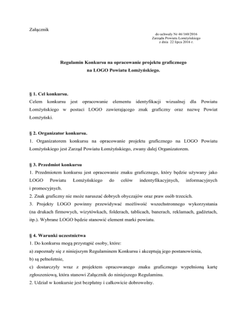 Załącznik do uchwały Nr 46/160/2016 Zarządu Powiatu Łomżyńskiego z dnia 22 lipca 2016 r. Regulamin Konkursu na opracowanie projektu graficznego na LOGO Powiatu Łomżyńskiego. § 1. Cel konkursu. Celem konkursu jest opracowanie elementu identyfikacji wizualnej dla Powiatu Łomżyńskiego w postaci LOGO zawierającego znak graficzny oraz nazwę Powiat Łomżyński. § 2. Organizator konkursu. 1. Organizatorem konkursu na opracowanie projektu graficznego na LOGO Powiatu Łomżyńskiego jest Zarząd Powiatu Łomżyńskiego, zwany dalej Organizatorem. § 3. Przedmiot konkursu 1. Przedmiotem konkursu jest opracowanie znaku graficznego, który będzie używany jako LOGO Powiatu Łomżyńskiego do celów indentyfikacyjnych, informacyjnych i promocyjnych. 2. Znak graficzny nie może naruszać dobrych obyczajów oraz praw osób trzecich. 3. Projekty LOGO powinny przewidywać możliwość wszechstronnego wykorzystania (na drukach firmowych, wizytówkach, folderach, tablicach, banerach, reklamach, gadżetach, itp.). Wybrane LOGO będzie stanowić element marki powiatu. § 4. Warunki uczestnictwa 1. Do konkursu mogą przystąpić osoby, które: a) zapoznały się z niniejszym Regulaminem Konkursu i akceptują jego postanowienia, b) są pełnoletnie, c) dostarczyły wraz z projektem opracowanego znaku graficznego wypełnioną kartę zgłoszeniową, która stanowi Załącznik do niniejszego Regulaminu. 2. Udział w konkursie jest bezpłatny i całkowicie dobrowolny. 3. Wyłonione drogą niniejszego konkursu LOGO staje się własnością Organizatora, który może je w dowolny sposób wykorzystywać oraz odstępować. Autor pracy zwycięskiej konkursu zobowiązany jest do nieodpłatnego przeniesienia na Organizatora praw autorskich do opracowanego przez siebie LOGO. 4.Prawa autorskie pozostałych prac pozostaną własnością autorów, a Powiat Łomżyński nie wykorzysta ich w swoich materiałach promocyjnych bez zgody autora. 5. Powiat Łomżyński zastrzega sobie prawo do nieodpłatnego wykorzystania praw autorskich do wystawienia prac zgłoszonych do konkursu na wystawie we wskazanym przez Organizatora miejscu. § 5. Forma prezentacji projektu konkursowego. 1. Projekt logo należy składać łącznie w następujących formatach: 1) kolorowy wydruk na sztywnym papierze w dwóch rozmiarach: dużym ( max. 200x200 mm.) oraz miniaturze ( 25x25 mm.); 2) na nośniku elektronicznym, na płycie CD lub DVD zapisanych w formatach: TIFF, BMP o rozdzielczości min. 600 dpi oraz w formacie wektorowym CDR, z podaniem parametrów graficznych niezbędnych do właściwego użytkowania; 2. Pliki muszą dopuszczać możliwości zmiany skali i proporcji obrazu logo bez utraty jakości. 3. Każdy uczestnik konkursu może zgłosić maksymalnie 2 projekty graficzne. 4 W przypadku gdy uczestnik konkursu składa więcej niż jeden projekt, do każdego z nich należy dołączyć wydruk oraz płytę CD lub DVD z projektem, wg zasad określonych w ust. 1 i 2. 5. Do projektu należy dołączyć krótki opis użytej symboliki i kolorystyki. 6. Nadesłane i złożone prace konkursowe i dokumenty nie podlegają zwrotowi. § 6. Miejsce i termin nadsyłania prac. 1. Projekty LOGO należy dostarczyć osobiście lub wysłać pocztą w zamkniętej kopercie z dopiskiem: „Konkurs na LOGO Powiatu Łomżyńskiego” wraz z czytelnie wypełnioną kartą zgłoszeniową (Załącznik nr 1 Regulaminu konkursu) i opisaną płytą CD-R, na adres: Starostwo Powiatowe w Łomży ul. Szosa Zambrowska 1/27 18-400 Łomża 2. Ostateczny termin przyjmowania prac upływa z dniem 15 września 2016 roku do godz. 15.00 (decyduje data wpływu do siedziby Organizatora). 3. Organizator konkursu nie ponosi odpowiedzialności za opóźnienia pocztowe lub kurierskie, z których korzystać będą uczestnicy Konkursu. Organizator nie ponosi również odpowiedzialności za działania osób trzecich, nie związanych z organizacją Konkursu oraz za szkody spowodowane podaniem błędnych lub nieaktualnych danych przez uczestników konkursu. 4. Prace konkursowe niespełniające wymagań, o których mowa w Regulaminie konkursu lub nadesłane po upływie terminu, o którym mowa powyżej, nie będą podlegały ocenie Jury. § 7. Ocena prac. 1. Prace spełniające wszystkie wymagania określone w § 5 oceniane będą zgodnie z następującymi kryteriami: a) oryginalność znaku, łatwość kojarzenia i zapamiętywania, dobra identyfikacja znaku z Powiatem Łomżyńskim; b) estetyka formy graficznej; c) czytelność i funkcjonalność, łatwość konwersji . 2. Oceny prac konkursowych dokona powołana przez Starostę Łomżyńskiego Komisja Konkursowa składającą się z przedstawicieli Powiatu Łomżyńskiego oraz specjalisty z dziedziny grafiki i plastyki. 3. Komisja Konkursowa dokona wyboru najlepszej pracy. Decyzja Komisji jest ostateczna i nie przysługuje od niej odwołanie. § 8. Ogłoszenie wyników. 1. Ogłoszenie wyników nastąpi do dnia 30 września 2016 roku. 2. Informacja o zwycięskim projekcie znajdzie się na stronie internetowej Powiatu Łomżyńskiego. 3. Laureat konkursu zostanie poinformowany o jego rozstrzygnięciu odrębnym pismem. 4. Organizator konkursu zastrzega sobie prawo do opublikowania imienia, nazwiska/nazwy i informacji o laureacie konkursu, a także projektów konkursowych oraz umieszczenia tych informacji w materiałach reklamowych organizatora oraz w mediach i Internecie. 5. Zwycięski projekt stanie się LOGO Powiatu Łomżyńskiego po zatwierdzeniu go stosowną uchwałą Rady Powiatu. 6. Komisja zastrzega sobie prawo nie wyłonienia laureata konkursu. § 9. Nagroda. 1. Za najlepszy projekt, który wybierze Komisja Konkursowa, przyznana zostanie nagroda finansowa w wysokości 1.000 (brutto). 2. Organizator konkursu zastrzega sobie prawo do zakończenia konkursu bez przyznania nagród oraz wyboru zwycięskiego logo. § 10. Postanowienia końcowe. 1. Interpretacja zasad Regulaminu Konkursu należy wyłącznie do Organizatora, któ