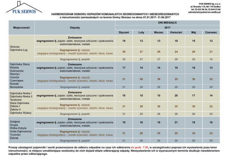 HARMONOGRAM ODBIORU ODPADÓW KOMUNALNYCH SEGREGOWANYCH I NIESEGREGOWANYCH z nieruchomości zamieszkałych na terenie Gminy Skórzec na okres 01.01.2017- 31.06.2017 PUK SERWIS Sp. z o. o. ul. Brzeska 110, 08-110 Siedlce tel. 25 632 46 26, 25 644 23 66 [email protected] DNI MIESIĄCA Miejscowość Skórzec Dąbrówka Ług Odpady 2017 Styczeń Luty Marzec Kwiecień Maj Czerwiec Zmieszane segregowane tj. papier, szkło, tworzywa sztuczne i opakowania wielomateriałowe, metale 16 13 13 18 15 12 Segregowane tj. odpady ulegające biodegradacji – resztki żywności, obierki, liście, trawa 30 27 29 24 29 21 Segregowane tj. popiół 30 27 27 28 25 19 Dąbrówka Stany Kłódzie Dobrzanów Skarżyn Ozorów Czerniejew Nowaki Boroszków Zmieszane segregowane tj. papier, szkło, tworzywa sztuczne i opakowania wielomateriałowe, metale 17 14 14 19 16 13 Segregowane tj. odpady ulegające biodegradacji – resztki żywności, obierki, liście, trawa 31 28 30 25 30 22 Segregowane tj. popiół 31 28 28 28 26 20 Dąbrówka Niwka I Dąbrówka Niwka II Teodorów Stara Dąbrówka Żelków I Żelków II Dąbrówka Wyłazy Zmieszane segregowane tj. papier, szkło, tworzywa sztuczne i opakowania wielomateriałowe, metale 18 15 15 20 17 14 Segregowane tj. odpady ulegające biodegradacji – resztki żywności, obierki, liście, trawa 31 28 30 25 30 22 Segregowane tj. popiół 31 28 28 28 26 20 Zmieszane segregowane tj. papier, szkło, tworzywa sztuczne i opakowania wielomateriałowe, metale 19 16 16 21 18 16 Segregowane tj. odpady ulegające biodegradacji – resztki żywności, obierki, liście, trawa 31 28 30 25 30 22 Segregowane tj. popiół 31 28 28 28 26 20 Gołąbek Drupia Wólka Kobyla Grala Dąbrowizna Trzciniec Żebrak Proszę udostępnić pojemniki i worki przeznaczone do odbioru odpadów na czas ich odbierania do godz. 7:00, w szczególności poprzez ich wystawienie poza teren nieruchomości, w miejsce umożliwiające swobodny do nich dojazd ekipie odbierającej odpady. Niewystawienie ich w wyznaczonym terminie skutkuje nieodebraniem odpadów przez odbierającego. Punkt Selektywnej Zbiórki Odpadów Komunalnych (PSZOK) w Dąbrówce-Ług, będzie ogólnie dostępny dla wszystkich mieszkańców Gminy Skórzec w każdą pierwszą sobotę miesiąca w godz. 800-1200, z wyłączeniem świąt przypadających w tym dniu. JAK PRAWIDŁOWO SEGREGOWAĆ ODPADY – GMINA SKÓRZEC PAPIER SZKŁO Pojemniki lub worki NIEBIESKIE Pojemniki lub worki ZIELONE PAMIĘTAJ !!! TWORZYWA SZTUCZNE I OPAKOWANIA WIELOMATERIAŁOWE Pojemniki lub worki ŻÓŁTE PAMIĘTAJ !!! Usuń zszywki, metalowe części i plastikowe opakowania Nie tłucz szkła przed wrzuceniem do pojemnika, wrzucaj czyste ● Butelki szklane po napojach i słoiki po żywności (CZYSTE) ● Butelki po napojach alkoholowych ● Szklane opakowania po kosmetykach TU NIE WRZUCAMY !!! ● Zabrudzonego i tłustego papieru ● Papieru z folią ● Kartonów po mleku, sokach i napojach ● Artykułów i papierów higienicznych tj. pampersy, podpaski ● Tapet ● Foliowych kartonów TU NIE WRZUCAMY !!! ● Szkła stołowego tj. porcelany i ceramiki ● Luster ● Szkła okiennego, zbrojonego ● Żarówek, reflektorów ● Szkła żaroodpornego ● Szyb samochodowych ● Szklanych opakowań farmaceutycznych Pojemniki lub worki RÓŻOWE PAMIĘTAJ !!! PAMIĘTAJ !!! Wrzucaj czyste opakowania i zgnieć butelki przed wrzuceniem Opakowania wielomateriałowe są to opakowania wykonane co najmniej z dwóch różnych materiałów, których nie można rozdzielić w sposób ręczny TU WRZUCAMY !!! TU WRZUCAMY !!! ● Gazety, czasopisma ● Papier szkolny i biurowy ● Torebki papierowe ● Papier pakowy ● Pudełka kartonowe i tekturowe METALE Wrzucaj czyste opakowania i przed wrzuceniem zgnieć puszki TU WRZUCAMY !!! TU WRZUCAMY !!! ● Butelki po napojach (ZGNIECIONE) ● Butelki po płynach do mycia ● Plastikowe zakrętki ● Plastikowe torebki, worki i reklamówki ● Kartony po mleku i sokach ● Torebki po przyprawach i zupach ● Puszki po napojach i konserwach ● Metalowe nakrętki i kapsle ● Aluminiowe folie ● Drobny złom TU NIE WRZUCAMY !!! TU NIE WRZUCAMY ! ● Butelek i pojemników z zawartością ● Butelek i pojemników po smarach, farbach i lakierach ● Opakowań po lekach ● Butelek po płynach chłodniczych ● Styropianu ● Pojemników i opakowań po środkach ochrony roślin ● Baterii ● Puszek i opakowań po aerozolach, farbach i lakierach ● Opakowań metalowych z jakąkolwiek zawartością ODPADY ULEGAJĄCE BIODEGRADACJI Pojemniki lub worki BRĄZOWE PAMIĘTAJ !!! Odpady wyrzucaj bezpośrednio do pojemnika lub worka bez używania worków foliowych i reklamówek. Wyrzucamy odpady STAŁE, NIE PŁYNNE TU WRZUCAMY !!! ● Resztki żywności ● Obierki i resztki owoców i warzyw ● Liście i trawę, kwiaty i pozostałości z roślin ● Przycięte części drzew i krzewów ● Fusy po kawie i herbacie ● Skorupki z orzechów i jaj TU NIE WRZUCAMY !!! ● Zepsutej żywności, resztek mięsa i kości ● Popiołu ● Odchodów zwierzęcych ● Papierosów i petów ODPADY NIESEGREGOWANE, ZMIESZANE - pojemniki lub worki CZARNE TU WRZUCAMY !!! ● Osoby deklarujące segregację: pozostałe odpady komunalne, których nie można przyporządkować do worków/pojemników innych kolorów ● Osoby nie deklarujące segregacji: odpady komunalne z wyjątkiem popiołu. TU NIE WRZUCAMY !!! ● leków ● chemikaliów np. resztek farb, lakierów i opakowań po nich ● zużytych baterii i akumulatorów ● zużytego sprzętu elektrycznego i elektronicznego ● odpadów budowlanych i rozbiórkowych ● mebli i odpadów wielkogabarytowych ● zużytych opon POPIÓŁ Pojemniki lub worki SZARE