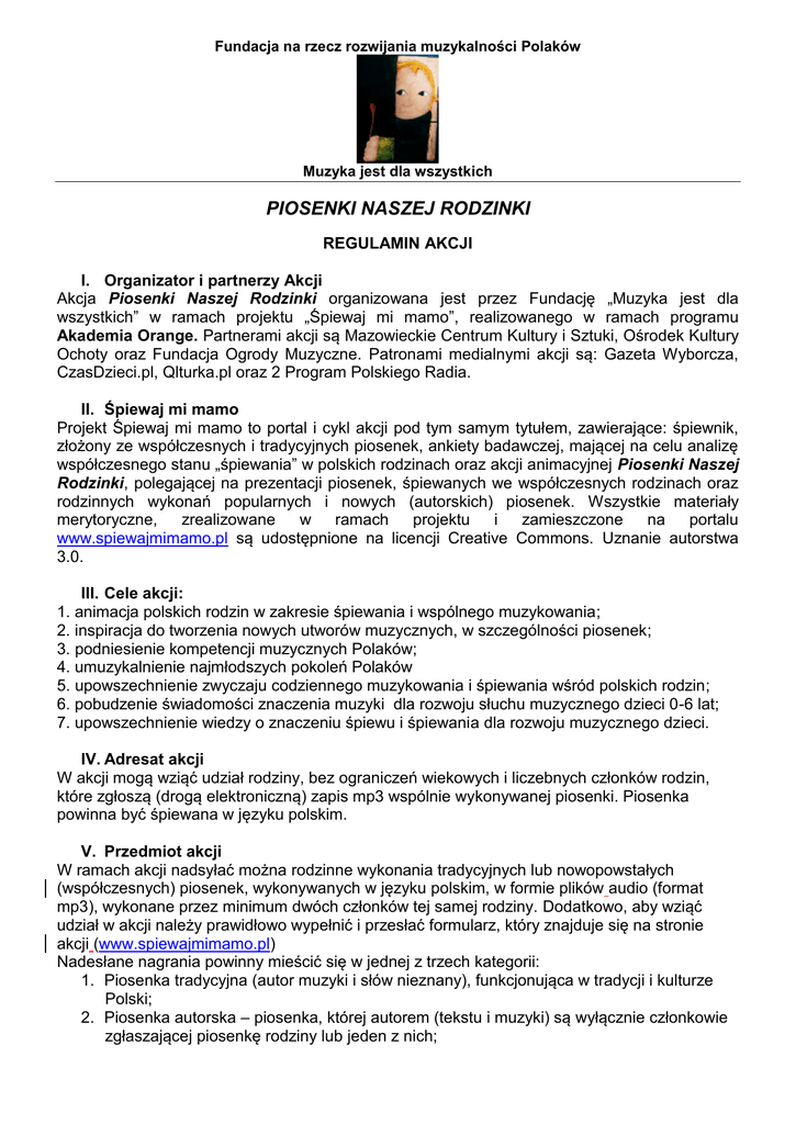 Fundacja na rzecz rozwijania muzykalności Polaków Muzyka jest dla wszystkich PIOSENKI NASZEJ RODZINKI REGULAMIN AKCJI I. Organizator i partnerzy Akcji Akcja Piosenki Naszej Rodzinki organizowana jest przez Fundację „Muzyka jest dla wszystkich” w ramach projektu „Śpiewaj mi mamo”, realizowanego w ramach programu Akademia Orange. Partnerami akcji są Mazowieckie Centrum Kultury i Sztuki, Ośrodek Kultury Ochoty oraz Fundacja Ogrody Muzyczne. Patronami medialnymi akcji są: Gazeta Wyborcza, CzasDzieci.pl, Qlturka.pl oraz 2 Program Polskiego Radia. II. Śpiewaj mi mamo Projekt Śpiewaj mi mamo to portal i cykl akcji pod tym samym tytułem, zawierające: śpiewnik, złożony ze współczesnych i tradycyjnych piosenek, ankiety badawczej, mającej na celu analizę współczesnego stanu „śpiewania” w polskich rodzinach oraz akcji animacyjnej Piosenki Naszej Rodzinki, polegającej na prezentacji piosenek, śpiewanych we współczesnych rodzinach oraz rodzinnych wykonań popularnych i nowych (autorskich) piosenek. Wszystkie materiały merytoryczne, zrealizowane w ramach projektu i zamieszczone na portalu www.spiewajmimamo.pl są udostępnione na licencji Creative Commons. Uznanie autorstwa 3.0. III. Cele akcji: 1. animacja polskich rodzin w zakresie śpiewania i wspólnego muzykowania; 2. inspiracja do tworzenia nowych utworów muzycznych, w szczególności piosenek; 3. podniesienie kompetencji muzycznych Polaków; 4. umuzykalnienie najmłodszych pokoleń Polaków 5. upowszechnienie zwyczaju codziennego muzykowania i śpiewania wśród polskich rodzin; 6. pobudzenie świadomości znaczenia muzyki dla rozwoju słuchu muzycznego dzieci 0-6 lat; 7. upowszechnienie wiedzy o znaczeniu śpiewu i śpiewania dla rozwoju muzycznego dzieci. IV. Adresat akcji W akcji mogą wziąć udział rodziny, bez ograniczeń wiekowych i liczebnych członków rodzin, które zgłoszą (drogą elektroniczną) zapis mp3 wspólnie wykonywanej piosenki. Piosenka powinna być śpiewana w języku polskim. V. Przedmiot akcji W ramach akcji nadsyłać można rodzinne wykonania tradycyjnych lub nowopowstałych (współczesnych) piosenek, wykonywanych w języku polskim, w formie plików audio (format mp3), wykonane przez minimum dwóch członków tej samej rodziny. Dodatkowo, aby wziąć udział w akcji należy prawidłowo wypełnić i przesłać formularz, który znajduje się na stronie akcji (www.spiewajmimamo.pl) Nadesłane nagrania powinny mieścić się w jednej z trzech kategorii: 1. Piosenka tradycyjna (autor muzyki i słów nieznany), funkcjonująca w tradycji i kulturze Polski; 2. Piosenka autorska – piosenka, której autorem (tekstu i muzyki) są wyłącznie członkowie zgłaszającej piosenkę rodziny lub jeden z nich; 3. Piosenka do zaproponowanego tekstu – piosenka, której melodia (oprawa muzyczna) została skomponowana do zaproponowanego, wskazanego przez Organizatora akcji tekstu, znajdującego się na stronie www.spiewajmimamo.pl. Jedna rodzina może zgłosić do akcji maksymalnie 3 piosenki: po jednej z każdej z powyższych kategorii. Nagranie audio nie powinno być krótsze niż 30” i dłuższe niż 3 minuty. Organizator akcji opublikuje na portalu i fanpage’u projektu tylko piosenki, mieszczące się we wskazanych powyżej kategoriach. Organizator zastrzega sobie prawo do publikacji na portalu wybranych piosenek. VI. Terminy i sposób zgłoszenia: Piosenki na akcję mogą być nadsyłane, począwszy od dnia 15 kwietnia 2012 roku aż do momentu zamknięcia akcji (w zależności od zainteresowania i ilości zgłoszeń), za pomocą formularza zgłoszeniowego, zamieszczonego na stronie www.spiewajmimamo.pl. Wybrane pliki z wykonaniami piosenek zostaną opublikowane na stronie akcji oraz na fanpage’u Śpiewaj mi mamo (www.spiewajmimamo.pl). Rodziny, które prześlą najciekawsze wykonania, oraz otrzymają największą liczbę wskazań „lubię to” na fanpage’u projektu Śpiewaj mi mamo, zostaną zaproszone do prezentacji na żywo swojej piosenki w ramach koncertów Śpiewaj mi mamo (pierwsze z nich odbędą się 26 maja 2012 roku w Mazowieckim Centrum Kultury i Sztuki przy ulicy Elektoralnej 12), realizowanych na terenie Warszawy i Mazowsza. VII. Prawa autorskie Zgłoszenie piosenki do akcji wraz z wypełnionym formularzem jest równoznaczne z: 1/. udzieleniem organizatorowi akcji licencji na wykorzystanie zgłoszonego wykonania w ramach portalu www.spiewajmimamo.pl. 2/ wyrażeniem zgody na publikację zgłoszonego wykonania na portalu www.spiewajmimamo.pl oraz fanpage’u projektu Śpiewaj mi mamo. Dodatkowych informacji na temat akcji udziela: Anna Kierkosz/Fundacja Muzyka jest dla wszystkich – [email protected]; kom. 502 599 634 Fundacja Muzyka jest dla wszystkich; www.muzykajest.pl 03-913 Warszawa, ul. Angorska 21 m.2 e-mail: [email protected]
