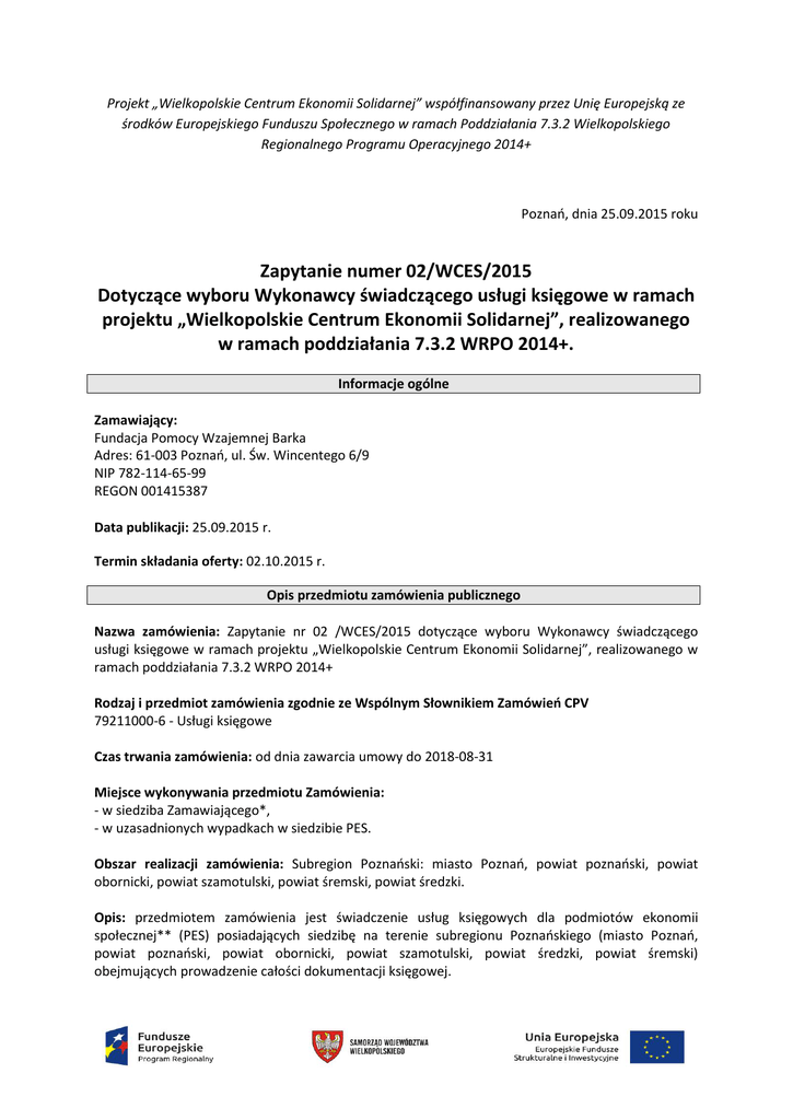 Projekt „Wielkopolskie Centrum Ekonomii Solidarnej” współfinansowany przez Unię Europejską ze środków Europejskiego Funduszu Społecznego w ramach Poddziałania 7.3.2 Wielkopolskiego Regionalnego Programu Operacyjnego 2014+ Poznań, dnia 25.09.2015 roku Zapytanie numer 02/WCES/2015 Dotyczące wyboru Wykonawcy świadczącego usługi księgowe w ramach projektu „Wielkopolskie Centrum Ekonomii Solidarnej”, realizowanego w ramach poddziałania 7.3.2 WRPO 2014+. Informacje ogólne Zamawiający: Fundacja Pomocy Wzajemnej Barka Adres: 61-003 Poznań, ul. Św. Wincentego 6/9 NIP 782-114-65-99 REGON 001415387 Data publikacji: 25.09.2015 r. Termin składania oferty: 02.10.2015 r. Opis przedmiotu zamówienia publicznego Nazwa zamówienia: Zapytanie nr 02 /WCES/2015 dotyczące wyboru Wykonawcy świadczącego usługi księgowe w ramach projektu „Wielkopolskie Centrum Ekonomii Solidarnej”, realizowanego w ramach poddziałania 7.3.2 WRPO 2014+ Rodzaj i przedmiot zamówienia zgodnie ze Wspólnym Słownikiem Zamówień CPV 79211000-6 - Usługi księgowe Czas trwania zamówienia: od dnia zawarcia umowy do 2018-08-31 Miejsce wykonywania przedmiotu Zamówienia: - w siedziba Zamawiającego*, - w uzasadnionych wypadkach w siedzibie PES. Obszar realizacji zamówienia: Subregion Poznański: miasto Poznań, powiat poznański, powiat obornicki, powiat szamotulski, powiat śremski, powiat średzki. Opis: przedmiotem zamówienia jest świadczenie usług księgowych dla podmiotów ekonomii społecznej** (PES) posiadających siedzibę na terenie subregionu Poznańskiego (miasto Poznań, powiat poznański, powiat obornicki, powiat szamotulski, powiat średzki, powiat śremski) obejmujących prowadzenie całości dokumentacji księgowej. Przez świadczenie usług księgowych Zamawiający rozumie objęcie wsparciem Podmiotów Ekonomii Społecznej wskazanych przez Zamawiającego pełną obsługą księgową przez okres od dnia zawarcia umowy do 30.06.2018, w tym: - 30 usług w 2015 roku; - 250 usług w roku 2016 roku; - 250 usług w 2017 roku; - 70 usług w 2018 roku. 1 usługa = prowadzenie pełnej obsługi księgowej dla 1 PES przez okres 1 miesiąca. Do zadań Wykonawcy będzie należało w szczególności: - przygotowanie/ aktualizacja polityki rachunkowości dla PES, - sporządzanie/ aktualizacja instrukcji obiegu dokumentów księgowo – kadrowych w ramach PES, - prowadzenie ewidencji i dokumentacji księgowej, na podstawie odpowiednich dokumentów księgowych, zgodnie z wymogami ustawy o rachunkowości, w szczególności ewidencji środków trwałych zgodnie z obowiązującą klasyfikacją środków trwałych i ksiąg rachunkowych, - sporządzanie sprawozdań finansowych, w tym sprawozdania rocznego dla PES i innych sprawozdań, jeśli przepisy obowiązującego prawa nakładają na PES obowiązek ich sporządzania, - rejestracja PES i jego pracowników w ZUS; - przetwarzanie informacji płacowych i naliczanie wynagrodzeń pracowników - wypełnianie obowiązków sprawozdawczych względem Urzędu Skarbowego i Zakładu Ubezpieczeń Społecznych, na podstawie danych wynikających z prowadzonych ksiąg i ewidencji, - przygotowanie instrukcji płacowych dotyczących wynagrodzeń netto, ubezpieczenia społecznego i podatku dochodowego; - prowadzenie dokumentacji pracowników PES (zawierającej m. in. dokumenty dotyczące zatrudnienia, jego przebiegu oraz rozwiązania stosunku pracy), w tym również: kierowanie pracowników na badania lekarskie wymagane przepisami prawa pracy, wystawianie świadectw pracy, itp. - pomoc w bieżącej działalności związanej z zobowiązaniami publicznoprawnymi wobec US i ZUS, - sporządzanie deklaracji dla GUS zgodnie z wymogami tego organu, - weryfikacja prowadzonej dokumentacji księgowej, - prowadzenie indywidualnego doradztwa dla PES objętego usługą księgową, - inne działania wynikające z obowiązujących przepisów prawa. Zamawiający nie dopuszcza możliwości składania ofert częściowych. Zasady świadczenia usług będących przedmiotem niniejszego zamówienia określa dodatkowo dokument: Standardy Ośrodków Wsparcia Ekonomii Społecznej. *Zamawiający nie zapewnia w swojej siedzibie sprzętu komputerowego i oprogramowania niezbędnego do wykonania przedmiotu zamówienia. Wykonawca zobowiązany jest do dysponowania własnym sprzętem i oprogramowaniem. **Podmiot ekonomii społecznej zgodnie z definicją zawartą w Wytycznych w zakresie przedsięwzięć w obszarze włączenia społecznego i zwalczania ubóstwa z wykorzystaniem środków Europejskiego Funduszu Społecznego i Europejskiego Funduszu Rozwoju Regionalnego na lata 2014 – 2020. Warunki udziału w postępowaniu oraz opis sposobu dokonywania oceny ich spełniania O udzielenie zamówienia mogą ubiegać się wszyscy Wykonawcy spełniający warunki udziału w postępowaniu. Przez wykonawcę należy rozumieć osobę fizyczną, osobę prawną albo jednostkę organizacyjną nieposiadającą osobowości prawnej, która ubiega się o udzielenie zamówienia publicznego, złożyła ofertę lub zawarła umowę w sprawie zamówienia publicznego. Wykonawcy ubiegający się o zamówienie muszą posiadać niezbędną wiedzę i doświadczenie w szczególności muszą: - posiadać wyższe wykształcenie; - posiadać co najmniej 3-letnie udokumentowane doświadczenie w świadczeniu usług księgowych dla podmiotów ekonomii społecznej; - posiadać licencję Ministra Finansów uprawniającą do usługowego prowadzenia ksiąg rachunkowych. Ocena spełniania przedstawionych powyżej warunków zostanie dokonana wg formuły: „spełnia – nie spełnia” na podstawie złożonych przez Wykonawcę dokumentów i oświadczeń. Wykonawca, który nie spełni któregokolwiek z warunków zostanie odrzucony z udziału w postępowaniu. Zamawiający w celu potwierdzenia spełniania warunków określonych powyżej wymaga przedłożenia następujących dokumentów: - CV - Wykazu doświadczenia - Kserokopię licencji Ministr