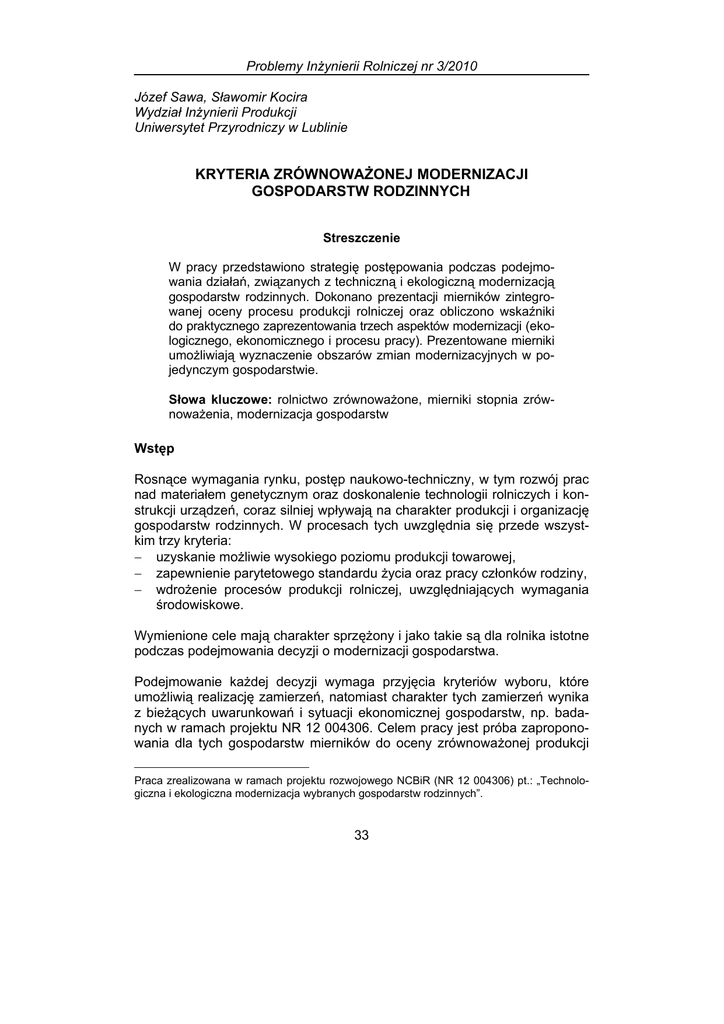 Problemy Inżynierii Rolniczej nr 3/2010 Józef Sawa, Sławomir Kocira Wydział Inżynierii Produkcji Uniwersytet Przyrodniczy w Lublinie KRYTERIA ZRÓWNOWAŻONEJ MODERNIZACJI GOSPODARSTW RODZINNYCH1 Streszczenie W pracy przedstawiono strategię postępowania podczas podejmowania działań, związanych z techniczną i ekologiczną modernizacją gospodarstw rodzinnych. Dokonano prezentacji mierników zintegrowanej oceny procesu produkcji rolniczej oraz obliczono wskaźniki do praktycznego zaprezentowania trzech aspektów modernizacji (ekologicznego, ekonomicznego i procesu pracy). Prezentowane mierniki umożliwiają wyznaczenie obszarów zmian modernizacyjnych w pojedynczym gospodarstwie. Słowa kluczowe: rolnictwo zrównoważone, mierniki stopnia zrównoważenia, modernizacja gospodarstw Wstęp Rosnące wymagania rynku, postęp naukowo-techniczny, w tym rozwój prac nad materiałem genetycznym oraz doskonalenie technologii rolniczych i konstrukcji urządzeń, coraz silniej wpływają na charakter produkcji i organizację gospodarstw rodzinnych. W procesach tych uwzględnia się przede wszystkim trzy kryteria: − uzyskanie możliwie wysokiego poziomu produkcji towarowej, − zapewnienie parytetowego standardu życia oraz pracy członków rodziny, − wdrożenie procesów produkcji rolniczej, uwzględniających wymagania środowiskowe. Wymienione cele mają charakter sprzężony i jako takie są dla rolnika istotne podczas podejmowania decyzji o modernizacji gospodarstwa. Podejmowanie każdej decyzji wymaga przyjęcia kryteriów wyboru, które umożliwią realizację zamierzeń, natomiast charakter tych zamierzeń wynika z bieżących uwarunkowań i sytuacji ekonomicznej gospodarstw, np. badanych w ramach projektu NR 12 004306. Celem pracy jest próba zaproponowania dla tych gospodarstw mierników do oceny zrównoważonej produkcji Praca zrealizowana w ramach projektu rozwojowego NCBiR (NR 12 004306) pt.: „Technologiczna i ekologiczna modernizacja wybranych gospodarstw rodzinnych”. 33 Józef Sawa, Sławomir Kocira rolniczej oraz określenia czynników, które umożliwią ocenę występujących tam procesów produkcji rolniczej przed podjęciem albo w chwili podejmowania decyzji o ich modernizacji. Założono, że forma modernizacji gospodarstw będzie zgodna z koncepcją zrównoważonego rozwoju (w tym rolnictwa zrównoważonego) oraz z dyrektywą w sprawie zintegrowanego zapobiegania i ograniczenia zanieczyszczeń środowiskowych [Dyrektywa 96/61/EC]. Tak postawiony cel i zakres pracy powodują konieczność przyjęcia pewnego algorytmu postępowania w ocenie kierunku modernizacji badanych gospodarstw, ale jest oczywiste, że kierunek tych zmian będzie specyficzny dla każdego gospodarstwa. W pracy wykorzystano wyniki badań realizowanych w projekcie PB-KBN. P06R 037 22 oraz w ramach badań FADN [Sawa 2009; Sawa i in. 2004; Wyniki... 2007; Wójcicki 2009]. Strategia technologicznej modernizacji gospodarstw System produkcji rolniczej i procesy produkcyjne, stanowiące jego pochodne, są wynikiem świadomych działań rolnika, ukierunkowanych na uzyskanie zamierzonego efektu produkcyjnego i ekonomicznego. Działania te powinny być wyrazem aktywnego wykorzystania „praktyki rolniczej”, wynikającej nie tyle z nabytego doświadczenia w okresie prowadzenia gospodarstwa, ile z szerokiej wiedzy, nabytych kwalifikacji i przekonań rolnika (motywacji) co do słuszności realizowanych celów. Rolnicy dążą do uzyskania zamierzonego efektu przez udział w obrocie surowcami rolniczymi na konkurencyjnych rynkach. Możliwości obrotu są warunkowane jakością oferowanych surowców i ich właściwościami, które obejmują: − powszechny dostęp do relatywnie tanich surowców rolniczych, spełniających standardy jakości; − minimalizację społecznych kosztów produkcji rolniczej; − realizację procesów produkcji rolniczej na bazie ekologicznie bezpiecznych technologii produkcji. Z powyższych względów realizacja procesu produkcji rolniczej, w którym uwzględniono zagrożenia środowiskowe, stawia inne wymagania co do poziomu i sposobów stosowania nakładów materiałowo-energetycznych od przyjmowanych zazwyczaj w intensywnych technologiach. Technologie produkcji rolniczej, w których uwzględniono nie tylko postęp w zakresie środków produkcji i technicznych rozwiązań stosowanych środków mechanizacji, ale także ich pozytywny wpływ na środowisko, są nowoczesne w aspekcie aktualnych oczekiwań społecznych. Wdrożenie tych technologii wiąże się jednak z koniecznością modernizacji gospodarstw, której zakres powinien mieć charakter zintegrowany, a więc spełniający ekonomiczne i socjalne oczekiwania rodziny rolnika oraz skutkować pozytywnym wpływem na środowisko i społeczności nie tylko na obszarach wiejskich. 34 Kryteria zrównoważonej modernizacji gospodarstw rodzinnych Przystępując do rozważań o kierunkach modernizacji gospodarstwa, należy dokonać opisu jego aktualnej działalności. Zasady przeprowadzania tego opisu podaje metodyka projektu rozwojowego NR 12 004306 [Wójcicki i in. 2009]. Przyjmując powyższe założenia, w celu określenia punktu wyjścia do modernizacji gospodarstw wyróżniono trzy obszary, które należy zidentyfikować, a następnie ocenić za pomocą zaproponowanych sprzężonych (zintegrowanych) mierników do oceny wdrażania rozwiązań technicznych i organizacyjnych w rolnictwie. Oceny te powinny być zgodne z Dyrektywą 96/61/EC i związanymi z nią dokumentami referencyjnymi BREFs (BAT – najlepsze dostępne techniki). Wstępna ocena powinna obejmować następujące aspekty działalności w gospodarstwie: − ograniczenie zagrożeń środowiska i wobec społeczności obszarów wiejskich przez dostępne technologie stosowane w rolnictwie; − zachowanie socjalnych standardów i warunków pracy rodziny rolnika; − parytetu dochodów gospodarstw z obszarów wiejskich w odniesieniu do pozostałych gospodarstw domowych w d
