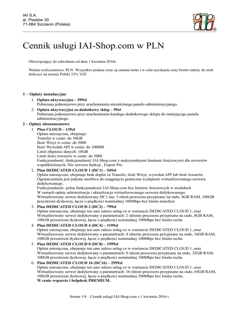 IAI S.A. al. Piastów 30 71-064 Szczecin (Polska) Cennik usługi IAI-Shop.com w PLN Obowiązujący do odwołania od dnia 1 kwietnia 2016r. Waluta rozliczeniowa: PLN. Wszystkie podane ceny są cenami netto i w celu uzyskania ceny brutto należy do nich doliczyć na terenie Polski 23% VAT. 1 – Opłaty instalacyjne 1. Opłata aktywacyjna – 599zł Pobierana jednorazowo przy uruchomieniu niezależnego panelu administracyjnego. 2. Opłata aktywacyjna za dodatkowy sklep – 99zł Pobierana jednorazowo przy uruchomieniu każdego dodatkowego sklepu do istniejącego panelu administracyjnego. 2 – Opłaty abonamentowe 1. Plan CLOUD – 139zł Opłata miesięczna, obejmuje: Transfer w cenie: do 30GB Ilość Wizyt w cenie: do 5000 Ilość Wywołań API w cenie: do 100000 Limit objętości danych: 10GB Limit ilości towarów w cenie: do 5000 Funkcjonalność: funkcjonalność IAI-Shop.com z maksymalnymi limitami ilościowymi dla serwerów współdzielonych. Nie zawiera funkcji , Export Pro 2. Plan DEDICATED CLOUD 1 (DC1) – 549zł Opłata miesięczna, obejmuje brak dopłat za Transfer, ilość Wizyt, wywołań API lub ilość towarów. Ograniczeniem jest jedynie możliwa do osiągnięcia graniczna wydajność wirtualizowanego serwera dedykowanego. Funkcjonalność: pełna funkcjonalność IAI-Shop.com bez limitów ilościowych w modułach W ramach opłaty administracja i aktualizacja wirtualizowanego serwera dedykowanego. Wirtualizowany serwer dedykowany DC1 ma: 1 rdzeń procesora przypisany na stałe, 4GB RAM, 100GB przestrzeni dyskowej, łącze o prędkości nominalnej 100Mbps bez limitu transferu 3. Plan DEDICATED CLOUD 2 (DC2) – 799zł Opłata miesięczna, obejmuje ten sam zakres usług co w wariancie DEDICATED CLOUD 1, oraz Wirtualizowany serwer dedykowany o parametrach: 2 rdzenie procesora przypisane na stałe, 8GB RAM, 100GB przestrzeni dyskowej, łącze o prędkości nominalnej 100Mbps bez limitu ruchu 4. Plan DEDICATED CLOUD 4 (DC4) – 1199zł Opłata miesięczna, obejmuje ten sam zakres usług co w wariancie DEDICATED CLOUD 1, oraz Wirtualizowany serwer dedykowany o parametrach: 4 rdzenie procesora przypisane na stałe, 16GB RAM, 100GB przestrzeni dyskowej, łącze o prędkości nominalnej 100Mbps bez limitu ruchu 5. Plan DEDICATED CLOUD 8 (DC8) – 1999zł Opłata miesięczna, obejmuje ten sam zakres usług co w wariancie DEDICATED CLOUD 1, oraz Wirtualizowany serwer dedykowany o parametrach: 8 rdzeni procesora przypisane na stałe, 32GB RAM, 100GB przestrzeni dyskowej, łącze o prędkości nominalnej 100Mbps bez limitu ruchu 6. Plan DEDICATED CLOUD 16 (DC16) – 2999zł Opłata miesięczna, obejmuje ten sam zakres usług co w wariancie DEDICATED CLOUD 1, oraz Wirtualizowany serwer dedykowany o parametrach: 16 rdzeni procesora przypisane na stałe, 64GB RAM, 100GB przestrzeni dyskowej, łącze o prędkości nominalnej 200Mbps bez limitu ruchu. W cenie wsparcie i helpdesk PREMIUM. Strona 1/8 – Cennik usługi IAI-Shop.com z 1 kwietnia 2016 r. IAI S.A. al. Piastów 30 71-064 Szczecin (Polska) 7. Plan DEDICATED CLOUD 32 (DC32) – 4999zł Opłata miesięczna, obejmuje ten sam zakres usług co w wariancie DEDICATED CLOUD 1, oraz Wirtualizowany serwer dedykowany o parametrach: 32 rdzeni procesora przypisane na stałe, 128GB RAM, 100GB przestrzeni dyskowej, łącze o prędkości nominalnej 500Mbps bez limitu ruchu. W cenie wsparcie i helpdesk PREMIUM. 8. Plan DEDICATED CLOUD 64 (DC64) – 8999zł Opłata miesięczna, obejmuje ten sam zakres usług co w wariancie DEDICATED CLOUD 1, oraz Wirtualizowany serwer dedykowany o parametrach: 64 rdzeni procesora przypisane na stałe, 256GB RAM, 100GB przestrzeni dyskowej, łącze o prędkości nominalnej 500Mbps bez limitu ruchu. W cenie wsparcie i helpdesk PREMIUM. 3 – Dopłaty do abonamentu CLOUD ponad limit w ramach abonamentu 1. Dopłata za każdy rozpoczęty 1GB ruchu – 0,50zł 2. Dopłata za każde rozpoczęte 1000 wizyt – 15,0zł Wizyty naliczane są także dla każdego zamówienia z aukcji lub Amazon. 1 zamówienie = 20 wizyt 3. Dopłata za każde rozpoczęte 10000 wywołań API ponad limit - 10zł 4. Dopłata za każde rozpoczęte 5000 dodatkowych towarów ponad limit w ramach abonamentu CLOUD – 50zł 4 – Pakiety wdrożeniowe 1. Pakiet wdrożeniowy BASIC – 1599zł Zawiera pakiet 20 roboczogodzin do wykorzystania przez 90 dni od momentu zatwierdzenia zlecenia, na pracę zespołu wdrożeniowego na przygotowanie projektu strony i kodowanie maski w oparciu o projekt sklepu w formacie PSD. W przypadku dostarczeniu projektu sklepu wykonanego przez klienta, cały czas przeznaczony jest na kodowanie i w przypadku jego niewykorzystania może być zamieniony na inne prace graficzne. 2. Pakiet wdrożeniowy ADVANCED – 2799zł Obejmuje ten sam zakres usług co w pakiecie wdrożeniowym BASIC, ale zawiera 35 roboczogodzin zespołu wdrożeniowego, pozwalając skorzystać również z usług importu i szkolenia. 3. Pakiet wdrożeniowy SOPHISTICATED – 4799zł Obejmuje ten sam zakres usług co w pakiecie wdrożeniowym BASIC, ale zawiera 60 roboczogodzin zespołu wdrożeniowego, pozwalając skorzystać również z usług importu i szkolenia. 4. Pakiet wdrożeniowy SUPREME – 7999zł Obejmuje ten sam zakres usług co w pakiecie wdrożeniowym BASIC, ale zawiera 100 roboczogodzin zespołu wdrożeniowego, pozwalając skorzystać również z usług importu i szkolenia. 5 – Usługi serwisowe 1. Roboczogodzina prac indywidualnych - 90zł/h Roboczogodzina przy pracy nad Maską, Projektem Maski, tłumaczeniami, edycją danych Klienta, imporcie danych lub tworzeniu programu do importu danych z zewnętrznej bazy danych, w tym innego sklepu internetowego, nietypowej konfiguracji serwera przez administratora w zakresie np. przekierowań, domen itp. Usługa dostępna w trybie Express w cenie 65zł za każde rozpoczęte pół godziny. 2. Roboczogodzina szkolenia z prowadzenia sprzedaży w oparciu o IAI-Shop.com w miejscu organizacji szkoleń – 75zł O
