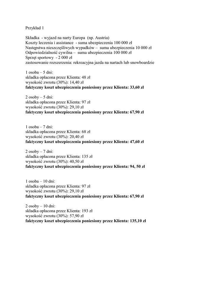 Przykład 1 Składka - wyjazd na narty Europa (np. Austria) Koszty leczenia i assistance - suma ubezpieczenia 100 000 zł Następstwa nieszczęśliwych wypadków – suma ubezpieczenia 10 000 zł Odpowiedzialność cywilna – suma ubezpieczenia 100 000 zł Sprzęt sportowy - 2 000 zł zastosowanie rozszerzenia: rekreacyjna jazda na nartach lub snowboardzie 1 osoba – 5 dni: składka opłacona przez Klienta: 48 zł wysokość zwrotu (30%): 14,40 zł faktyczny koszt ubezpieczenia poniesiony przez Klienta: 33,60 zł 2 osoby – 5 dni: składka opłacona przez Klienta: 97 zł wysokość zwrotu (30%): 29,10 zł faktyczny koszt ubezpieczenia poniesiony przez Klienta: 67,90 zł 1 osoba – 7 dni: składka opłacona przez Klienta: 68 zł wysokość zwrotu (30%): 20,40 zł faktyczny koszt ubezpieczenia poniesiony przez Klienta: 47,60 zł 2 osoby – 7 dni: składka opłacona przez Klienta: 135 zł wysokość zwrotu (30%): 40,50 zł faktyczny koszt ubezpieczenia poniesiony przez Klienta: 94, 50 zł 1 osoba – 10 dni: składka opłacona przez Klienta: 97 zł wysokość zwrotu (30%): 29,10 zł faktyczny koszt ubezpieczenia poniesiony przez Klienta: 67,90 zł 2 osoby – 10 dni: składka opłacona przez Klienta: 193 zł wysokość zwrotu (30%): 57,90 zł faktyczny koszt ubezpieczenia poniesiony przez Klienta: 135,10 zł Przykład 2 Składka - wyjazd na narty Świat (np. USA) Koszty leczenia i assistance - suma ubezpieczenia 100 000 zł Następstwa nieszczęśliwych wypadków – suma ubezpieczenia 10 000 zł Odpowiedzialność cywilna – suma ubezpieczenia 100 000 zł Sprzęt sportowy - 2 000 zł zastosowanie rozszerzenia: rekreacyjna jazda na nartach lub snowboardzie 1 osoba – 5 dni: składka opłacona przez Klienta: 64 zł wysokość zwrotu (30%): 19,20 zł faktyczny koszt ubezpieczenia poniesiony przez Klienta: 44,80 zł 2 osoby – 5 dni: składka opłacona przez Klienta: 128 zł wysokość zwrotu (30%): 38,4 zł faktyczny koszt ubezpieczenia poniesiony przez Klienta: 89,60 zł 1 osoba – 7 dni: składka opłacona przez Klienta: 90 zł wysokość zwrotu (30%): 27 zł faktyczny koszt ubezpieczenia poniesiony przez Klienta: 63 zł 2 osoby – 7 dni: składka opłacona przez Klienta: 180 zł wysokość zwrotu (30%): 54 zł faktyczny koszt ubezpieczenia poniesiony przez Klienta: 126 zł 1 osoba – 10 dni: składka opłacona przez Klienta: 128 zł wysokość zwrotu (30%): 38,40 zł faktyczny koszt ubezpieczenia poniesiony przez Klienta: 89,60 zł 2 osoby – 10 dni: składka opłacona przez Klienta: 257 zł wysokość zwrotu (30%): 77,10 zł faktyczny koszt ubezpieczenia poniesiony przez Klienta: 179,90 zł