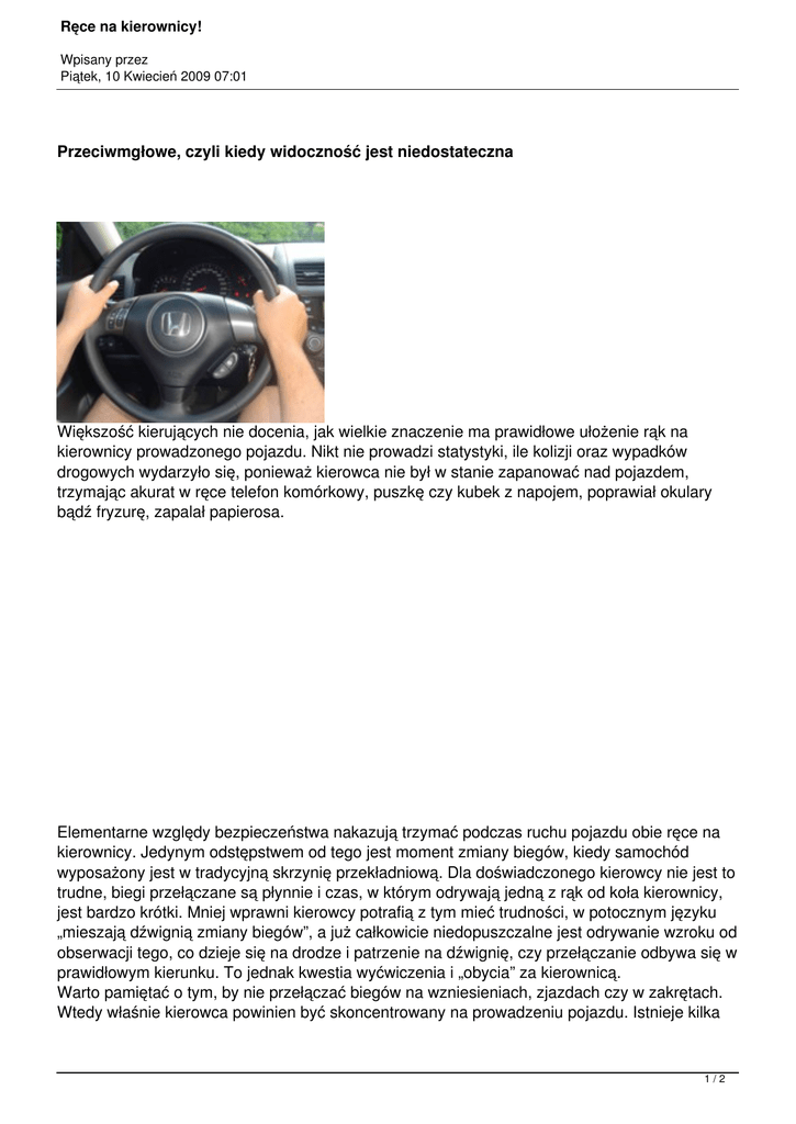 Ręce na kierownicy! Wpisany przez Piątek, 10 Kwiecień 2009 07:01 Przeciwmgłowe, czyli kiedy widoczność jest niedostateczna Większość kierujących nie docenia, jak wielkie znaczenie ma prawidłowe ułożenie rąk na kierownicy prowadzonego pojazdu. Nikt nie prowadzi statystyki, ile kolizji oraz wypadków drogowych wydarzyło się, ponieważ kierowca nie był w stanie zapanować nad pojazdem, trzymając akurat w ręce telefon komórkowy, puszkę czy kubek z napojem, poprawiał okulary bądź fryzurę, zapalał papierosa. Elementarne względy bezpieczeństwa nakazują trzymać podczas ruchu pojazdu obie ręce na kierownicy. Jedynym odstępstwem od tego jest moment zmiany biegów, kiedy samochód wyposażony jest w tradycyjną skrzynię przekładniową. Dla doświadczonego kierowcy nie jest to trudne, biegi przełączane są płynnie i czas, w którym odrywają jedną z rąk od koła kierownicy, jest bardzo krótki. Mniej wprawni kierowcy potrafią z tym mieć trudności, w potocznym języku „mieszają dźwignią zmiany biegów”, a już całkowicie niedopuszczalne jest odrywanie wzroku od obserwacji tego, co dzieje się na drodze i patrzenie na dźwignię, czy przełączanie odbywa się w prawidłowym kierunku. To jednak kwestia wyćwiczenia i „obycia” za kierownicą. Warto pamiętać o tym, by nie przełączać biegów na wzniesieniach, zjazdach czy w zakrętach. Wtedy właśnie kierowca powinien być skoncentrowany na prowadzeniu pojazdu. Istnieje kilka 1/2 Ręce na kierownicy! Wpisany przez Piątek, 10 Kwiecień 2009 07:01 prostych zasad, których wystarczy przestrzegać: przed „wejściem” w zakręt przełączyć już bieg na taki, z którym będziemy z zakrętu wyjeżdżać, z ostrego wzniesienia zjeżdżać na takim biegu, na którym byśmy pod nie wjeżdżali, starać się hamować silnikiem itd. Wracając do ułożenia dłoni na kierownicy. Wielu producentów samochodów tak konstruuje koło kierownicy, że znajdują się na nim charakterystyczne zgrubienia, ułatwiające mocne (nie kurczowe, wtedy dłonie szybko się zmęczą!) trzymanie kierownicy. Gdyby użyć odpowiednika tarczy zegarowej, byłyby to pozycje „za dziesięć druga” lub „za piętnaście trzecia". W takim położeniu obie ręce mają największą możliwość wykonania odpowiedniego manewru pojazdem. Kto nie wierzy, niech to wypróbuje np. na obszernym, pustym parkingu. Przy innym ułożeniu dłoni na kierownicy wykonanie głębokiego skrętu jest już utrudnione i co gorsza, wymaga oderwania rąk od kierownicy. Nowoczesne samochody mają ponadto możliwość regulacji położenia fotela kierowcy i samej kolumny kierownicy, tak, by dłonie znajdowały się poniżej linii barków. Jeśli będzie odwrotnie kierowca będzie siedział bardzo głęboko, w pseudosportowy sposób - ręce i dłonie ulegną szybkiemu zmęczeniu. Na koniec trzy praktyczne porady. Jeżeli już musimy oddać się tytoniowemu nałogowi, napić się czegoś w upalny dzień albo zatelefonować z komórki, zjedźmy na najbliższy parking, zatrzymajmy się i zróbmy to, co chcieliśmy zrobić, nie przerywając jazdy. Przy okazji rozluźnimy napięte mięśnie, zrobimy krótki spacer wokół pojazdu, to pomoże nam w lepszej kondycji kontynuować jazdę. Po drugie: wśród wielu kierowców panuje moda na „luzackie” prowadzenie samochodu jedną ręką, kiedy druga jest oparta o opuszczoną szybę lub podłokietnik. To skrajna nieodpowiedzialność, ponieważ w razie zaistnienia na drodze sytuacji, wymagającej błyskawicznego manewru – np. wyjazd auta z bocznej drogi, wybiegnięcie pieszego na jezdnię, awaria ogumienia - może być już za późno na uchwycenie kierownicy drugą ręką. Stracimy panowanie nad pojazdem i nieszczęście gotowe. Po trzecie: wiele pań lubi poprawiać swą fryzurę podczas prowadzenia samochodu, w czym wielce pomocne są lusterka, zamontowane w osłonach przeciwsłonecznych. Lecz patrząc w lusterko, muszą oderwać wzrok od sytuacji na drodze. Dlatego apelujemy do pań – poprawiajcie urodę na postoju lub podczas oczekiwania na zmianę świateł w sygnalizatorach. Można też założyć okulary przeciwsłoneczne tak, by podtrzymywały włosy. 2/2