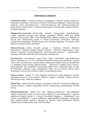 Czasopismo Filozoficzne, nr 4/5 – październik 2009 Informacje o autorach Przemysław Biela – absolwent filozofii i pedagogiki w zakresie animacji społecznokulturalnej. Doktorant w Instytucie Filozofii Uniwersytetu Śląskiego. Zainteresowania naukowe: myśl personalistyczna i fenomenologiczna, idee społeczno-polityczne, dzieje kultury, historiozofia i edukacja aksjologiczna. Pracuje jako animator kultury i instruktor teatralny. Małgorzata Czyszczoń – absolwentka filozofii Uniwersytetu Jagiellońskiego, a także studentka trzeciego roku filologii angielskiej NNKJO TWP pod opieką naukową Uniwersytetu Marii Curie-Skłodowskiej. Obecnie przebywa w Palermo na Sycylii jako beneficjentka grantu w ramach Asystentury Comeniusa. Interesuje się głównie antropologią, filozofią języka oraz literaturą angielska. W wolnym czasie uprawia turystykę pieszą i podróżuje. Marcin Furman – doktor filozofii, pracuje w Katedrze Filozofii Akademii Pomorskiej w Słupsku (Zakład Historii Filozofii i Filozofii Współczesnej). Autor tekstów o tematyce fenomenologicznej. Zainteresowania naukowe – epistemologia, ontologia, filozofia niemiecka (fenomenologia, neokantyzm). Jan Krajczok – mąż Martyny, ojciec Klary, Agaty i Benedykta, wykwalifikowany stolarz i polonista w IV L.O. w Rybniku, absolwent Uniwersytetu Śląskiego. Nieufny wobec słów, nacechowany, miedzy innymi, słabością do Śląska, który go ukształtował i o maleńkiej części którego napisał książkę – „Opowieści o pięknej ziemi i niezwykłych ludziach”. Bez skrupułów wykorzystuje dobra wolę i cierpliwość prof. dr. hab. K. Wieczorka, skutkiem czego nieuchronnie zbliża się do terminu obrony pracy doktorskiej, poświęconej wolności i dobru w koncepcjach Kanta. Łukasz Lamża – student VI roku Międzywydziałowych Indywidualnych Studiów Humanistycznych na Uniwersytecie Śląskim, magister socjologii. Zainteresowania: filozofia przyrody, nauki przyrodnicze. Marta Ples – doktor filozofii, pracuje w Instytucie Filozofii Uniwersytetu Śląskiego. Autorka tekstów z zakresu francuskiej filozofii współczesnej, epistemologii, filozofii kultury. Michał Podstawski – student III roku Międzywydziałowych Indywidualnych Studiów Humanistycznych na Uniwersytecie Śląskim. Z pasji dziennikarz i reporter, publikował między innymi w „Nowym Gwoździu Programu”, „Makulaturze” oraz „Gońcu Górnośląskim”. Laureat kilkunastu ogólnopolskich konkursów literackich. Jego zainteresowania naukowe obracają się głównie wokół problemów filozofii współczesnej, krytyki politycznej i teorii literatury. 197 Czasopismo Filozoficzne, nr 4/5 – październik 2009 Kazimierz Rynkiewicz – doktor habilitowany filozofii, magister teologii. Studia magisterskie na Katolickim Uniwersytecie Lubelskim, doktoranckie na Wyższej Szkole Filozoficznej w Monachium, habilitacyjne na Uniwersytecie Ludwika Maksymiliana w Monachium (LMU). Prywatny docent na LMU, profesor na uczelniach filozoficznych w Polsce. Dziedziny badawcze: epistemologia, fenomenologia, ontologia, etyka, antropologia filozoficzna, estetyka. Michał Stelmach – magister filozofii, doktorant w Instytucie Filozofii Uniwersytetu Śląskiego. Zajmuje się przede wszystkim badaniem myśli Ludwiga Wittgensteina i filozofii Koła Wiedeńskiego. Zainteresowania naukowe: filozofia logiki, filozofia analityczna, oraz wszelkie warianty transcendentalizmu. Oskar Szwabowski – absolwent filozofii Uniwersytetu Szczecińskiego, wierszokleta-grafoman, działacz społeczny. Obecnie pracuje jako pomocnik na budowie. Pisuje do pism różnych: „Fo:pa”, „Kozirynek”, „Ulica Wszystkich Świętych”, „TygiEL”, „Rita Baum”, „Recykling Idei”. Wydał trzy tomiki poezji w małym nakładzie. Obecnie czeka na oficjalny druk zbioru opowiadań oraz na publikację zbioru esejów. Agnieszka Wesołowska – magister filologii polskiej oraz filozofii, doktorantka w Instytucie Filozofii Uniwersytetu Śląskiego. Autorka tekstów o problematyce filozoficznej oraz teoretyczno-literackiej. Od 2008 roku jako członek Zespołu Redakcyjnego współredaguje kwartalnik „Aspekty Filozoficzno-Prozatorskie”. W centrum specjalistycznych zainteresowań: filozofia współczesna, zwłaszcza fenomenologia Husserla. Agata Wilczek – studentka Międzywydziałowych Indywidualnych Studiów Humanistycznych (MISH) na Uniwersytecie Śląskim w Katowicach. W ramach MISH-u studiuje filologię angielską i filozofię: Interesuje się przede wszystkim teoriami podmiotu, fenomenologią, filozofią dialogu oraz mistyką chrześcijańską. Uwielbia podróże, góry i sport. Wawrzyniec Woźniak – ur. 05.05.1986 roku w Lublinie. W 2006 roku ukończył z wyróżnieniem Liceum Plastyczne im. Józefa Pankiewicza w Katowicach. Obecnie jest studentem IV roku na wydziale rzeźby w Krakowskiej Akademii Sztuk Pięknych oraz II roku konserwacji zabytków. W 2009 roku odbył półroczne stypendium w Paryżu w L'École Normale Supérieure des Beaux-Arts. Interesuje się szeroko rozumianą rzeźbą oraz rysunkiem. 198