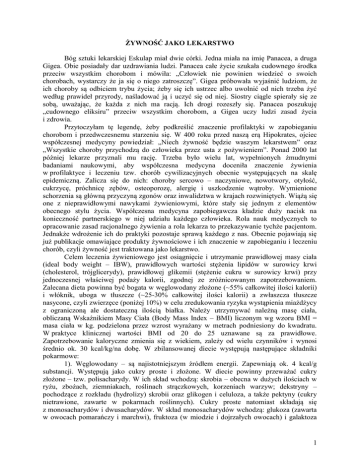 ŻYWNOŚĆ JAKO LEKARSTWO Bóg sztuki lekarskiej Eskulap miał dwie córki. Jedna miała na imię Panacea, a druga Gigea. Obie posiadały dar uzdrawiania ludzi. Panacea całe życie szukała cudownego środka przeciw wszystkim chorobom i mówiła: „Człowiek nie powinien wiedzieć o swoich chorobach, wystarczy że ja się o niego zatroszczę”. Gigea próbowała wyjaśnić ludziom, że ich choroby są odbiciem trybu życia; żeby się ich ustrzec albo uwolnić od nich trzeba żyć według prawideł przyrody, naśladować ją i uczyć się od niej. Siostry ciągle spierały się ze sobą, uważając, że każda z nich ma racją. Ich drogi rozeszły się. Panacea poszukuję „cudownego eliksiru” przeciw wszystkim chorobom, a Gigea uczy ludzi zasad życia i zdrowia. Przytoczyłam tę legendę, żeby podkreślić znaczenie profilaktyki w zapobieganiu chorobom i przedwczesnemu starzeniu się. W 400 roku przed naszą erą Hipokrates, ojciec współczesnej medycyny powiedział: „Niech żywność będzie waszym lekarstwem” oraz „Wszystkie choroby przychodzą do człowieka przez usta z pożywieniem”. Ponad 2000 lat później lekarze przyznali mu rację. Trzeba było wielu lat, wypełnionych żmudnymi badaniami naukowymi, aby współczesna medycyna doceniła znaczenie żywienia w profilaktyce i leczeniu tzw. chorób cywilizacyjnych obecnie występujących na skalę epidemiczną. Zalicza się do nich: choroby sercowo – naczyniowe, nowotwory, otyłość, cukrzycę, próchnicę zębów, osteoporozę, alergię i uszkodzenie wątroby. Wymienione schorzenia są główną przyczyną zgonów oraz inwalidztwa w krajach rozwiniętych. Wiążą się one z nieprawidłowymi nawykami żywieniowymi, które stały się jednym z elementów obecnego stylu życia. Współczesna medycyna zapobiegawcza kładzie duży nacisk na konieczność partnerskiego w niej udziału każdego człowieka. Rola nauk medycznych to opracowanie zasad racjonalnego żywienia a rola lekarza to przekazywanie tychże pacjentom. Jednakże wdrożenie ich do praktyki pozostaje sprawą każdego z nas. Obecnie pojawiają się już publikacje omawiające produkty żywnościowe i ich znaczenie w zapobieganiu i leczeniu chorób, czyli żywność jest traktowana jako lekarstwo. Celem leczenia żywieniowego jest osiągnięcie i utrzymanie prawidłowej masy ciała (ideal body weight – IBW), prawidłowych wartości stężenia lipidów w surowicy krwi (cholesterol, trójglicerydy), prawidłowej glikemii (stężenie cukru w surowicy krwi) przy jednoczesnej właściwej podaży kalorii, zgodnej ze zróżnicowanym zapotrzebowaniem. Zalecana dieta powinna być bogata w węglowodany złożone (~55% całkowitej ilości kalorii) i włóknik, uboga w tłuszcze (~25-30% całkowitej ilości kalorii) a zwłaszcza tłuszcze nasycone, czyli zwierzęce (poniżej 10%) w celu zredukowania ryzyka wystąpienia miażdżycy z ograniczoną ale dostateczną ilością białka. Należy utrzymywać należną masę ciała, obliczaną Wskaźnikiem Masy Ciała (Body Mass Index – BMI) liczonym wg wzoru BMI = masa ciała w kg. podzielona przez wzrost wyrażany w metrach podniesiony do kwadratu. W praktyce klinicznej wartości BMI od 20 do 25 uznawane są za prawidłowe. Zapotrzebowanie kaloryczne zmienia się z wiekiem, zależy od wielu czynników i wynosi średnio ok. 30 kcal/kg/na dobę. W zbilansowanej diecie występują następujące składniki pokarmowe: 1). Węglowodany – są najistotniejszym źródłem energii. Zapewniają ok. 4 kcal/g substancji. Występują jako cukry proste i złożone. W diecie powinny przeważać cukry złożone – tzw. polisacharydy. W ich skład wchodzą: skrobia – obecna w dużych ilościach w ryżu, zbożach, ziemniakach, roślinach strączkowych, korzeniach warzyw; dekstryny – pochodzące z rozkładu (hydrolizy) skrobii oraz glikogen i celuloza, a także pektyny (cukry nietrawione, zawarte w pokarmach roślinnych). Cukry proste natomiast składają się z monosacharydów i dwusacharydów. W skład monosacharydów wchodzą: glukoza (zawarta w owocach pomarańczy i marchwi), fruktoza (w miodzie i dojrzałych owocach) i galaktoza 1 (pochodząca z hydrolizy laktozy). Dwusacharydy składają się z sacharozy (znajdującej się w burakach i trzcinie cukrowej), laktozy (obecnej w mleku) i maltozy (pochodzącej z hydrolizy skrobii). Ludzie (a szczególnie ci zagrożeni cukrzycą) powinni ograniczyć ilość cukrów prostych w diecie, ponieważ powodują one gwałtowny wzrost stężenia cukru we krwi, po ich spożyciu. Cukry proste posiadają wyskoki tzw. wskaźnik glikemiczny. I tak np. wskaźnik glikemiczny ryżu wynosi 83%, a soczewicy 43%. 2). Tłuszcze – są ważnym źródłem energii, dostarczającym około 9 kcal/g substancji. Różnice w rodzaju oraz ilości spożywanych tłuszczów mają istotne skutki metaboliczne. Zaleca się spożycie tłuszczu w ilości około 30% całkowitej wartości dostarczanych w ciągu doby kalorii (w tym około 10 % tłuszczów nasyconych, ~6-8 % tłuszczów wielonienasyconych oraz ~12-14% tłuszczów jednonienasyconych w postaci oliwy z oliwek). Tłuszcze nasycone są najczęściej pochodzenia zwierzęcego (mleko, masło, ser, słonina, tłuste mięsa), ale również znajdują się w dużych ilościach w oleju palmowym i kokosowym. Diety bogate w tłuszcze nasycone sprzyjają rozwojowi miażdżycy (poprzez wzrost stężenia cholesterolu całkowitego i jego frakcji LDL – tzw. „złego cholesterolu”). Tłuszcze nienasycone są pochodzenia roślinnego i zawierają jednonienasycone i wielonienasycone kwasy tłuszczowe. Dieta bogata w jednonienasycone kwasy tłuszczowe (najczęściej w postaci oliwy z oliwek – co charakteryzuje dietę śródziemnomorską) nie powoduje wzrostu poziomu frakcji LDL cholesterolu („złego”), podnosi poziom frakcji HDL („dobrego cholesterolu” – zapobiegającego miażdżycy) oraz obniża poziom trójglicerydów. Równie ważne jest, że poprawia wrażliwo