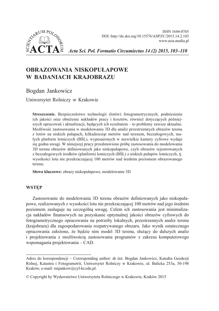 ISSN 1644-0765 DOI: http://dx.doi.org/10.15576/ASP.FC/2015.14.2.103 www.acta.media.pl Acta Sci. Pol. Formatio Circumiectus 14 (2) 2015, 103–110 OBRAZOWANIA NISKOPUŁAPOWE W BADANIACH KRAJOBRAZU Bogdan Jankowicz Uniwersytet Rolniczy w Krakowie Streszczenie. Bezpieczeństwo technologii (lotów) fotogrametrycznych, podniesienie ich jakości oraz obniżenie nakładów pracy i kosztów, również dotyczących późniejszych opracowań i aktualizacji, będących ich rezultatem – to problemy zawsze aktualne. Możliwość zastosowania w modelowaniu 3D dla analiz przestrzennych obrazów terenu z lotów na niskich pułapach, kilkadziesiąt metrów nad terenem, bezzałogowych, małych platform lotniczych (BŚL), wyposażonych w niewielkie kamery cyfrowe wydaje się godna uwagi. W niniejszej pracy przedstawiono próbę zastosowania do modelowania 3D terenu obrazów definiowanych jako niskopułapowe, czyli obrazów rejestrowanych z bezzałogowych środków (platform) lotniczych (BŚL) z niskich pułapów lotniczych, tj. wysokości lotu nie przekraczającej 100 metrów nad średnim poziomem obrazowanego terenu. Słowa kluczowe: obrazy niskopułapowe, modelowanie 3D Wstęp Zastosowanie do modelowania 3D terenu obrazów definiowanych jako niskopułapowe, realizowanych z wysokości lotu nie przekraczającej 100 metrów nad jego średnim poziomem zasługuje na szczególną uwagę. Celem ich zastosowania jest minimalizacja nakładów finansowych na pozyskanie optymalnej jakości obrazów cyfrowych do fotogrametrycznego opracowania na potrzeby lokalnych, przestrzennych analiz terenu (krajobrazu) dla zagospodarowania rozpatrywanego obszaru. Jako wynik ostatecznego opracowania założono, że będzie nim model 3D terenu, służący do dalszych analiz i projektowania z możliwością zastosowania programów z zakresu komputerowego wspomagania projektowania – CAD. Adres do korespondencji – Corresponding author: dr inż. Bogdan Jankowicz, Katedra Geodezji Rolnej, Katastru i Fotogrametrii, Uniwersytet Rolniczy w Krakowie, ul. Balicka 253a, 30-198 Kraków, e-mail: [email protected]. © Copyright by Wydawnictwo Uniwersytetu Rolniczego w Krakowie, Kraków 2015 104 • • • • B. Jankowicz Przyjęta metodyka opracowania charakteryzuje się: minimalizacją kosztów platformy lotniczej (bezzałogowej), zwiększeniem bezpieczeństwa lotu poprzez m.in. ograniczenie udziału człowieka, minimalizacją kosztów pozyskiwania danych (w tym kosztów sensora), ograniczeniem do minimum koniecznych procedur fotogrametrycznych dla otrzymania odpowiedniej jakości obrazów i ich późniejszych opracowań; w szczególnym przypadku – rezygnacja z kalibracji sensora (z uwzględnieniem potrzeb oraz zastosowanej technologii) oraz wykorzystanie aplikacji opartych na wykorzystaniu „chmury punktów”, a także internetowej techniki chmury obliczeniowej, tzw. Cloud Computing, dla automatycznego tworzenia modeli 3D w oparciu o pozyskane (podczas nalotu fotogrametrycznego) obrazy wielkoseryjne z zastosowaniem algorytmu SIFT (Scale Inwariant Feature Transform). Wymienione założenia spełnia cyfrowy system wielkoseryjnej rejestracji obrazów niskopułapowych wraz z oprogramowaniem. Stanowi go platforma lotnicza, wyposażona w kamerę cyfrową (aparat niemetryczny) realizującą zdjęcia z niskiego pułapu lotniczego seryjnie (tzw. rejestracja wielkoseryjna), o co najmniej kilkuminutowym czasie trwania sesji do momentu zapełnienia wysokopojemnej, ultraszybkiej karty pamięci, przy zachowaniu względnej powtarzalności orientacji wewnętrznej, współpracującą z oprogramowaniem do modelowania rzeźby terenu i obiektów. Rejestracja obrazów niskopułapowych i modelowanie 3D jako technologia zintegrowana Różnorodność metod stosowanych zarówno przy pozyskiwaniu danych obrazowych, jak i później, podczas realizacji modelu 3D obiektu, stwarza możliwość wyboru i konieczność optymalizacji przyjętej techniki i metodyki opracowania. W przypadku nalotów fotogrametrycznych dokonywanych z niskiego pułapu zastosowanie systemu na bazie niskokosztowej, bezzałogowej platformy lotniczej, z kamerą cyfrową rejestrującą obrazy w bardzo długich seriach (w badaniach autora – kilkaset sztuk, a perspektywicznie znacznie więcej wraz z rozwojem technologii optoelektronicznych) w połączeniu z zastosowanym oprogramowaniem do modelowania 3D z serii obrazów spełniających ściśle określone parametry (szczególnie warunki pokrycia wspólnego) jest rozwiązaniem nowatorskim. Niewątpliwą zaletą techniki lotniczej „z niskiego pułapu” jest tworzenie dobrego modelu 3D. Zaproponowana technologia wielkoseryjnej rejestracji obrazów niskopułapowych i modelowania 3D dla rozważanych zastosowań stanowi system, będący alternatywą dla tradycyjnych rozwiązań. W wyniku realizacji niskokosztowych lotów na stosunkowo małej wysokości nad terenem pozyskuje się zdjęcia w relatywnie dużej skali, o odpowiedniej precyzji i dokładności. Bardziej opłacalne staje się też zwiększenie częstotliwości aktualizacji pomiaru. Tryb seryjny/wielkoseryjny pracy kamery (ryc. 1.) gwarantuje zdecydowanie lepszą stabilność orientacji wewnętrznej kamery, zwłaszcza odległości obrazowej, która wynika z tego, że w aparatach bez migawki czas ekspozycji (naswietlania) fotodetektorów regulowany jest elektronicznie poprzez odczyt z okresloną częstotliwością zgromadzonych Acta Sci. Pol. Obrazowania niskopułapowe w badaniach krajobrazu 105 w nich ładunków elektrycznych; układ optyczny, a tym samym obiektyw, pozostaje nieruchomy. Zastosowanie migawki w aparacie cyfrowym nie powinno pogarszać wspomnianej stabilności. Ryc. 1.Przykładowe fragmenty szeregów obrazów niskopułapowych, wykonanych w technice wielkoseryjnej Fig. 1. Example of fragments of low-height images, made in long-serial technique Omawiana technologia (ryc. 2) oparta jest na nieskomplikowanej, ale stabilnej platformie lotniczej, wyposażonej w sensor obrazu, 