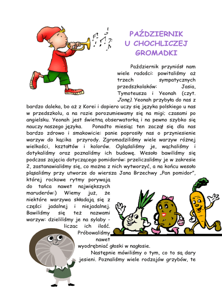 PAŹDZIERNIK U CHOCHLICZEJ GROMADKI Październik przyniósł nam wiele radości: powitaliśmy aż trzech sympatycznych przedszkolaków: Jasia, Tymoteusza i Yeonah (czyt. Jonę). Yeonah przybyła do nas z bardzo daleka, bo aż z Korei i dopiero uczy się języka polskiego u nas w przedszkolu, a na razie porozumiewamy się na migi; czasami po angielsku. Yeonah jest świetną obserwatorką i na pewno szybko się nauczy naszego języka. Ponadto miesiąc ten zaczął się dla nas bardzo zdrowo i smakowicie: panie poprosiły nas o przyniesienie warzyw do kącika przyrody. Zgromadziliśmy wiele warzyw różnej wielkości, kształtów i kolorów. Oglądaliśmy je, wąchaliśmy i dotykaliśmy oraz poznaliśmy ich budowę. Wesoło bawiliśmy się podczas zajęcia dotyczącego pomidorów: przeliczaliśmy je w zakresie 2, zastanawialiśmy się, co można z nich wytworzyć, a na końcu wesoło pląsaliśmy przy utworze do wiersza Jana Brzechwy „Pan pomidor”, której rockowe rytmy porywają do tańca nawet największych maruderów:) Wiemy już, że niektóre warzywa składają się z części jadalnej i niejadalnej. Bawiliśmy się też nazwami warzyw: dzieliliśmy je na sylaby licząc ich ilość. Próbowaliśmy nawet wyodrębniać głoski w nagłosie. Następnie mówiliśmy o tym, co to są dary jesieni. Poznaliśmy wiele rodzajów grzybów, te jadalne i trujące. Segregowaliśmy je według gatunków (maślak, borowik, prawdziwek, kurka, muchomor) i posługiwaliśmy się pojęciami mały, duży, średni. Wiemy już, że aby iść na grzyby, trzeba się na nich bardzo dobrze znać, najlepiej zbierać je tylko z osobami dorosłymi. Dowiedzieliśmy się też, że grzyby mają tylko jedną nóżkę i noszą kapelusze. W czasie spaceru po dywanie zbieraliśmy grzyby musieliśmy być bardzo czujni, bo oprócz prawdziwków i kurek na naszym dywanie wyrosło mnóstwo muchomorów. Zebrane grzyby przeliczaliśmy - swoją drogą nieźli z nas grzybiarze! Odbyliśmy też wiele spacerów na dworze: obserwowaliśmy zmiany zachodzące w przyrodzie – trzeba przyznać, że te jesienne spacery należą do najpiękniejszych. Tyle kolorów i różnorodność ich odcieni sprawia, że aż w głowach może zawirować. Owe spacery były też okazją do zbierania skarbów: kasztanów, żołędzi, liści, którymi później bawiliśmy się, układaliśmy w zbiory, przeliczaliśmy, wystukiwaliśmy rytmy itp. Wiemy już, jak wygląda dąb, kasztanowiec i klon oraz jakie są ich liście, bo na zajęciach dopasowywaliśmy jedne do drugich. Jednak najważniejszym dniem w naszym przedszkolu w tym miesiącu, był DZIEŃ PASOWANIA NA PRZEDSZKOLAKA I DZIEŃ PIECZONEGO ZIEMNIAKA, na który czekaliśmy z niecierpliwością. Nasi rodzice też sumiennie przygotowali się do tego dnia: część z nas upiekła wspólnie z rodzicami pyszne ciasta, rogaliki, a część zaopatrzyła nas w inne słodkości, owoce i napoje do wspólnego stołu... Najpierw Pani Mada przywitała wszystkich przybyłych gości, a później akompaniowała nam przy pianinie, podczas gdy śpiewaliśmy nasze ulubione piosenki przedszkolne: My jesteśmy krasnoludki oraz Poszła Ola. Następnie każdy chochlik został uroczyście pasowany na przedszkolaka przy mocy ogromnej kredki, którą pani dyrektor kładła nam na ramiona – każdy z nas od razy stawał się prawdziwym, dzielnym przedszkolakiem:) Później wystąpili dla nas nasi starsi koledzy z grupy Elfy, przedstawiając pieśni i tańce regionalne w przepięknych ludowych strojach, przy nostalgicznych dźwiękach skrzypiec pani Magdy oraz pełnych werwy tonach akordeonu pana Andrzeja. W dalszej części naszego spotkania wystąpili nasi rodzice, wcielając się w role bohaterów „Rzepki” Juliana Tuwima. Po krótkim biesiadowaniu odbyła się druga część uroczystości, a jej głównym bohaterem był ziemniak – po wysłuchaniu krótkiej historyjki o nim wzięliśmy udział w konkurencjach sprawnościowych, w których głównym przyborem był kartofel właśnie – rzucaliśmy nim do celu, biegaliśmy slalomem z rodzicami, niosąc go na łyżce, aby na końcu zrobić z niego stempelki, służące do wykonania rodzinnych herbów. W przerwach pląsaliśmy przy „Chusteczce haftowanej” i „Jaworze”, czerpiąc radość ze wspólnego przebywania z naszymi bliskimi. Pragniemy BARDZO PODZIĘKOWAĆ wszystkim naszym rodzicom za ich wkład w organizację uroczystości i pogratulować umiejętności aktorskich! Liczymy na równie owocną współpracę podczas innych uroczystości przedszkolnych, których na pewno nie zabraknie! W październiku pilnie ćwiczyliśmy na gimnastyce ogólnorozwojowej – podobały nam się szczególnie zajęcia z kocami i slalom z przeszkodami. Ćwiczyliśmy także nasze artykulatory, naśladując odgłosy jesieni: wiatru, deszczu... Na rytmice i zajęciach umuzykalniających uczyliśmy się piosenek związanych z jesienią, ćwiczyliśmy marsz, bieganie i podskoki, bawiliśmy się woreczkami gimnastycznymi, kasztanami, żołędziami, obręczami no i oczywiście instrumentami. Aktywnie słuchaliśmy muzyki podczas zabawy „Łodzie wikingów” oraz „Samoloty”, nieobce są nam więc wszelkie środki transportu:) Z ciekawością i zainteresowaniem wzięliśmy udział w spotkaniu z muzykami Małej Filharmonii – tym razem dane nam było zapoznać się z ogromnym kontrabasem! Powiększyliśmy też zasób słownictwa na zajęciach z j. angielskim, śpiewaliśmy nowe piosenki i wypełnialiśmy pierwsze stronice naszych książek. Wykonaliśmy też – różnymi technikami – kilka prac plastycznych, których efekty można było podziwiać w szatni:) Przed nami kolejny z jesiennych miesięcy, ale na pewno będzie on równie ciekawy i obfitujący w wesołe zabawy, harce przy muzyce czy interesujące zajęcia dydaktyczne:) Do zobaczenia za miesiąc! Piosenki: POLKA FASOLKA 1. Co tam sadzi pan Jeremi? Sadzi w polu fasolę. Po ziarenku bęc, do ziemi, jaki taki plon zbiorę! Ref.