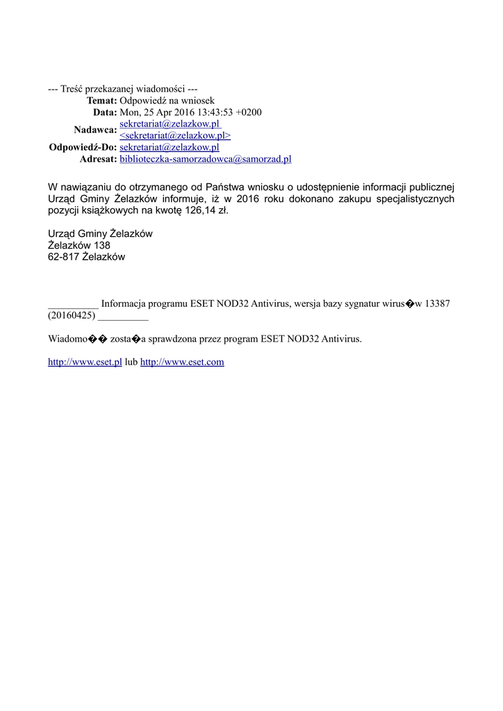 --- Treść przekazanej wiadomości --Temat: Odpowiedź na wniosek Data: Mon, 25 Apr 2016 13:43:53 +0200 [email protected] Nadawca: <[email protected]> Odpowiedź-Do: [email protected] Adresat: [email protected] W nawiązaniu do otrzymanego od Państwa wniosku o udostępnienie informacji publicznej Urząd Gminy Żelazków informuje, iż w 2016 roku dokonano zakupu specjalistycznych pozycji książkowych na kwotę 126,14 zł. Urząd Gminy Żelazków Żelazków 138 62-817 Żelazków __________ Informacja programu ESET NOD32 Antivirus, wersja bazy sygnatur wirus�w 13387 (20160425) __________ Wiadomo�� zosta�a sprawdzona przez program ESET NOD32 Antivirus. http://www.eset.pl lub http://www.eset.com