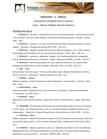 Regionalizm w edukacji Zestawienie bibliograficzne w wyborze Autor : Wanda Stokłosa, Renata Zubowicz Wydawnictwa zwarte 1. EDUKACJA regionalna - dziedzictwo kulturowe w zreformowanej szkole : materiały dla nauczycieli : praca zbiorowa / pod red. Stefana Bednarka ; Ministerstwo Edukacji Narodowej. - Wrocław : "Silesia", 2000. - 188 s. 2. EDUKACJA regionalna / red. nauk. Anna Weronika Brzezińska, Aleksandra Hulewska, Justyna Słomska. - Warszawa : Wydawnictwo Naukowe PWN, 2006. - 456, [2] s. 3. EDUKACJA regionalna : poradnik dla nauczycieli szkoły podstawowej / [aut. Andrzej Łobaza, Bożena Magoń, Zofia Piwońska] ; pod red. Zofii Piwońskiej.-Rzeszów : "Fosze", 2001. - 159, [1] s. 4. EDUKACJA regionalna. 6, Małopolska / [konsult. Anna Pawlikowska-Wójcicka ; Małopolskie Centrum Doskonalenia Nauczycieli w Krakowie]. - Kraków : Wydawnictwo MCDN, cop. 2008. - 193, [1] s. 5. EDUKACJA wobec ładu globalnego/ red. nauk. Tadeusz Lewowicki [et al.] ; Wyższa Szkoła Pedagogiczna Związku Nauczycielstwa Polskiego.- Warszawa : "Żak", cop. 2002. - 452, [1] s. 6. LEW, Irena Kultury Europy w kulturze regionu / Irena Lew, Mieczysław Soppa ; [Muzeum Etnograficzne w Zielonej Górze z/s w Ochli]. - Zielona Góra : Muzeum Etnograficzne, 2011. - 56 s. 7. ŁOBAZA, Andrzej Edukacja regionalna : poradnik dla nauczycieli szkoły podstawowej / Andrzej Łobaza. – Rzeszów : Fosze, 2001. – 159 s. 8. NIKITOWICZ, Jerzy Edukacja regionalna i międzykulturowa/ Jerzy Nikitorowicz.- Warszawa : Wydawnictwa Akademickie i Profesjonalne , cop. 2009.- 529 s. 9. PIETRYKA, Maria Regionalizm w pracy biblioteki szkolnej / wybór Maria Pietryka i Elżbieta Pliszka. – Słupsk : ODN, 2001. – 45 s. 10. PORADNIK dla zwiedzających kulturowo-przyrodniczą ścieżkę edukacyjną na terenie skansenu w Ochli / [oprac. red. Wiesława Biernacka ; aut. art. Henryka Frankiewicz, Wiesława Biernacka, Arleta Konopczyńska]. - Zielona Góra : Muzeum Etnograficzne w Zielonej Górze/zs w Ochli, 2009. - 83, [4] s. 11. PRYCHAŁA, Maria Edukacja regionalna - dziedzictwo kulturowe w regionie (czyli Jak realizowano autorski program "Gdy mała ojczyzna jest pograniczem?") / Maria Pyrchała.-Wodzisław Śląski : [Zespół Szkół Technicznych], 2003. – 112 s. 12. RODZINA, młodzież, regionalizm / [kom. red. Aleksander Kociszewski, Anatol Jan Omelaniuk, Władysław Pilarczyk] ; Rada Krajowa Regionalnych Towarzystw Kultury, Krajowy Ośrodek Dokumentacji Regionalnych Towarzystw Kultury. - Ciechanów : KODRTK, 2000. - 155, [1] s. 13. ROLA edukacji regionalnej w kształtowaniu postaw patriotycznych : konferencja naukowodydaktyczna, 22 marca 2007 r., Dom Technika "Zameczek" w Siemianowicach Śląskich / [red. Krystian Hadasz] ; Muzeum Miejskie, Wydział Edukacji Urzędu Miasta, Doradca Metodyczny dla Nauczycieli Historii i WOS w Siemianowicach Śląskich. - Siemianowice Śląskie : Muzeum Miejskie, 2007. - 48 s. Rozprawy w wydawnictwie zwartym 14. CHMIELOWSKA, Wanda Osobliwości powiatu chrzanowskiego : program edukacji regionalnej / Wanda Chmielowska, Maria Miranowicz // W: Edukacja i reforma : nauczyciel i jego program autorski / red. nauk. Jadwiga Kędzierska. – Kraków : Wydaw. Uniwersytetu jagiellońskiego, cop. 2001. – S.85-101 15. KOREPTA, Edyta Kształcenie postaw regionalnych poprzez literaturę piękną / Edyta Korepta // W: Edukacja kulturalna dzieci i młodzieży / red. Bogdan Idzikowski, Ewa Narkiewicz-Niedbalec. – Zielona Góra : Regionalne Centrum Animacji Kultury, 2000. – S.277-283 16. KOREPTA, Edyta Realizacja programu edukacji regionalnej w systemie szkolnym w duchu nowej humanistyki : ( na przykładzie badań przeprowadzonych w wybranych szkołach śląskich) // W: O nowy humanizm w edukacji : materiały nadesłane na ogólnopolską konferencję naukową : (Puławy, 18-20 września 2000 r.) / pod red. Janusza gajdy. – Kraków : Oficyna Wydaw. Impuls, 2000. – S.444-453 17. KRAS-GŁĄB, Anna Małopolski program regionalny „Krakowiaczek ci ja” ? Kras-Głąb Anna, Alina Lipiarz, Małgorzata Markiewicz // W: Edukacja i reforma : nauczyciel i jego program autorski / red. nauk. Jadwiga Kędzierska. – Kraków : Wydaw. Uniwersytetu Jagiellońskiego, cop. 2001. – S.63-84 18. ŁOJEK, Jadwiga Ścieżki edukacyjne w szkole ponadgimnazjalnej / Jadwiga łojek, Violetta Panfil. – Warszawa : Wydawnictwa Szkolne i Pedagogiczne, 2003. – S.175-185: Edukacja regionalna. 19. MOROZ, Zofia Wychowanie regionalne jako element fundamentu europejskiej wspólnoty edukacyjnej / Zofia Moroz // W: Kultura jako fundament wspólnoty edukacyjnej / red. nauk. Anna Sajak. – Kraków : Wydawnictwo Uniwersytetu Jagiellońskiego, cop. 2005. – S.115-119 20. NIKITOROWICZ , Jerzy Wymiary edukacji w dobie globalizacji : (edukacja regionalna, wielokulturowa, międzykulturowa) / Jerzy Nikitorowicz // W: O nowy humanizm w edukacji : materiały nadesłane na ogólnopolską konferencje naukową : ( Puławy, 18-20 września 2000r.) / pod red. Janusza Gajdy. – Kraków : Oficyna Wydaw. Impuls, 2000. – S.320-335 21. PERLIŃSKA, Teresa Dziedzictwo kulturowe w regionie świętokrzyskim – edukacja regionalna / Teresa Perlńska // W: Ścieżki edukacyjne – teoria i praktyka : materiały do wewnątrzszkolnego doskonalenia nauczycieli / pod red. Małgorzaty Suchańskiej. – Kielce : Studio Full Scan, 2001. - S.158-182 22. PÓŁĆWIARTEK, Józef „Dziedzictwo kulturowe w regionie” w ścieżce międzyprzedmiotowej / Józef Półćwiartek // W: Edukacja historyczna w reformowanej szkole : propozycje rozwiązań praktycznych / pod red. Alojzego Zieleckiego. – Kraków : Wydaw. Naukowe Akademii Pedagogicznej, 2000. – ( Nowoczesna Szkoła ; 2 ). – S.73-81 23. PRZEREMBSKA, Violetta Edukacja regionalna w aspekcie dziedzictwa kultury muzycznej : ( na przykładzie łódzkiego środowiska miejskiego) / Violetta Przerembska // W: Wybrane zagadnienia edukacji artystycznej dzieci i młodzieży / red. nauk. Lidia Kataryńczuk-Mania, Juliusz Karc
