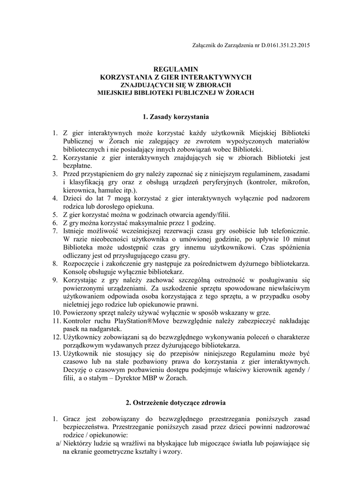 Załącznik do Zarządzenia nr D.0161.351.23.2015 REGULAMIN KORZYSTANIA Z GIER INTERAKTYWNYCH ZNAJDUJĄCYCH SIĘ W ZBIORACH MIEJSKIEJ BIBLIOTEKI PUBLICZNEJ W ŻORACH 1. Zasady korzystania 1. Z gier interaktywnych może korzystać każdy użytkownik Miejskiej Biblioteki Publicznej w Żorach nie zalegający ze zwrotem wypożyczonych materiałów bibliotecznych i nie posiadający innych zobowiązań wobec Biblioteki. 2. Korzystanie z gier interaktywnych znajdujących się w zbiorach Biblioteki jest bezpłatne. 3. Przed przystąpieniem do gry należy zapoznać się z niniejszym regulaminem, zasadami i klasyfikacją gry oraz z obsługą urządzeń peryferyjnych (kontroler, mikrofon, kierownica, hamulec itp.). 4. Dzieci do lat 7 mogą korzystać z gier interaktywnych wyłącznie pod nadzorem rodzica lub dorosłego opiekuna. 5. Z gier korzystać można w godzinach otwarcia agendy/filii. 6. Z gry można korzystać maksymalnie przez 1 godzinę. 7. Istnieje możliwość wcześniejszej rezerwacji czasu gry osobiście lub telefonicznie. W razie nieobecności użytkownika o umówionej godzinie, po upływie 10 minut Biblioteka może udostępnić czas gry innemu użytkownikowi. Czas spóźnienia odliczany jest od przysługującego czasu gry. 8. Rozpoczęcie i zakończenie gry następuje za pośrednictwem dyżurnego bibliotekarza. Konsolę obsługuje wyłącznie bibliotekarz. 9. Korzystając z gry należy zachować szczególną ostrożność w posługiwaniu się powierzonymi urządzeniami. Za uszkodzenie sprzętu spowodowane niewłaściwym użytkowaniem odpowiada osoba korzystająca z tego sprzętu, a w przypadku osoby nieletniej jego rodzice lub opiekunowie prawni. 10. Powierzony sprzęt należy używać wyłącznie w sposób wskazany w grze. 11. Kontroler ruchu PlayStation®Move bezwzględnie należy zabezpieczyć nakładając pasek na nadgarstek. 12. Użytkownicy zobowiązani są do bezwzględnego wykonywania poleceń o charakterze porządkowym wydawanych przez dyżurującego bibliotekarza. 13. Użytkownik nie stosujący się do przepisów niniejszego Regulaminu może być czasowo lub na stałe pozbawiony prawa do korzystania z gier interaktywnych. Decyzję o czasowym pozbawieniu dostępu podejmuje właściwy kierownik agendy / filii, a o stałym – Dyrektor MBP w Żorach. 2. Ostrzeżenie dotyczące zdrowia 1. Gracz jest zobowiązany do bezwzględnego przestrzegania poniższych zasad bezpieczeństwa. Przestrzeganie poniższych zasad przez dzieci powinni nadzorować rodzice / opiekunowie: a/ Niektórzy ludzie są wrażliwi na błyskające lub migoczące światła lub pojawiające się na ekranie geometryczne kształty i wzory. Mogą cierpieć na nie zdiagnozowaną epilepsję lub doświadczać ataków epileptycznych podczas oglądania telewizji lub grania w gry interaktywne. b/ Jeżeli cierpisz na epilepsję, skonsultuj się z lekarzem, zanim zaczniesz grać w gry interaktywne. c/ Nie graj, jeśli odczuwasz zmęczenie lub senność. d/ Graj zawsze w dobrze oświetlonym pomieszczeniu, zachowując bezpieczną odległość od telewizora lub monitora komputera. e/ Przerwij grę, jeśli odczuwasz zawroty głowy, nudności, zmęczenie, jeżeli rozbolała Cię głowa, oczy, uszy lub odczuwasz ból w okolicy dłoni lub ramion. f/ Bezzwłocznie udaj się do lekarza, jeżeli w czasie gry zaobserwujesz u siebie następujące objawy: kłopoty ze wzrokiem, drgawki mięśni, inne mimowolne ruchy, utrata świadomości, zawroty czy konwulsje. Niniejszy regulamin obowiązuje od dnia 01.07.2015 r.