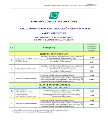 Załącznik nr 4 do Uchwały Nr 126/2016 Zarządu BS w Lubartowie z dnia 21 września 2016 roku BANK SPÓŁDZIELCZY W LUBARTOWIE TABELA OPROCENTOWANIA PRODUKTÓW KREDYTOWYCH KARTY KREDYTOWE OBOWIĄZUJĄCA W BS W LUBARTOWIE OD DNIA Lp. 1 PAŹDZIERNIKA 2016 ROKU Rodzaj karty oprocentowanie zmienne (%), w stosunku rocznym KLIENCI INDYWIDUALNI 1. 2. Karta kredytowa VISA Classic/ BPS Visa Credit Karta kredytowa Visa Gold transakcje gotówkowe, bezgotówkowe, spłaty zadłużenia w innych bankach oraz przelewy z karty plan ratalny „Praktyczna rata” * zadłużenie przeterminowane 9,50 transakcje gotówkowe, bezgotówkowe, spłaty zadłużenia w innych bankach oraz przelewy z karty 10,00 plan ratalny „Praktyczna rata” * 9,50 2-krotność odsetek ustawowych za opóźnienie 3. 10,00 czterokrotność wysokości stopy kredytu lombardowego Narodowego Banku Polskiego (NBP), lecz nie więcej niż 2-krotność odsetek ustawowych za opóźnienie 14,00 10,00** KLIENCI INSTYTUCJONALNI 1. Karta kredytowa VISA Business Credit 2. Karta kredytowa VISA Business Credit Gold Działalność pozarolnicza transakcje gotówkowe, bezgotówkowe oraz spłaty zadłużenia w innym banku transakcje gotówkowe, bezgotówkowe oraz spłaty zadłużenia w innym banku 2-krotność odsetek ustawowych za opóźnienie 3. * zadłużenie przeterminowane czterokrotność wysokości stopy kredytu lombardowego Narodowego Banku Polskiego (NBP), lecz nie więcej niż 2-krotność odsetek ustawowych za opóźnienie kwota objęta planem ratalnym „Praktyczna rata” nie może być niższa niż 300,00 zł ** dotyczy umów zawieranych do 26 stycznia 2016 roku 10,00 10,00 14,00 10,00**