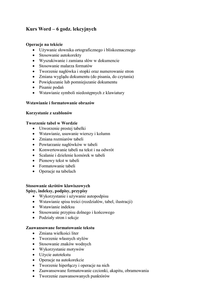 Kurs Word – 6 godz. lekcyjnych Operacje na tekście Używanie słownika ortograficznego i bliskoznacznego Stosowanie autokorekty Wyszukiwanie i zamiana słów w dokumencie Stosowanie malarza formatów Tworzenie nagłówka i stopki oraz numerowanie stron Zmiana wyglądu dokumentu (do pisania, do czytania) Powiększanie lub pomniejszanie dokumentu Pisanie podań Wstawianie symboli niedostępnych z klawiatury Wstawianie i formatowanie obrazów Korzystanie z szablonów Tworzenie tabel w Wordzie Utworzenie prostej tabelki Wstawianie, usuwanie wierszy i kolumn Zmiana rozmiarów tabeli Powtarzanie nagłówków w tabeli Konwertowanie tabeli na tekst i na odwrót Scalanie i dzielenie komórek w tabeli Pionowy tekst w tabeli Formatowanie tabeli Operacje na tabelach Stosowanie skrótów klawiszowych Spisy, indeksy, podpisy, przypisy Wykorzystanie i używanie autopodpisu Wstawianie spisu treści (rozdziałów, tabel, ilustracji) Wstawianie indeksu Stosowanie przypisu dolnego i końcowego Podziały stron i sekcje Zaawansowane formatowanie tekstu Zmiana wielkości liter Tworzenie własnych stylów Stosowanie znaków wodnych Wykorzystanie motywów Użycie autotekstu Operacje na autokorekcie Tworzenie hiperłączy i operacje na nich Zaawansowane formatowanie czcionki, akapitu, obramowania Tworzenie zaawansowanych punktórów Układanie tekstu w kolumny Wykorzystanie paska rysowania (autokształty, kliparty, diagramy) Kurs Excel – 6 godz. lekcyjnych Podstawowe operacje w Excelu Zaznaczanie komórek, kolumn, wierszy i arkuszy Kursory w Excelu i ich użycie Serie danych i listy niestandardowe Dopasowanie szerokości kolumn i wysokości wierszy Operacje na kolumnach i wierszach (ukrywanie, blokowanie, wstawianie i usuwanie) Operacje na arkuszach (kopiowanie, przenoszenie, usuwanie i wykonywanie obliczeń między nimi) Skróty klawiszowe Stosowanie komentarzy Formatowanie tabeli w Excelu Formatowanie czcionki w komórkach Zmiana formatu liczbowego ( waluta, procent, liczba, data) Wykonywanie obramowania i formatowanie go Czyszczenie formatowania Kopiowanie formatowania Autoformatowanie tabeli Wykonywanie obliczeń w Excelu Podstawowe formuły w Excelu Wykorzystanie paska formuł Funkcje (Suma, Średnia, Max, Min, Ile.liczb, Zaokr) Wykonywanie operacji na datach, liczbach i tekstach Wykorzystanie wklejania specjalnego Używanie formuły logicznej Jeżeli Adresowanie względne, bezwzględne i mieszane Zarządzanie danymi Zamiana tekstu w komórkach Sprawdzanie poprawności danych Filtrowanie danych Sortowanie danych Ochrona arkusza Drukowanie w Excelu Dzielenie dokumentu na strony Zmiana wielkości marginesów i orientacji strony Tworzenie nagłówka i stopki Drukowanie fragmentu tabeli Wybór obiektów do drukowania Kurs Powerpoint – 4 godz. lekcyjne Tworzenie prezentacji Zasady tworzenia prezentacji Ważne operacje na slajdach (kopiowanie, przenoszenie, ukrywanie, usuwanie) Obsługa pasków narzędzi :standardowy, formatowanie, rysowania, tworzenie konspektu. Uruchamianie prezentacji i jej obsługa Sposoby zapisu prezentacji i jej drukowanie Tworzenie prezentacji przenośnych Tworzenie nagłówka i stopki w różnych widokach Powerpoint Rodzaje układów slajdów Formatowanie prezentacji Formatowanie tła, efekty wypełnienia slajdów, projekt slajdu Formatowanie punktorów Formatowanie czcionki i akapitu Tworzenie własnych wzorców slajdu Tworzenie stron notatek Tworzenie materiałów informacyjnych Wstawianie i formatowanie symboli Wykorzystanie paska narzędzi rysowania Wstawianie autokształtów (kształty, linie) i operacje na nich Wstawianie obrazka, cliparta i formatowanie go Wykorzystanie gifów Napisy trójwymiarowe – WordArt Stosowanie siatki i prowadnic Obiekty Wstawianie diagramów, wykresów, tabeli, filmów, zdjęć Wstawianie tabel Excela i Worda Wstawianie wykresów Excela Przyciski akcji i ich wykorzystanie Tworzenie i używanie hiperłączy