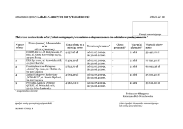 oznaczenie sprawy L.dz.III.G.212/7/09 (nr 3/U/KM/2009) DRUK ZP-12 Pieczęć zamawiającego Zbiorcze zestawienie ofert/ofert wstępnych/wniosków o dopuszczenie do udziału w postępowaniu * Numer oferty 1 2 3 4 5 Firma (nazwa) lub nazwisko oraz adres wykonawcy COMPLEX S.C. Z. Gołębiowski, P. Biss, ul. Grota Roweckiego 12/15, 49-300 Brzeg ERA Sp. z o.o., ul. Katowicka 16B, 41-500 Chorzów Przedsiębiorstwo Usługowe „Jarexs” Sp. z o.o., ul. Okólna 1A, 59-220 Legnica Zakład Usługowo-Budowlany „WIW-BUD”, ul. Karola Myrka 6, 59-220 Legnica Prywatna Agencja Ochrony QUEST, Al. Wolności 7a/6, 55-231 Jelcz-Laskowice Cena oferty za 1 miesiąc netto Okres gwarancji* Termin wykonania* Warunki płatności* Wartość oferty netto 4 957,68 zł od 02.07.2009r. do 30.06.2010r. - 21 dni 59 492,16 zł 6 479,20 zł od 02.07.2009r. do 30.06.2010r. od 02.07.2009r. do 30.06.2010r. - 21 dni 77 750,40 zł - 21 dni 69 992,36 zł 4 659,20 zł od 02.07.2009r. do 30.06.2010r. - 21 dni 55 910,40 zł 4 968,00 zł od 02.07.2009r. do 30.06.2010r. - 21 dni 59 616,00 zł 5 832,70 zł *-niepotrzebne skreślić Prokurator Okręgowy Katarzyna Boć-Orzechowska ……………………………………………………………. (podpis osoby sporządzającej protokół) numer strony 1 .………………………………………………………… (data i podpis kierownika zamawiającego lub osoby upoważnionej) oznaczenie sprawy L.dz.III.G.212/7/09 (nr 3/U/KM/2009) 6 7 8 9 10 11 12 Muliservice Sp. z o.o., ul. Medyczna 8, 09-400 Płock Formacja Spółka Cywilna Wojciech Nosek, Ireneusz Krzyżanowski, ul. Klimasa 2, 41-800 Zabrze GWARANT Agencja Ochrony Spółka Akcyjna, ul. J. Cygana 2, 45-131 Opole Agencja Ochrony Osób i Mienia GUARD-SERVICE Spółka z o.o., ul. Tatrzańska 6a, 60-413 Poznań Agencja Detektywistyczna „MASADA” Danuta Alkanin, ul. Kazimierza Wielkiego 67, 50077 Wrocław DGP DOZORBUD Grupa Polska Sp. z o.o., ul. Najść. Marii Panny 5e, 59-220 Legnica Centrum Ochrony SECURITY Sp. z o.o., ul. Jabłoniowa 5a, 41200 Sosnowiec 4 577,10 zł 5 226,80 zł od 02.07.2009r. do 30.06.2010r. od 02.07.2009r. do 30.06.2010r. DRUK ZP-12 - 21 dni 54 925,18 zł - 21 dni 62 721,64 zł 8 760,00 zł od 02.07.2009r. do 30.06.2010r. - 21 dni 105 120,00 zł 10 788,36 zł od 02.07.2009r. do 30.06.2010r. - 21 dni 129 460,33 zł 6 399,00 zł od 02.07.2009r. do 30.06.2010r. - 21 dni 76 788,00 zł 6 222,00 zł od 02.07.2009r. do 30.06.2010r. 21 dni 74 664,00 zł 5 110,00 zł od 02.07.2009r. do 30.06.2010r. 21 dni 61 320,00 zł *-niepotrzebne skreślić Prokurator Okręgowy Katarzyna Boć-Orzechowska ……………………………………………………………. (podpis osoby sporządzającej protokół) numer strony 2 .………………………………………………………… (data i podpis kierownika zamawiającego lub osoby upoważnionej) oznaczenie sprawy L.dz.III.G.212/7/09 (nr 3/U/KM/2009) 13 14 „ABC-SERVICE” Sp. j. R. Brząkała, R. Gawron, M. Nazaruk, Zakład pracy Chronionej, ul. Bolesławiecka 15, 53-614 Wrocław Agencja Usługowa „KRYZAPROLEX ZARZYCKI” spółka jawna, ul. Ruska 34, 50-079 Wrocław DRUK ZP-12 6 456,24 zł od 02.07.2009r. do 30.06.2010r. 21 dni 77 474,88 zł 5 621,00 zł od 02.07.2009r. do 30.06.2010r. 21 dni 67 452,00 zł *-niepotrzebne skreślić Prokurator Okręgowy Katarzyna Boć-Orzechowska ……………………………………………………………. (podpis osoby sporządzającej protokół) numer strony 3 .………………………………………………………… (data i podpis kierownika zamawiającego lub osoby upoważnionej)