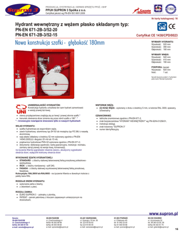 ZARZĄDZANIA SYSTEM PRODUKCJA, DYSTRYBUCJA i SERWIS SPRZĘTU PPOŻ. i BHP PPUH SUPRON 3 Spółka z o.o. Certyfikowany na zgodność z: Certyfikat jakości wg PN-EN ISO 9001:2009 PN-EN ISO 9001:2009 Nr karty katalogowej: 16 Hydrant wewnętrzny z wężem płasko składanym typ: PN-EN 671-2B-3/52-20 PN-EN 671-2B-3/52-15 Certyfikat CE 1438/CPD/0023 Nowa konstrukcja szafki - głębokość 180mm WYMIARY HYDRANTU: Wysokość: 520 mm Szerokość: 390 mm Głębokość: 180 mm WYMIARY WNĘKI: Wysokość: 540 mm Szerokość: 410 mm Głębokość: 190 mm PODPORA: (opcja) Wysokość: 920 mm Ilość: 1 szt. Sposób łączenia podpór z hydrantem patrz karta “Montaż hydrantów” UNIWERSALNOŚĆ HYDRANTÓW: Konstrukcja hydrantu umożliwia ten sam hydrant zamontować w wersji prawej lub lewej. · otwory przyłączeniowe znajdują się po lewej i prawej stronie szafki.* · kierunek otwierania drzwi zmienia się przez obrót szafki o 180°. * * - innowacyjne rozwiązanie stosowane tylko w naszych hydrantach SKŁAD HYDRANTU: · szafka hydrantowa ze wspornikiem węża, · zawór hydrantowy: aluminiowy typ ZH 52 lub mosiężny typ PZ 28U z nasadą aluminiową, · wąż płasko składany o średnicy 52 mm wykonany zgodnie z PN-EN 14540:2005(U) i długości 20 mb lub 15 mb, · prądownica hydrantowa PWh-52 wykonana zgodnie z PN-EN 671-2, · dokumenty: deklaracja zgodności, karta gwarancyjna, instrukcje: montażu, zamiany wersji prawej na wersje lewą, konserwacji, na życzenie Klienta sygnalizator otwarcia zaworu, akustyczny sygnalizator otwarcia drzwi, wyłącznik krańcowy otwarcia drzwi WSPORNIK WĘŻA: · [3] KOSZ WĘŻA - wykonany z drutu o średnicy 5 mm, w kolorze RAL 3000, spawany, uniwersalny OZNAKOWANIE: · tabliczka znamionowa zgodnie z PN-EN 671-2, · znak bezpieczeństwa "HYDRANT WEWNĘTRZNY" wg PN-92/N-01256/01, · instrukcja obsługi, · znak towarowy "SUPRON 3" · numer identyfikacyjny WYKONANIE SZAFKI HYDRANTOWEJ: · STANDARD - z blachy stalowej lakierowanej farbą proszkową poliestrowoepoksydową · INOX - z blachy nierdzewnej - szlif 240, · FASADA - z blachy stalowej ocynkowanej lakierowanej farbą proszkową fasadową Kolorystyka: RAL3000 lub RAL9003 - na życzenie Klienta w dowolnym kolorze z palety barw RAL RODZAJE DRZWI HYDRANTU: · wykonanie pełne z blachy, · z okienkiem z plexi, RODZAJ ZAMKA: · EURO SUPRON 3 - pokrętny z plombą, · PATENT - zamek patentowy z kluczem zapasowym umieszczonym na drzwiczkach, www.supron.pl Serwis: 26-600 RADOM ul. Czachowskiego 4 tel/fax 48 340 01 65 e-mail: [email protected] 26-600 RADOM ul. Czachowskiego 4 tel/fax 48 363 89 98 tel/fax 48 363 99 65 e-mail: [email protected] 03-481 WARSZAWA ul. Szanajcy 16 lok. 56 tel. 22 618 93 63 fax 22 619 80 05 e-mail: [email protected] 61-003 POZNAŃ ul. Chlebowa 4/8 tel. 61 842 23 00 fax 61 840 06 88 e-mail: [email protected] 80-530 GDAŃSK ul. Uczniowska 52 tel. 58 340 03 55, 56 tel/fax 58 342 91 75 e-mail: [email protected] 16 WŁAŚCIWOŚCI HYDRAULICZNE Ciśnienie robocze: od 0,2 MPa do 0,7 MPa Prąd wody rozproszony stożkowy - nie mniejszy niż 45 stopni. UWAGA: Zależność natężenia przepływu Q od ciśnienia P przedstawia równanie: Q=K 10P, gdzie Q wyraża się w litrach/minutę,a P w megapaskalach. PRZYKŁADY NAWINIĘCIA WĘŻA: (TYP WSPORNIKA WĘŻA) [1] [2] WĄŻ NAWINIĘTY NA ZWIJADLE [3] WĄŻ UŁOŻONY WARSTWOWO WĄŻ ZWINIĘTY W PODWÓJNY KRĄG I UMIESZCZONY W KOSZU PRZYKŁADY WYKONANIA SZAFEK STANDARD INOX FRONT INOX FASADA szafka przykładowa - kolor RAL 3000 szafka przykładowa - szlif 240 szafka przykładowa - szlif 240 szafka przykładowa - kolor RAL 9006 RODZAJ ZAMKA EURO PATENT ZESPÓŁ ZAMKA