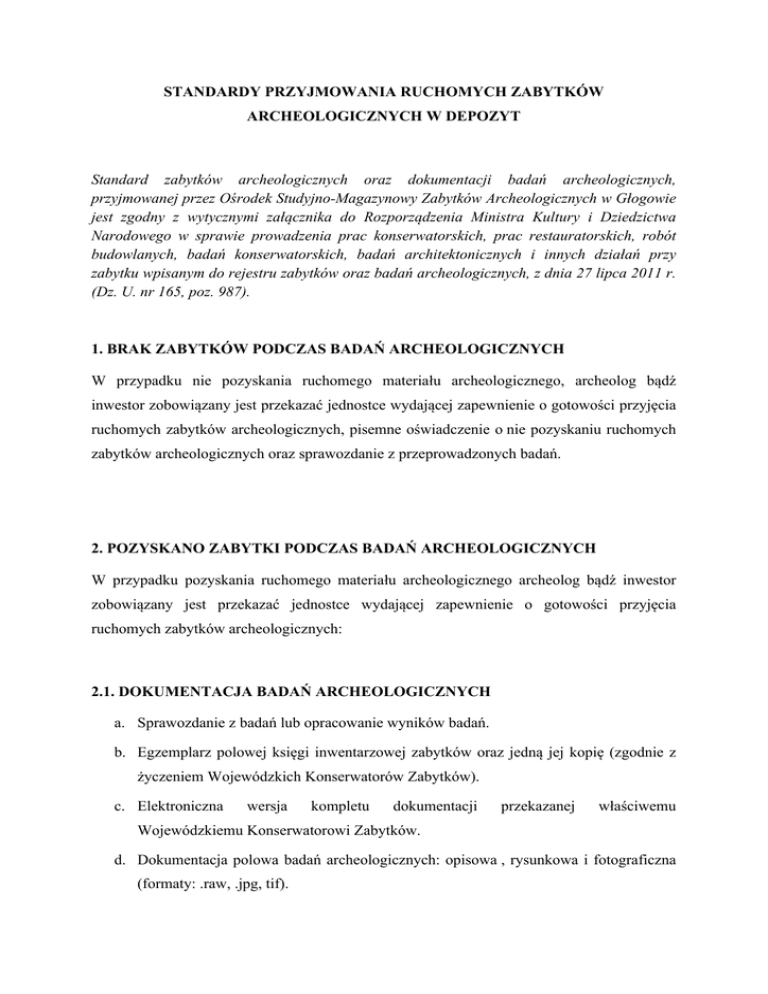 STANDARDY PRZYJMOWANIA RUCHOMYCH ZABYTKÓW ARCHEOLOGICZNYCH W DEPOZYT Standard zabytków archeologicznych oraz dokumentacji badań archeologicznych, przyjmowanej przez Ośrodek Studyjno-Magazynowy Zabytków Archeologicznych w Głogowie jest zgodny z wytycznymi załącznika do Rozporządzenia Ministra Kultury i Dziedzictwa Narodowego w sprawie prowadzenia prac konserwatorskich, prac restauratorskich, robót budowlanych, badań konserwatorskich, badań architektonicznych i innych działań przy zabytku wpisanym do rejestru zabytków oraz badań archeologicznych, z dnia 27 lipca 2011 r. (Dz. U. nr 165, poz. 987). 1. BRAK ZABYTKÓW PODCZAS BADAŃ ARCHEOLOGICZNYCH W przypadku nie pozyskania ruchomego materiału archeologicznego, archeolog bądź inwestor zobowiązany jest przekazać jednostce wydającej zapewnienie o gotowości przyjęcia ruchomych zabytków archeologicznych, pisemne oświadczenie o nie pozyskaniu ruchomych zabytków archeologicznych oraz sprawozdanie z przeprowadzonych badań. 2. POZYSKANO ZABYTKI PODCZAS BADAŃ ARCHEOLOGICZNYCH W przypadku pozyskania ruchomego materiału archeologicznego archeolog bądź inwestor zobowiązany jest przekazać jednostce wydającej zapewnienie o gotowości przyjęcia ruchomych zabytków archeologicznych: 2.1. DOKUMENTACJA BADAŃ ARCHEOLOGICZNYCH a. Sprawozdanie z badań lub opracowanie wyników badań. b. Egzemplarz polowej księgi inwentarzowej zabytków oraz jedną jej kopię (zgodnie z życzeniem Wojewódzkich Konserwatorów Zabytków). c. Elektroniczna wersja kompletu dokumentacji przekazanej właściwemu Wojewódzkiemu Konserwatorowi Zabytków. d. Dokumentacja polowa badań archeologicznych: opisowa , rysunkowa i fotograficzna (formaty: .raw, .jpg, tif). e. Karty ewidencji dla zabytków wydzielonych, zgodnie ze standardem jednostki wydającej pisemne oświadczenie o gotowości przyjęcia w depozyt ruchomych zabytków archeologicznych. f. Karty zabiegów konserwatorskich na zabytkach wydzielonych wraz z 10-letnią gwarancją na wykonane zabiegi konserwatorskie, zgodnie ze standardem jednostki wydającej pisemne oświadczenie o gotowości przyjęcia w depozyt ruchomych zabytków archeologicznych. Dokumentacja rysunkowa badań archeologicznych, karty ewidencji zabytków wydzielonych oraz karty konserwacji winny być zapakowane w teczki ze stabilnej tektury falistej, z możliwością wypełnienia ich do 100 mm grubości o przykładowych wymiarach A3: 47,0 cm x 35,0 cm lub A4: 32,5 cm x 25, 5 cm. Każda taka teczka musi posiadać czytelny opis zawierający nazwę stanowiska i numer wewnętrzny sprawy oraz numer przekazania nadawane przez Ośrodek Studyjno-Magazynowy Zabytków Archeologicznych w Głogowie. 2.2. RUCHOME ZABYTKI ARCHEOLOGICZNE a. POJEMNIKI NA ZABYTKI Pudełka na ruchomy materiał archeologiczny wykonane z twardej tektury falistej. Niezbędna jest również pokrywka/przykrywka. Stabilność pojemników musi umożliwić ich pionowe składowanie, wytrzymując maksymalne obciążenie 20 kg. Optymalne wymiary pudełek to: dł. 17,5 cm x szer. 27,5 cm x wys. 15,5 cm, dł. 26,0 cm x szer. 35,0 cm x wys. 15,5 cm, mniejsze/większe z przykrywkami – na pojedyncze zabytki niewymiarowe b. METRYKI NA POJEMNIKI NA ZABYTKI Pojemniki na ruchome zabytki archeologiczne muszą być trwale oznakowane czytelnie wypełnionymi metrykami. Ośrodek Studyjno-Magazynowy wymaga umieszczenia metryk na dwóch (dłuższym i krótszym) bokach kartonu. Istotne jest oznaczenie na metryczce rodzaju (surowca) materiału archeologicznego znajdującego się wewnątrz pojemnika np. metale, ceramika, polepa, szkło. Przykładowa metryczka na pojemnik zawierający materiał archeologiczny o wymiarach minimalnych 12,5 cm x 6,5 cm, wydrukowana na białym papierze o grubości min. 80 g/m²: METAL Miejscowość.......................................... Stan.................................................... Gmina ....................................................Woj. ................................................... Wykop/ar................................................Warstwa/obiekt.................................. Rok badań .................. Nr inw. ………………………………………..…… Chronologia……………………………………… METALE Stanowisko: Rok badań: Nr inw. H, ar Warstwa Obiekt Przedmiot Chronologia c. METRYCZKI I OPIS ZABYTKÓW Standardem jest również trwałe i prawidłowe oznakowanie ruchomych zabytków archeologicznych poprzez zaopatrzenie ich w wypełnione czytelnie metryczki oraz opisanie zabytków numerami inwentarzowymi (tusz). Metryczka musi być zabezpieczona woreczkiem polietylenowym strunowym. Przykładowa metryczka o wymiarach maksymalnych 10,0 cm x 6,0 cm, na białym papierze o grubości minimalnej 80 g/m²: METRYCZKA Miejscowość ..................................... Stan. ..................................... Przedmiot ........................................................ Ilość ...................... Nr inw. .......................................... Nr kat. ...................................... Wykop/h/ar ................................... Warstwa ................................... Obiekt ........................................... Głębokość ................................. Data .............................................. Wypełnił/a ............................... Wzory dokumentacji badań archeologicznych dostępne są w siedzibie Ośrodka StudyjnoMagazynowego Zabytków Archeologicznych w Głogowie.