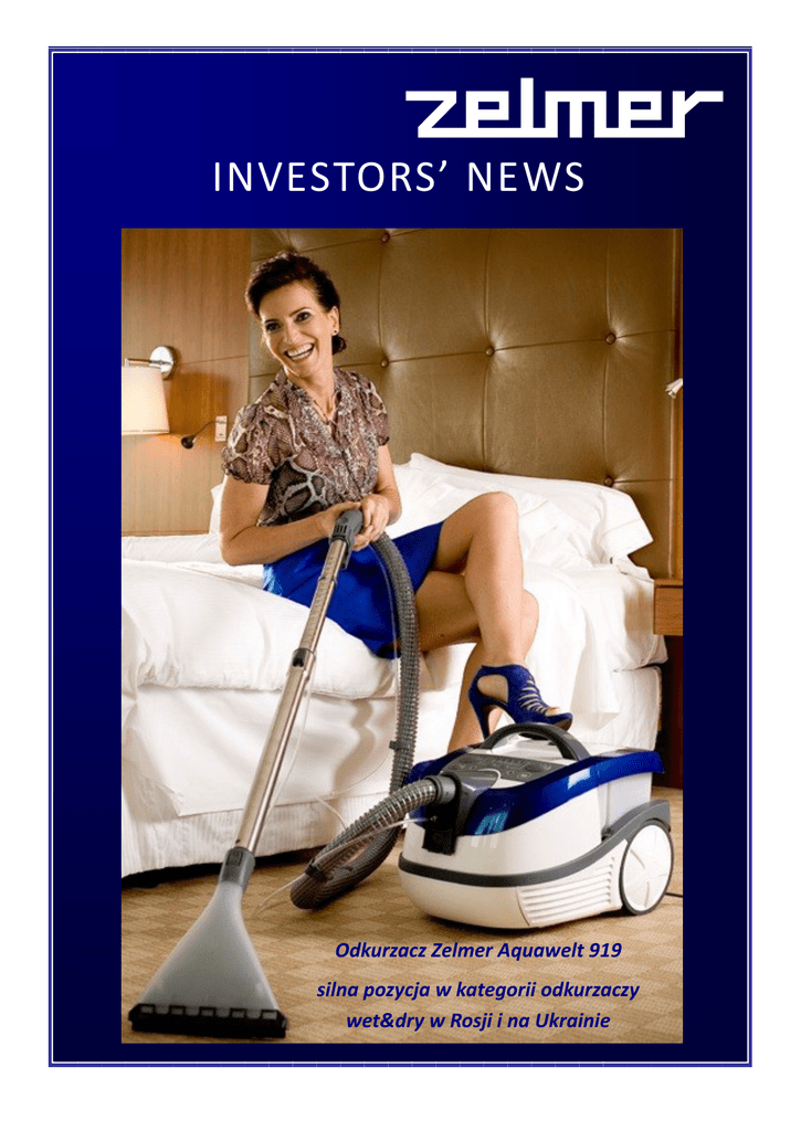 INVESTORS’ NEWS Odkurzacz Zelmer Aquawelt 919 silna pozycja w kategorii odkurzaczy wet&dry w Rosji i na Ukrainie INVESTORS’ NEWS Rok 2011, numer 1 Data wydania 21 luty 2011 roku Tematy wydania: Rozwijamy się, wywiad z Januszem Płocicą, Prezesem Zarządu Zelmer S.A. W nowy rok Zelmer wkroczył z nową inicjatywą. Do inwestorów trafia właśnie pierwsze wydanie newslettera Spółki Investors’ News Chcemy regularnie dzielid się z inwestorami wszystkimi istotnymi informacjami – zarówno dotyczącymi samego Zelmera, jak i rynków, na których działamy oraz trendów w branży. To tym bardziej istotne, że ostatnio sporo się w spółce działo a w kolejnych miesiącach i latach będzie się dziad jeszcze więcej. Zelmer działa już w zupełnie nowej strukturze organizacyjnej… Zgadza się. Poświęciliśmy dużo uwagi temu procesowi, by reorganizacja grupy kapitałowej przebiegła możliwie płynnie i nie zakłóciła w żaden sposób bieżącej działalności spółki. Wszystko odbyło się zgodnie z planem – od 1 stycznia 2011 r. Grupa Zelmer ma strukturę holdingową. W jej ramach oddzielny podmiot zajmuje się produkcją, a oddzielny – sprzedażą i marketingiem. Dokonaliśmy też związanych z tym zmian w strukturach zarządzania. ambitne wyzwania. Ten rok będzie jednak szczególny – z racji wspomnianej wyżej zmiany w strukturach, ale też z tego powodu, że po raz kolejny zamierzamy zwiększyd skalę biznesu i podwyższyd wyniki finansowe. Jakie są przyczyny tych zmian organizacyjnych? Przygotowujemy się do przeniesienia produkcji do nowoczesnego zakładu, który powstaje w SSE Euro - Park Mielec. W październiku 2010 r. odbyła się uroczystośd wmurowania kamienia węgielnego. Zakładamy, że fabryka będzie gotowa wiosną i wtedy rozpoczniemy przeprowadzkę. Od lipca produkcja powinna ruszyd tam pełną parą. To jeden z elementów naszej strategii do 2013 roku, którą podzielimy się z rynkiem już niebawem. Zelmer ma byd nowoczesnym podmiotem, który będzie w stanie elastycznie reagowad na potrzeby klientów. Jednocześnie stawiamy sobie za cel dalszą poprawę efektywności naszej działalności, by skutecznie zwiększad wartośd firmy dla akcjonariuszy, w czym pomoże właśnie m.in. wydzielenie biznesu produkcyjnego i handlowomarketingowego do spółek zależnych. Wygląda na to, że 2011 rok będzie dla Zelmera bardzo pracowity. A jeszcze do tego Zelmer czeka przeprowadzka. Podsumowując: Czeka nas w tym roku wiele wyzwao organizacyjnych, a należy pamiętad, że przede wszystkim zamierzamy dalej umacniad naszą pozycję na kluczowych rynkach, wciąż dostarczad klientom sprzęt najwyższej jakości a inwestorom - satysfakcjonujące wyniki finansowe. Co roku staramy się podejmowad Rozpoczęcie produkcji w nowej fabryce Hala produkcyjna nowej fabryki Zelmer S.A. w Specjalnej Strefie Ekonomicznej w Rogoźnicy pod Rzeszowem już stoi. Zgodnie z harmonogramem pod koniec stycznia osiągnięto stan surowy zamknięty obiektu. Obecnie zakooczono wylewanie posadzek. Jednocześnie kontynuowane są prace montażowe ścianek działowych w części administracyjnej oraz instalowanie niezbędnych systemów m.in. przeciwpożarowego, kanalizacyjnego, instalacji elektrycznych, teleinformatycznych. Zelmer planuje rozpocząd przeprowadzkę do nowego zakładu w kwietniu br. Jest to jedna z największych w Polsce inwestycji tego typu—32 tys. m². Inwestycję realizuje i finansuje Panattoni Europe. Rozwijamy się, wywiad z Prezesem Zarządu Zelmer S.A. Nowa fabryka Zmiany organizacyjne w Grupie Kapitałowej Zelmer Sytuacja finansowa Spółki Zelmer w mediach Marketing i sprzedaż Sytuacja rynkowa Wywiad z dyrektorem ds. Sprzedaży —Wschód Nowa spółka w Grupie Zelmer Nowości produktowe Nagrody i wyróżnienia Raporty bieżące 2011 Nadchodzące wydarzenia INVESTORS’ NEWS Str. 3 Zmiany organizacyjne w Grupie Kapitałowej Zelmer 31 grudnia 2010 r. Zelmer S.A. zbył zorganizowane części przedsiębiorstwa: produkcyjną i komercyjną i wniósł je w postaci wkładów niepieniężnych do spółek w 100 proc. zależnych, tj. do Zelmer PRO sp. z o.o. i Zelmer Market sp. z o.o. Przeprowadzona reorganizacja Grupy Zelmer ma na celu zwiększenie efektywności działalności operacyjnej oraz skali biznesu. Jest to początek realizacji strategii Grupy Zelmer na lata 2011-2013. Do jej głównych założeo należy budowa efektywnej grupy kapitałowej o zasięgu międzynarodowym i szybkie umacnianie pozycji na rynkach Europy Środkowej i Wschodniej, w celu zwiększenia wartości firmy dla akcjonariuszy. Zelmer S.A. przygotowuje strategię Grupy o nazwie ZELMER PROFIT 2013. Jej założenia Zmiany w zarządach spółek z Grupy Zelmer zostaną opublikowane 28 lutego 2011r. Po zmianach Zarząd Zelmer S.A. funkcjonuje w składzie dwuosobowym: z Panem Januszem Płocicą na stanowisku Prezesa Zarządu oraz Panią Magdaleną Bartoś odpowiedzialną za finanse Grupy Zelmer w funkcji Członka Zarządu. Pan Tomasz Modzelewski objął funkcję Prezesa Zarządu Zelmer Market, spółki która od stycznia 2011 jest odpowiedzialna za sprzedaż i marketing. Pan Wiesław Zabłocki pełni funkcję Członka Zarządu w Zelmer PRO odpowiedzialnej za produkcję w Grupie Zelmer. Sytuacja finansowa Po trzech kwartałach 2010 r. Zelmer znacząco zwiększył przychody ze sprzedaży. W porównaniu do roku 2009 nastąpił wzrost sprzedaży o 22%. Spółka zawdzięcza to aktywnemu rozwojowi eksportu, który w trzecim kwartale stanowił 38% przychodów ze sprzedaży. Sprzedaż do Rosji w trzecim kwartale ’10 wzrosła o 143% r/r. Sprzedaż na Ukrainie natomiast wzrosła w tym okresie o 198% r/r. Grupa Zelmer osiągnęła po trzech kwartałach 2010 r. 21 mln PLN zysku netto. Wynik ten jest lepszy od analogicznego okresu roku poprzedniego o 32%. Wykres 1: Przychody ze sprzedaży (mln zł) Źródło: Dane ze Spółki Rok 2011, numer 1 Str. 4 Wyniki finansowe 9m2010 9m2009 Zmiana Przychody ze sprzedaży 415 44