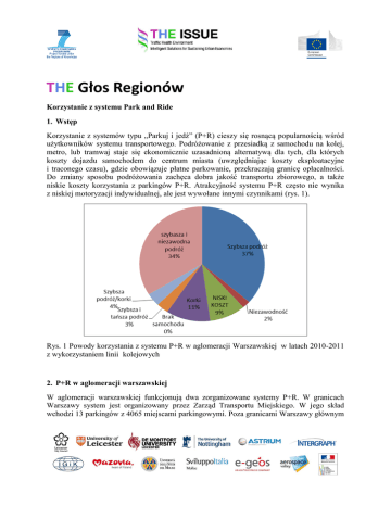 THE Głos Regionów Korzystanie z systemu Park and Ride 1. Wstęp Korzystanie z systemów typu „Parkuj i jedź” (P+R) cieszy się rosnącą popularnością wśród użytkowników systemu transportowego. Podróżowanie z przesiadką z samochodu na kolej, metro, lub tramwaj staje się ekonomicznie uzasadnioną alternatywą dla tych, dla których koszty dojazdu samochodem do centrum miasta (uwzględniając koszty eksploatacyjne i traconego czasu), gdzie obowiązuje płatne parkowanie, przekraczają granicę opłacalności. Do zmiany sposobu podróżowania zachęca dobra jakość transportu zbiorowego, a także niskie koszty korzystania z parkingów P+R. Atrakcyjność systemu P+R często nie wynika z niskiej motoryzacji indywidualnej, ale jest wywołane innymi czynnikami (rys. 1). Rys. 1 Powody korzystania z systemu P+R w aglomeracji Warszawskiej w latach 2010-2011 z wykorzystaniem linii kolejowych 2. P+R w aglomeracji warszawskiej W aglomeracji warszawskiej funkcjonują dwa zorganizowane systemy P+R. W granicach Warszawy system jest organizowany przez Zarząd Transportu Miejskiego. W jego skład wchodzi 13 parkingów z 4065 miejscami parkingowymi. Poza granicami Warszawy głównym organizatorem systemu P+R jest regionalny przewoźnik kolejowy Koleje Mazowieckie (KM). W skład tej części systemu wchodzi 9 parkingów z 800 miejscami dla samochodów (rys. 2). Łącznie system P+R w aglomeracji oferuje 4865 miejsc dla samochodów (w tym 85 dla niepełnosprawnych) i 734 miejsca dla rowerów. Rys. 2 System P+R w aglomeracji warszawskiej Standard systemu na terenie Warszawy jest bardzo wysoki. Aż 7 parkingów to obiekty kubaturowe. Parkingi są organizowane przy stacjach metra, przystankach kolejowych oraz pętlach tramwajowych. Są dobrze oznakowane, dozorowane, ogrodzone i dla stałych użytkowników transportu zbiorowego w zasadzie bezpłatnie (wymagane jest jedynie posiadanie co najmniej biletu dobowego komunikacji miejskiej). Taki standard generuje jednak wysokie koszty inwestycyjne i eksploatacyjne. Koszty budowy jednego miejsca parkingowego na parkingu kubaturowym wahają się w przedziale od 25 do 45 tys. zł. Dużo mniejsze nakłady są ponoszone na realizację parkingów placowych, w zależności od lokalizacji od 3 do 24 tys. zł za miejsce. Wysokie są także koszty eksploatacyjne, które wahają się w Warszawie w przedziale od 1 do 2,5 tys. zł za 1 miejsce P+R rocznie (dane za rok 2012). Nieco inaczej funkcjonuje system P+R poza Warszawą. Parkingi są organizowane przy przystankach kolejowych i wyłącznie w poziomie terenu. Są płatne. Koszt parkowania dla użytkowników kolei wynosi 20zł miesięcznie za samochód lub motocykl i 5 zł za rower. Szacuje się, że koszty realizacyjne systemu organizowanego przez KM nie przekraczają 13 tys. zł za jedno miejsce P+R (dane za I kwartał 2013r). 3. Wykorzystanie parkingów P+R System P+R w Warszawie jest dobrze wykorzystywany. W 2012 roku, średnie wykorzystanie większości parkingów sięgało 100%. W kilku przypadkach (Młociny, Marymont, Wilanowska) zainteresowanie użytkowników przekraczało pojemność parkingów, lub było na granicy jej wyczerpania Skutkowało to m.in. szybkim wyczerpywaniem wolnych miejsc. Na przykład, ze względu na zapełnienie wjazd na parking P+R Młociny jest zamykany ok 8:308:45 rano. ZAJĘTE MIEJSCA WOLNE MIEJSCA - Rys. 3 Struktura wykorzystania parkingów P+R w Warszawie. Słabiej bo w 50% są wykorzystywane parkingi P+R funkcjonujące poza granicami Warszawy. Nie wynika to z małego zainteresowania tą formą odbywania podróży, ale jest raczej związane z unikaniem kosztów dodatkowych opłat. Tam gdzie zorganizowane są płatne parkingi w otoczeniu stacji i przystanków zwykle zaparkowanych jest wiele „dodatkowych” samochodów. Z badań wykonanych w roku 2013 wiadomo, że liczba samochodów uczestniczących w P+R, ale zaparkowanych poza zorganizowanych systemem jest blisko dwukrotnie większa! 4. Znaczenie P+R Badania prowadzone w latach 2012 i 2013 pokazują duże zróżnicowanie atrakcyjności systemu P+R w zależności od lokalizacji przystanku kolejowego. Średni udział dojazdów w ramach systemu P+R w strukturze dojazdów do stacji i przystanków kolejowych jest na poziomie 19%, przy czym w zależności od lokalizacji waha się w przedziale od 9 do 29%. Podstawowe czynniki wpływające na te wartości to: zasięg miejskiej, tańszej strefy biletowej, jakość transportu zbiorowego (atrakcyjność przesiadki oraz oferta alternatywnej dla samochodu obsługi komunikacją autobusową), warunki parkowania oraz sposób zagospodarowania przestrzennego (np. rozległość miasta i gęstość zabudowy w obszarze warunkującym atrakcyjność dotarcia do stacji pieszo/rowerem). Rys. 4 Udział podróży z wykorzystaniem P+R na wybranych stacjach i przystankach kolejowych w rejonie Warszawy. 5. Korzyści z systemu P+R Zorganizowany system P+R generuje szereg korzyści. Najważniejsze z nich to: przejęcie podróży indywidualnych na rzecz transportu zbiorowego odbywanych do centrum miasta (zmniejszenie zatłoczenia i poprawa jakości środowiska miejskiego), porządkowanie przestrzeni w węźle komunikacyjnym oraz poprawa wykorzystania (efektywności) transportu zbiorowego. Na podstawie obserwacji systemu funkcjonującego w Warszawie szacuje się, że przy pełnej zajętości obecnego systemu, udział podróży realizowanych w systemie P+R we wszystkich podróżach wykonywanych w okresie szczytowym jest na poziomie 1,5%. Fot. 1 Parking P+R w węźle przesiadkowym Młociny w Warszawie.