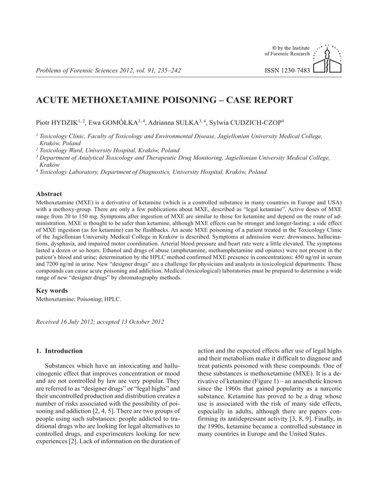 Problems of Forensic Sciences 2012, vol. 91, 235–242 Acute methoxetamine poisoning – case report Piotr Hydzik1, 2, Ewa Gomółka3, 4, Adrianna Sulka3, 4, Sylwia Cudzich-Czop4 1 Toxicology Clinic, Faculty of Toxicology and Environmental Disease, Jagiellonian University Medical College, Kraków, Poland 2 Toxicology Ward, University Hospital, Kraków, Poland 3 Department of Analytical Toxicology and Therapeutic Drug Monitoring, Jagiellonian University Medical College, Kraków 4 Toxicology Laboratory, Department of Diagnostics, University Hospital, Kraków, Poland Abstract Methoxetamine (MXE) is a derivative of ketamine (which is a controlled substance in many countries in Europe and USA) with a methoxy-group. There are only a few publications about MXE, described as “legal ketamine”. Active doses of MXE range from 20 to 150 mg. Symptoms after ingestion of MXE are similar to those for ketamine and depend on the route of administration. MXE is thought to be safer than ketamine, although MXE effects can be stronger and longer-lasting; a side effect of MXE ingestion (as for ketamine) can be flashbacks. An acute MXE poisoning of a patient treated in the Toxicology Clinic of the Jagiellonian University Medical College in Kraków is described. Symptoms at admission were: drowsiness, hallucinations, dysphasia, and impaired motor coordination. Arterial blood pressure and heart rate were a little elevated. The symptoms lasted a dozen or so hours. Ethanol and drugs of abuse (amphetamine, methamphetamine and opiates) were not present in the patient’s blood and urine; determination by the HPLC method confirmed MXE presence in concentrations: 450 ng/ml in serum and 7200 ng/ml in urine. New “designer drugs” are a challenge for physicians and analysts in toxicological departments. These compounds can cause acute poisoning and addiction. Medical (toxicological) laboratories must be prepared to determine a wide range of new “designer drugs” by chromatography methods. Key words Methoxetamine; Poisoning; HPLC. Received 16 July 2012; accepted 13 October 2012 1. Introduction Substances which have an intoxicating and hallucinogenic effect that improves concentration or mood and are not controlled by law are very popular. They are referred to as “designer drugs” or “legal highs” and their uncontrolled production and distribution creates a number of risks associated with the possibility of poisoning and addiction [2, 4, 5]. There are two groups of people using such substances: people addicted to traditional drugs who are looking for legal alternatives to controlled drugs, and experimenters looking for new experiences [2]. Lack of information on the duration of action and the expected effects after use of legal highs and their metabolism make it difficult to diagnose and treat patients poisoned with these compounds. One of these substances is methoxetamine (MXE). It is a derivative of ketamine (Figure 1) – an anaesthetic known since the 1960s that gained popularity as a narcotic substance. Ketamine has proved to be a drug whose use is associated with the risk of many side effects, especially in adults, although there are papers confirming its antidepressant activity [3, 8, 9]. Finally, in the 1990s, ketamine became a controlled substance in many countries in Europe and the United States. P. Hydzik, E. Gomółka, A. Sulka, S. Cudzich-Czop 236 2. Aim of the study The aim of this study was to present a case of acute oral MXE poisoning. Clinical symptoms of toxicity and the method of treating the patient, as well as the toxicological diagnostic procedure are described. 3. Material and methods Fig. 1. Structural formula of ketamine (A) and methoxetamine (MXE) (B). MXE is distributed as a so-called legal alternative to ketamine, but unlike the latter has never been a medicinal product. MXE is produced by illegal laboratories and there is a lack of data on its use safety [6, 11]. For a time, the only source of information about the active doses, method of administration and the expected effects of MXE was the Internet, where one can read that this compound improves mood, evokes pleasant feelings and has a hallucinogenic effect. Cases of MXE poisonings were first described in the UK in 2011 [14], and successive poisonings a year later [2, 7, 11]. On the basis of these cases, it can be concluded that MXE acts similarly to ketamine, is dissociative, affects the N-methyl-D-aspartate (NMDA) receptor and opioid receptors [2, 7, 11, 12, 13, 14]. Clinical signs of MXE poisoning include: tachycardia, hypertension, confusion, agitation, ataxia and nystagmus [7, 14]. Differences between the action of MXE and ketamine are related to the intensity and duration of effects, and result from their chemical structure (Figure 1). Substitution of the 2-chloro group on the phenyl ring by a 3-methoxy group results in MXE having weaker hypnotic effects than ketamine. The change of the N-methyl to the N-ethyl group intensifies the hallucinogenic and dissociative effects of MXE. Hallucinogenic symptoms of sleep while awake, so-called. “closed-eye hallucination”, are characteristic for MXE [2, 7, 11, 14]. MXE poisoning can be diagnosed only in specialized toxicological laboratories. Gas chromatography and high performance liquid chromatography with various detection systems are methods allowing the identification of psychoactive substances and determination of MXE [1, 6, 14]. 3.1.Introductory remarks The materials for analysis were body fluids. The medical history of the patient, who had been acutely poisoned with MXE and was being treated at the Toxicology Clinic in Kraków, was also taken into account. Toxicological analyses were performed at the Laboratory of Toxicology at the Department of Diagnostics, University Hospital in Kraków. The patient’s blood and urine, which had been collected on admission to the clinic for treatment, were analysed. Determination of ethanol in blood and amphetamines and opiates in u