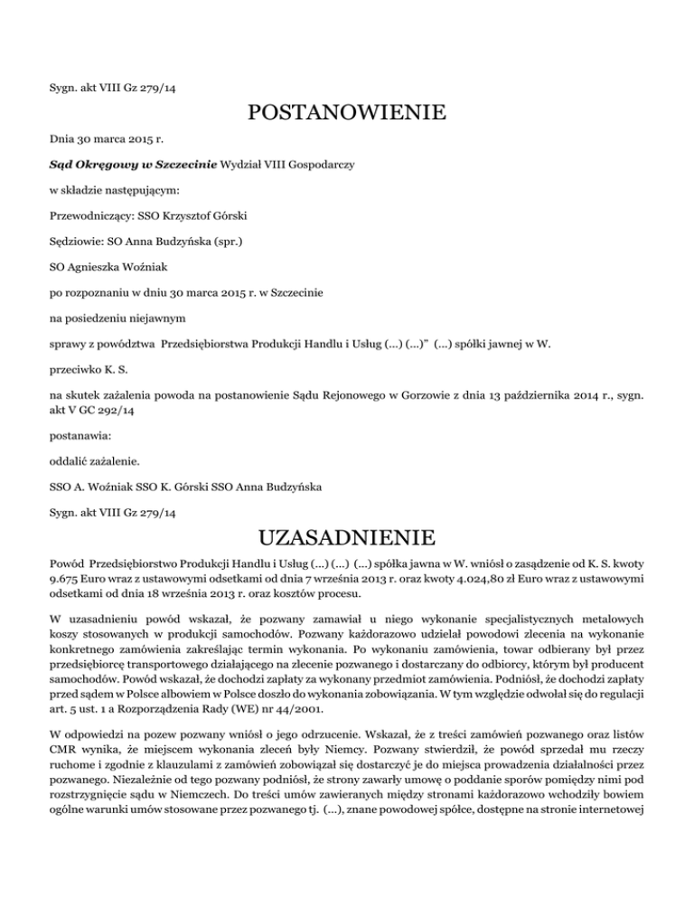 Sygn. akt VIII Gz 279/14 POSTANOWIENIE Dnia 30 marca 2015 r. Sąd Okręgowy w Szczecinie Wydział VIII Gospodarczy w składzie następującym: Przewodniczący: SSO Krzysztof Górski Sędziowie: SO Anna Budzyńska (spr.) SO Agnieszka Woźniak po rozpoznaniu w dniu 30 marca 2015 r. w Szczecinie na posiedzeniu niejawnym sprawy z powództwa Przedsiębiorstwa Produkcji Handlu i Usług (...) (...)” (...) spółki jawnej w W. przeciwko K. S. na skutek zażalenia powoda na postanowienie Sądu Rejonowego w Gorzowie z dnia 13 października 2014 r., sygn. akt V GC 292/14 postanawia: oddalić zażalenie. SSO A. Woźniak SSO K. Górski SSO Anna Budzyńska Sygn. akt VIII Gz 279/14 UZASADNIENIE Powód Przedsiębiorstwo Produkcji Handlu i Usług (...) (...) (...) spółka jawna w W. wniósł o zasądzenie od K. S. kwoty 9.675 Euro wraz z ustawowymi odsetkami od dnia 7 września 2013 r. oraz kwoty 4.024,80 zł Euro wraz z ustawowymi odsetkami od dnia 18 września 2013 r. oraz kosztów procesu. W uzasadnieniu powód wskazał, że pozwany zamawiał u niego wykonanie specjalistycznych metalowych koszy stosowanych w produkcji samochodów. Pozwany każdorazowo udzielał powodowi zlecenia na wykonanie konkretnego zamówienia zakreślając termin wykonania. Po wykonaniu zamówienia, towar odbierany był przez przedsiębiorcę transportowego działającego na zlecenie pozwanego i dostarczany do odbiorcy, którym był producent samochodów. Powód wskazał, że dochodzi zapłaty za wykonany przedmiot zamówienia. Podniósł, że dochodzi zapłaty przed sądem w Polsce albowiem w Polsce doszło do wykonania zobowiązania. W tym względzie odwołał się do regulacji art. 5 ust. 1 a Rozporządzenia Rady (WE) nr 44/2001. W odpowiedzi na pozew pozwany wniósł o jego odrzucenie. Wskazał, że z treści zamówień pozwanego oraz listów CMR wynika, że miejscem wykonania zleceń były Niemcy. Pozwany stwierdził, że powód sprzedał mu rzeczy ruchome i zgodnie z klauzulami z zamówień zobowiązał się dostarczyć je do miejsca prowadzenia działalności przez pozwanego. Niezależnie od tego pozwany podniósł, że strony zawarły umowę o poddanie sporów pomiędzy nimi pod rozstrzygnięcie sądu w Niemczech. Do treści umów zawieranych między stronami każdorazowo wchodziły bowiem ogólne warunki umów stosowane przez pozwanego tj. (...), znane powodowej spółce, dostępne na stronie internetowej pozwanego, na które pozwany wskazywał każdorazowo składając zamówienia u powoda. Pozwany wywodził, że w (...) znajdują się wiążące powoda postanowienia dotyczące sądu właściwego do rozpoznania sporów jak i miejsca spełnienia świadczenia. Postanowieniem z dnia 25 sierpnia 2014 r. Sąd Rejonowy w Gorzowie Wielkopolskim w sprawie o sygn. akt V GC 292/14 odrzucił pozew. W piśmie z dnia 23 września 2014 r. pozwany wniósł o uzupełnienie postanowienia o odrzuceniu pozwu w zakresie rozstrzygnięcia o kosztach procesu. Postanowieniem z dnia 13 października 2014 r. Sąd Rejonowy w Gorzowie Wielkopolskim w sprawie o sygn. akt V GC 292/14 uzupełnił postanowienie Sądu Rejonowego w Gorzowie Wielkopolskim z dnia 25 sierpnia 2014 r. w ten sposób, że dodał punkt II o treści ,,zasądzić od powódki na rzecz pozwanego kwotę 3.617 zł tytułem kosztów zastępstwa procesowego”. W uzasadnieniu wskazał, że postanowieniem z dnia 25 sierpnia 2014 r. Sąd odrzucił pozew, tym samym należało uznać, że to pozwany wygrał proces w całości, a poniesione przez niego koszty zastępstwa procesowego były celowymi do obrony jego praw. Z tych też względów Sąd Rejonowy, na podstawie art. 351 § 1 k.p.c., art. 98 § 1 i 3 k.p.c. w zw. z § 6 pkt 6 Rozporządzenia Ministra Sprawiedliwości z dnia 28 września 2002 r. w sprawie opłat za czynności radców prawnych oraz ponoszenia przez Skarb Państwa kosztów pomocy prawnej udzielonej przez radcę prawnego ustanowionego z urzędu, orzekał o uzupełnianiu postanowienia z dnia 25 sierpnia 2014 r. o koszty procesu. Powód wniósł zażalenie na powyższe postanowienie zaskarżając je w całości oraz zarzucając mu: - naruszenie prawa procesowego tj. art. 98 § 1 i 3 k.p.c. albowiem powództwo zostało wniesione zasadnie, a na postanowienie o odrzuceniu pozwu powód złożył zażalenie z dnia 18.09.2014 r., skutkiem którego powinno być uchylenie postanowienia z dnia 25.08.2014 r. w przedmiocie odrzucenia pozwu, co implikuje brak zasadności obciążenia powoda kosztami zastępstwa procesowego. Wskazując na powyższe zarzuty powód wniósł o zmianę zaskarżonego postanowienia poprzez jego uchylenie. W uzasadnieniu wskazał, że rozpoznanie wniosku o uzupełnienie postanowienia w przedmiocie kosztów procesu powinno nastąpić dopiero po rozstrzygnięciu zażalenia na odrzucenie pozwu. Pozwany wniósł o oddalenie zażalenia, wskazując, że jako niezasadne powinno podlegać oddaleniu. Sąd Okręgowy zważył, co następuje: Zażalenie powoda nie zasługiwało na uwzględnienie. W niniejszej sprawie rozważenia wymagało, wobec zarzutów zażalenia, czy Sąd I instancji miał podstawy do uzupełnienia postanowienia z dnia 25 sierpnia 2014 roku, wydanego w sprawie V GC 292/14, którego przedmiotem było odrzucenie pozwu na podstawie art. 1099 k.p.c. o postanowienie dotyczące kosztów procesu oraz prawidłowość obciążenia kosztami procesu strony powodowej. Nie ulega wątpliwości, że w rozpoznawanej sprawie pozwany, którzy był reprezentowany przez zawodowego pełnomocnika, wnosząc odpowiedź na pozew, wdał się w spór. Ponadto, pełnomocnik pozwanego złożył w jego imieniu żądanie w przedmiocie zwrotu kosztów procesu. Postanowieniem z dnia 25 sierpnia 2014 roku Sąd Rejonowy- jak wskazano na wstępie – odrzucił pozew w sprawie. Orzeczenie powyższe, niewątpliwie mające charakter kończącego sprawę w instancji – wbrew treści art. 108 § 1 k.p.c., zgodnie z którym sąd rozstrzyga o kosztach w każdym orzeczeniu kończącym spra