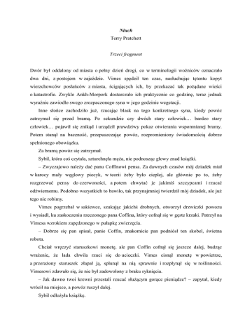 Niuch Terry Pratchett Trzeci fragment Dwór był oddalony od miasta o pełny dzień drogi, co w terminologii woźniców oznaczało dwa dni, z postojem w zajeździe. Vimes spędził ten czas, nasłuchując tętentu kopyt wierzchowców posłańców z miasta, ścigających ich, by przekazać tak pożądane wieści o katastrofie. Zwykle Ankh-Morpork dostarczało ich praktycznie co godzinę, teraz jednak wyraźnie zawiodło swego zrozpaczonego syna w jego godzinie wegetacji. Inne słońce zachodziło już, rzucając blask na tego konkretnego syna, kiedy powóz zatrzymał się przed bramą. Po sekundzie czy dwóch stary człowiek… bardzo stary człowiek… pojawił się znikąd i urządził prawdziwy pokaz otwierania wspomnianej bramy. Potem stanął na baczność, przepuszczając powóz, rozpromieniony świadomością dobrze spełnionego obowiązku. Za bramą powóz się zatrzymał. Sybil, która coś czytała, szturchnęła męża, nie podnosząc głowy znad książki. – Zwyczajowo należy dać panu Coffinowi pensa. Za dawnych czasów mój dziadek miał w karocy mały węglowy piecyk, w teorii żeby było cieplej, ale głównie po to, żeby rozgrzewać pensy do czerwoności, a potem chwytać je jakimiś szczypcami i rzucać odźwiernemu. Podobno wszystkich to bawiło, tak przynajmniej twierdził mój dziadek, ale już tego nie robimy. Vimes pogrzebał w sakiewce, szukając jakichś drobnych, otworzył drzwiczki powozu i wysiadł, ku zaskoczeniu rzeczonego pana Coffina, który cofnął się w gęste krzaki. Patrzył na Vimesa wzrokiem zapędzonego w pułapkę zwierzęcia. – Dobrze się pan spisał, panie Coffin, znakomicie pan podniósł ten skobel, świetna robota. Chciał wręczyć staruszkowi monetę, ale pan Coffin cofnął się jeszcze dalej, budząc wrażenie, że lada chwila rzuci się do ucieczki. Vimes cisnął monetę w powietrze, a przerażony staruszek złapał ją, splunął na nią sprawnie i rozpłynął się w roślinności. Vimesowi zdawało się, że nie był zadowolony z braku syknięcia. – Jak dawno twoi krewni przestali rzucać służącym gorące pieniądze? – zapytał, kiedy wrócił na miejsce, a powóz ruszył dalej. Sybil odłożyła książkę. – Mój ojciec kazał tego zaniechać. Mama się skarżyła. Podobnie jak odźwierni. – No myślę. – Nie, Sam. Oni się skarżyli, że ten zwyczaj się skończył. – Przecież to poniżające! – Tak, Sam. Wiem. – Sybil westchnęła. – Ale rozumiesz, to także dodatkowy dochód. Za czasów mojego pradziadka, jeśli ruch był duży, odźwierny mógł zarobić nawet sześć pensów dziennie. A że staruszek był niemal permanentnie nasączony rumem i brandy, często rzucał nawet dolara. Wiesz, takiego prawdziwego, staromodnego dolara z litego złota. Za coś takiego człowiek mógł swobodnie przeżyć rok, zwłaszcza tutaj. – No tak, ale… – zaczął Vimes, lecz żona uciszyła go uśmiechem. Na takie okazje miała specjalny uśmiech: ciepły, przyjazny i wykuty z kamienia. Człowiek musiał przerwać dyskusje o polityce, bo mógł się z nim zderzyć, nie powodując żadnych strat dla nikogo prócz siebie. Rozsądnie, z mądrością zyskaną na dobrze przećwiczonych lekcjach, Sam Vimes ograniczył się do wyglądania przez okno. Kiedy brama została już daleko w tyle, w gasnącym świetle dnia Vimes zaczął się rozglądać za wielkim domem, który powinien chyba stać w samym środku tego wszystkiego. Nie znalazł go, dopóki nie przeturkotali długą aleją drzew przez coś, co jakiś nędzny poeta nazwałby pewnie „łąką szmaragdową” z białymi punktami, będącymi – jak uznał Vimes – prawie na pewno owcami, przez wymanikiurowany lasek, za którym dotarli do mostu, jaki nawet w mieście nie byłby nie na miejscu1. Most spinał brzegi czegoś, co Vimes uznał początkowo za ozdobne jeziorko, a co okazało się bardzo szeroką rzeką. Kiedy przejeżdżali nad nią z godnością, zobaczył dużą łódź poruszającą się po wodzie jakimś nieznanym sposobem, który jednak – sądząc po zapachu, kiedy ich mijała – miał coś wspólnego z bydłem. W tym momencie odezwał się Młody Sam. – Te panie nie mają żadnych ubrań! Czy chcą sobie popływać? Vimes z roztargnieniem kiwnął głową, ponieważ dziedzina nagich dam nie należała do tematów, o których chciałby dyskutować z sześcioletnim chłopcem. Poza tym cały czas obserwował łódź; woda pieniła się wokół niej, a marynarze na pokładzie wykonali coś, co zapewne było tradycyjnym marynarskim gestem, w stronę lady Sybil, choć możliwe, że w stronę jednej z nagich dam. – To rzeka, prawda? – zapytał. 1 Oczywiście jeśli pominąć rząd artystycznie nagich dam wzdłuż parapetu. Wszystkie trzymały urny, a urny to sztuka. – Tak, Quire – potwierdziła lady Sybil. – Zbiera wody z prawie całej krainy oktarynowych traw i wpada do morza w Quirmie. O ile jednak sobie przypominam, większość ludzi nazywa ją Zdradziecką Staruchą. Ma swoje humory. Ale pamiętam, że jako dziecko lubiłam te małe rzeczne stateczki. Naprawdę były ładne. Powóz zaturkotał na drugim końcu mostu i ruszył długim podjazdem do… tak jest, do wiejskiego domu, nazywanego tak zapewne dlatego, zdaniem Vimesa, że był wielkości sporej wsi. Niewielkie stadko saren czekało na trawniku, a wielkie stado ludzi zebrało się przy tym, co najwyraźniej było frontowymi drzwiami. Ustawili się w dwa rzędy, jak na weselu. Tworzyli coś w rodzaju gwardii honorowej, a musiało się ich tu zjawić ze trzysta osób, od ogrodników do lokajów. Wszyscy próbowali się uśmiechać, choć nie wychodziło im to dobrze. Przypominali Vimesowi paradę Straży Miejskiej. Dwaj lokaje zderzyli się ze sobą, próbując ustawić stopień przy drzwiczkach powozu, a Vimes całkiem zmarnował okazję, wysiadając po drugiej stronie i sprowadzając za sobą lady Sybil. Pośrodku nerwowego tłumu zauważył przyjazną twarz. Należała do W
