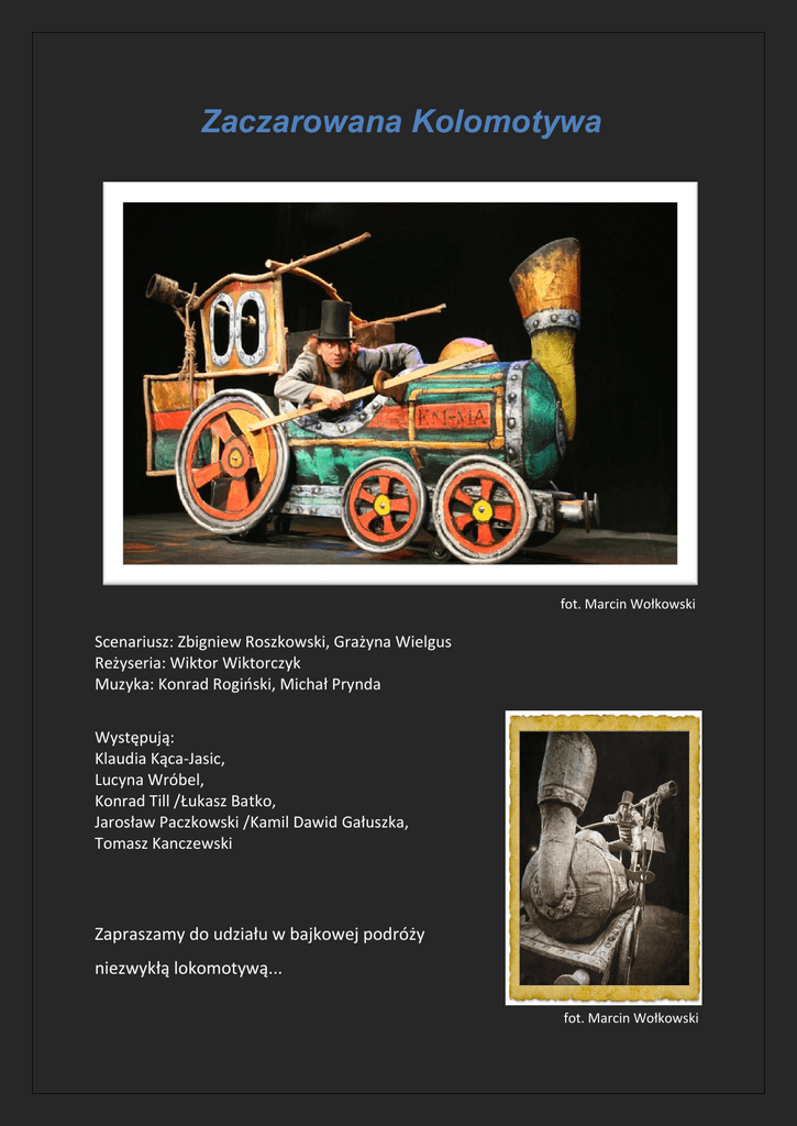 Zaczarowana Kolomotywa fot. Marcin Wołkowski Scenariusz: Zbigniew Roszkowski, Grażyna Wielgus Reżyseria: Wiktor Wiktorczyk Muzyka: Konrad Rogiński, Michał Prynda Występują: Klaudia Kąca-Jasic, Lucyna Wróbel, Konrad Till /Łukasz Batko, Jarosław Paczkowski /Kamil Dawid Gałuszka, Tomasz Kanczewski Zapraszamy do udziału w bajkowej podróży niezwykłą lokomotywą... fot. Marcin Wołkowski Głównym bohaterem spektaklu jest Maszynista Łukasz i jego niezwykła lokomotywa - Kolomotywa Emma. Akcja spektaklu rozpoczyna się na wyspie Trochania, dokąd Łukasz i Kolomotywa zabierają publiczność. Na wyspie panuje spokój i harmonia. Trochanią rządzi miłościwy Król – Ludwik Za Kwadrans Dwunasty, któremu wiernie służy Maszynista Łukasz ze swoją lokomotywą oraz poddani – Pani Coo i Pan Rękawek. Spokojne życie na wyspie komplikuje się, kiedy przybywa tam Listonosz z tajemniczą paczką. W paczce jest dziecko - mały chłopiec, którego król i poddani nazwali Kubą. Kiedy Kuba dorasta i powoli staje się dorosłym Poddanym, okazuje się, że wyspa Trochania jest zbyt mała by zbudować dom dla kolejnego mieszkańca... Maszynista Łukasz i Kuba postanawiają wyruszyć Kolomotywą Emmą w świat… Podczas długiej podróży Łukasz i Kuba muszą podejmować bardzo trudne decyzje, wykazać się wielką odwagą i życiową mądrością... Przedstawienie przeznaczone dla dzieci od lat 4. Fragmenty spektaklu w serwisie YouTube fot. Marcin Wołkowski Kontakt: Alicja Dolata Biuro Festiwalowe IMPART 2016 ul. Komuny Paryskiej 39-41; 50-451 Wrocław kom. 797-128-777; e-mail: [email protected] fot. Marcin Wołkowski ZACZAROWANA KOLOMOTYWA – WYMAGANIA TECHNICZNE DOPUSZCZAMY MOŻLIWOŚĆ ADAPTACJI SPEKTAKLI DO WARUNKÓW SCENICZNYCH SCENA: - szerokość 8 m, - głębokość 6 m, - wysokość 3,5 m, Czarne okotarowanie z fartuchami (parlamentami), sztankiety lub stała konstrukcja do zawieszenia ekranu o wymiarach 6 m x 3,5 m. Jeżeli widownia ma na stałe zamontowane miejsca siedzące to minimalna głębokość sceny 9 m. Prosimy o przesłanie szczegółowego planu sceny i widowni. OŚWIETLENIE: - 24 obwody regulowane, - stół do sterowania oświetleniem z możliwością zapisu scen i submasterów, - 6 szt. PAR 64 – 1000 W, - 6 szt. Reflektorów PC- 500 W lub 650 W, -10 szt. Reflektorów PC – 1000 W, - 2 szt. maszyna do dymu. - 2 szt. stroboskop, - projektor multimedialny do wyświetlenia obrazu o wymiarach 6 m x 3,5 m. DZWIĘK: - zestaw stereo odpowiedni do wielkości sali, - 2 szt. odtwarzaczy CD z autopauzą, - monitor odsłuchowy na scenie. Obsługa : - w czasie montażu, próby, spektaklu i demontażu : miejscowy elektryk, akustyk, 2 montażystów. Garderoba dla 5 osób.