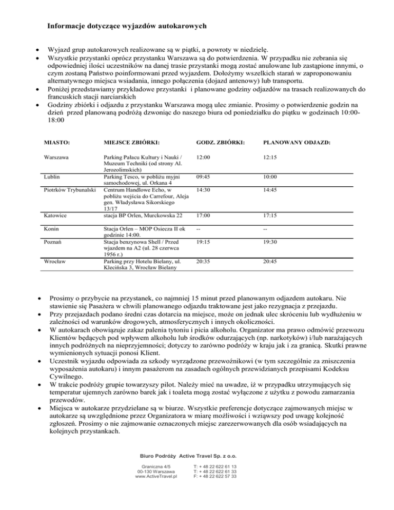 Informacje dotyczące wyjazdów autokarowych Wyjazd grup autokarowych realizowane są w piątki, a powroty w niedzielę. Wszystkie przystanki oprócz przystanku Warszawa są do potwierdzenia. W przypadku nie zebrania się odpowiedniej ilości uczestników na danej trasie przystanki mogą zostać anulowane lub zastąpione innymi, o czym zostaną Państwo poinformowani przed wyjazdem. Dołożymy wszelkich starań w zaproponowaniu alternatywnego miejsca wsiadania, innego połączenia (dojazd antenowy) lub transportu. Poniżej przedstawiamy przykładowe przystanki i planowane godziny odjazdów na trasach realizowanych do francuskich stacji narciarskich Godziny zbiórki i odjazdu z przystanku Warszawa mogą ulec zmianie. Prosimy o potwierdzenie godzin na dzień przed planowaną podróżą dzwoniąc do naszego biura od poniedziałku do piątku w godzinach 10:0018:00 MIASTO: MIEJSCE ZBIÓRKI: GODZ. ZBIÓRKI: PLANOWANY ODJAZD: Warszawa Parking Pałacu Kultury i Nauki / Muzeum Techniki (od strony Al. Jerozolimskich) Parking Tesco, w pobliżu myjni samochodowej, ul. Orkana 4 Centrum Handlowe Echo, w pobliżu wejścia do Carrefour, Aleja gen. Władysława Sikorskiego 13/17 stacja BP Orlen, Murckowska 22 12:00 12:15 09:45 10:00 14:30 14:45 17:00 17:15 Stacja Orlen – MOP Osiecza II ok godzinie 14:00. Stacja benzynowa Shell / Przed wjazdem na A2 (ul. 28 czerwca 1956 r.) Parking przy Hotelu Bielany, ul. Klecińska 3, Wrocław Bielany -- -- 19:15 19:30 20:35 20:45 Lublin Piotrków Trybunalski Katowice Konin Poznań Wrocław Prosimy o przybycie na przystanek, co najmniej 15 minut przed planowanym odjazdem autokaru. Nie stawienie się Pasażera w chwili planowanego odjazdu traktowane jest jako rezygnacja z przejazdu. Przy przejazdach podano średni czas dotarcia na miejsce, może on jednak ulec skróceniu lub wydłużeniu w zależności od warunków drogowych, atmosferycznych i innych okoliczności. W autokarach obowiązuje zakaz palenia tytoniu i picia alkoholu. Organizator ma prawo odmówić przewozu Klientów będących pod wpływem alkoholu lub środków odurzających (np. narkotyków) i/lub narażających innych podróżnych na nieprzyjemności; dotyczy to zarówno podróży w kraju jak i za granicą. Skutki prawne wymienionych sytuacji ponosi Klient. Uczestnik wyjazdu odpowiada za szkody wyrządzone przewoźnikowi (w tym szczególnie za zniszczenia wyposażenia autokaru) i innym pasażerom na zasadach ogólnych przewidzianych przepisami Kodeksu Cywilnego. W trakcie podróży grupie towarzyszy pilot. Należy mieć na uwadze, iż w przypadku utrzymujących się temperatur ujemnych zarówno barek jak i toaleta mogą zostać wyłączone z użytku z powodu zamarzania przewodów. Miejsca w autokarze przydzielane są w biurze. Wszystkie preferencje dotyczące zajmowanych miejsc w autokarze są uwzględnione przez Organizatora w miarę możliwości i wziąwszy pod uwagę kolejność zgłoszeń. Prosimy o nie zajmowanie oznaczonych miejsc zarezerwowanych dla osób wsiadających na kolejnych przystankach. Biuro Podróży Active Travel Sp. z o.o. Graniczna 4/5 00-130 Warszawa www.ActiveTravel.pl T: + 48 22 622 61 13 T: + 48 22 622 61 33 F: + 48 22 622 57 33 Przypominamy o obowiązku posiadania ważnych dokumentów wjazdowych i wyjazdowych oraz innych uprawniających do odbycia danej podróży (dowód osobisty, paszport, wizy). W trakcie przejazdu postoje autokaru dostosowane są do przerw związanych z czasem pracy kierowców. Przewidujemy dłuższy postój na śniadanie w sobotę 5 grudnia. Ze względu na niewielką pojemność zbiorników toalety i niewielką liczbę miejsc na trasie, gdzie możliwe jest ich opróżnienie, zaleca się korzystanie z WC w autokarze wyłącznie w sytuacjach awaryjnych. Ze względu na zasady bezpieczeństwa i przepisy drogowe prosimy o bezwzględne przestrzeganie limitów bagażowych. Pilot lub kierowca mogą odmówić przewozu bagażu znacząco przekraczającego limity. Nie ma możliwości powiększenia limitu jakąkolwiek dopłatą za nadbagaż. Przewoźnik może odmówić zabrania ponadstandardowych opakowań np. kartonów i toreb z jedzeniem. Przypominamy, że uczestnik wyjazdu odpowiada za swój bagaż główny w tym sprzęt narciarski lub snowboardowy do chwili załadowania go do autokaru (włożenia bagażu do luków i zamknięcia luków), jak również od chwili wyjęcia go z luków bagażowych przez kierowców lub obsługę wyjazdu. Zalecamy doczepienie do bagażu identyfikatorów z imieniem i nazwiskiem oraz adres zamieszkania – Organizator nie odpowiada za ewentualne zamiany bagażu przez uczestników. W wielu ośrodkach narciarskich ruch pojazdów jest mocno ograniczony. Dojazd autokaru bezpośrednio pod niektóre rezydencje i hotele może nie być możliwy. Autokar zatrzymuje się tylko w miejscach specjalnie przeznaczonych na postój. Ze względów logistycznych konieczny może być dojazd do hotelu lub rezydencji miejscowym skibussem. Limity bagażowe: 20 kg ( bagaż rejestrowany- prosimy o spakowanie rzeczy w miękkie torby, a nie walizki) + 1 zestaw narciarski (narty, buty, kijki)/1 zestaw snowboardowy (snowboard, buty) + bagaż podręczny mieszczący się pod nogami lub na półce nad pasażerem. Biuro Podróży Active Travel Sp. z o.o. Graniczna 4/5 00-130 Warszawa www.ActiveTravel.pl T: + 48 22 622 61 13 T: + 48 22 622 61 33 F: + 48 22 622 57 33