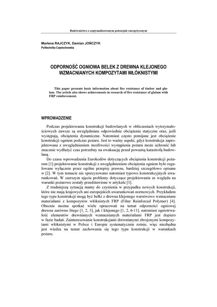Budownictwo o zoptymalizowanym potencjale energetycznym Marlena RAJCZYK, Damian JOŃCZYK Politechnika Częstochowska ODPORNOŚĆ OGNIOWA BELEK Z DREWNA KLEJONEGO WZMACNIANYCH KOMPOZYTAMI WŁÓKNISTYMI This paper presents basic information about fire resistance of timber and glulam. The article also shows achievements in research of fire resistance of glulam with FRP reinforcement. WPROWADZENIE Podczas projektowania konstrukcji budowlanych w obliczeniach wytrzymałościowych zawsze są uwzględniane odpowiednie obciążenia statyczne oraz, jeśli występują, obciążenia dynamiczne. Natomiast często pomijane jest obciążenie konstrukcji ogniem podczas pożaru. Jest to ważny aspekt, gdyż konstrukcja zaprojektowana z uwzględnieniem możliwości wystąpienia pożaru może uchronić lub znacznie wydłużyć czas potrzebny na ewakuację przed poważną katastrofą budowlaną. Do czasu wprowadzenia Eurokodów dotyczących obciążenia konstrukcji pożarem [1] projektowanie konstrukcji z uwzględnieniem obciążenia ogniem było regulowane wyłącznie przez ogólne przepisy prawne, bardziej szczegółowo opisane w [2]. W tym temacie nie sprecyzowano natomiast typowo konstrukcyjnych uwarunkowań. W szerszym ujęciu problemy dotyczące projektowania ze względu na warunki pożarowe zostały przedstawione w artykule [3]. Z trudniejszą sytuacją mamy do czynienia w przypadku nowych konstrukcji, które nie mają krajowych ani europejskich uwarunkowań normowych. Przykładem tego typu konstrukcji mogą być belki z drewna klejonego warstwowo wzmacniane materiałami z kompozytów włóknistych FRP (Fiber Reinforced Polymer) [4]. Obecnie można spotkać wiele opracowań na temat odporności ogniowej drewna zarówno litego [1, 2, 5], jak i klejonego [1, 2, 6-11], natomiast ogniotrwałość elementów drewnianych wzmacnianych materiałami FRP jest dopiero w fazie badań. Zainteresowanie konstrukcjami drewnianymi zbrojonymi kompozytami włóknistymi w Polsce i Europie systematycznie rośnie, więc niezbędna jest wiedza na temat zachowania się tego typu konstrukcji w warunkach pożaru. 194 M. Rajczyk, D. Jończyk 1. ODPORNOŚĆ OGNIOWA KONSTRUKCJI BUDOWLANYCH ORAZ ZJAWISKO POŻARU Według [2]: „odporność ogniowa jest to zdolność elementu do spełnienia w określonym czasie określonych funkcji użytkowych w warunkach pożaru”. Pojęcie odporności ogniowej jest bezpośrednio związane ze zjawiskiem pożaru. Pożar jest gwałtownym zjawiskiem rozkładu termicznego materiałów łatwopalnych i charakteryzuje się następującymi cechami: − w większości przypadków (pomijając jedynie czynniki atmosferyczne) jest spowodowany działalnością ludzką, − jego oddziaływanie na elementy konstrukcyjne nie ma bezpośredniego wpływu mechanicznego, lecz powoduje zmianę środowiska obiektu, co ma pośredni wpływ na właściwości mechaniczne elementów budynku. Pożar może oddziaływać na konstrukcję obiektu budowlanego w sposób: − termiczny - promieniowanie, konwekcja oraz przewodzenie ciepła, − mechaniczny - wzrost ciśnienia, − chemiczny - powstawanie korozyjnych produktów w wyniku spalania. 2. ODPORNOŚĆ OGNIOWA DREWNA 2.1. Wiadomości ogólne Drewno w odróżnieniu od stali czy betonu jest materiałem palnym. Jeżeli drewno poddamy działaniu wysokiej temperatury, następuje wówczas zjawisko zwane rozkładem pirolitycznym. Podczas spalania na powierzchni drewna tworzy się zwęglona warstwa, która w trakcie trwania pożaru stopniowo narasta. Warstwa ta nie ma żadnych właściwości wytrzymałościowych, jest jednak w pewnym stopniu izolatorem chroniącym wnętrze, gdyż ogranicza dopływ tlenu do wnętrza przekroju, a co za tym idzie - przyrost temperatury. Niezwęglone jądro znajduje się wewnątrz przekroju i poprzez oddziaływanie termiczne pożaru wzrasta w nim temperatura oraz wilgotność (rys. 1), co zmniejsza jego nośność [2, 7]. W przypadku drewna właściwości mechaniczne oraz spalanie są traktowane łącznie, ponieważ oba elementy mają związek z nośnością. Odporność ogniowa konstrukcji drewnianych wiąże się z dwoma czynnikami: − spadkiem właściwości mechanicznych spowodowanym wzrostem wilgotności oraz temperatury, − zmniejszeniem wymiarów przekroju poprzecznego spowodowanym zwęgleniem. Podczas spalania drewna możemy wyróżnić kilka etapów. W pierwszym etapie (endotermicznym) temperatura oscyluje wokół 100°C, po wzroście do 125°C drewno zaczyna wytwarzać substancje lotne. W drugim etapie (egzotermicznym), początkującym właściwy etap spalania, właściwości fizyczne drewna zaczynają ulegać zmianie oraz w temperaturze 250°C następuje zapłon. Ostatnią fazą jest etap spalania, podczas którego w przekroju poprzecznym możemy wyróżnić kilka stref temperatury (rys. 2) [2, 7]: Odporność ogniowa belek z drewna klejonego wzmacnianych kompozytami włóknistymi 195 − jądro, w którym temperatura nie wzrasta powyżej 90°C, − obrzeże jądra, w którym w temperaturze 100÷200°C następuje zwiększone wydzielanie gazów i rozwój endotermicznego procesu pirolizy, − obszar, w którym rozpoczyna się zwęglenie, w zakresie temperatur 200÷280°C, − obszar zwęglenia, w którym w temperaturze ponad 280°C drewno całkowicie rozkłada się na węgiel drzewny oraz gazy, − obszar żarzenia, w którym w temperaturze do 1100°C węgiel drzewny tli się i spala. Rys. 1. Rozkład wilgotności w belce poddanej działaniu ognia o początkowej szerokości 18,5 cm [2] Rys. 2. Strefy temperatury w przekroju belki poddanej działaniu ognia [7] Na początku procesu spalania drewna grubość zewnętrznej warstwy zwęglonej szybko rośnie, następnie proces ten ulega spowolnieniu, co jest spowodowane działaniem izolacyjnym warstwy zwęglonej oraz odparowaniem wilgoci do jądra elementu. Na koniec, po całkowitym odparowaniu wody, następuje ponowne przyspieszenie tego procesu. 196 M. Rajczyk, D. Jończyk Po przeprowadzonych wie