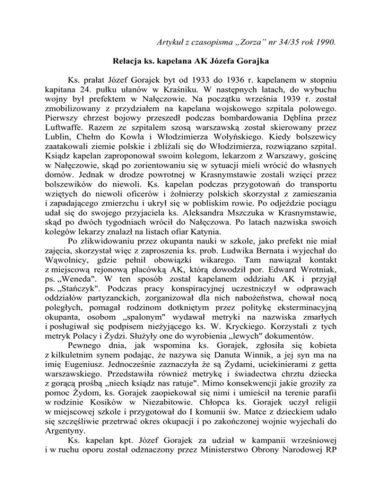 Artykuł z czasopisma „Zorza” nr 34/35 rok 1990. Relacja ks. kapelana AK Józefa Gorajka Ks. prałat Józef Gorajek byt od 1933 do 1936 r. kapelanem w stopniu kapitana 24. pułku ułanów w Kraśniku. W następnych latach, do wybuchu wojny był prefektem w Nałęczowie. Na początku września 1939 r. został zmobilizowany z przydziałem na kapelana wojskowego szpitala polowego. Pierwszy chrzest bojowy przeszedł podczas bombardowania Dęblina przez Luftwaffe. Razem ze szpitalem szosą warszawską został skierowany przez Lublin, Chełm do Kowla i Włodzimierza Wołyńskiego. Kiedy bolszewicy zaatakowali ziemie polskie i zbliżali się do Włodzimierza, rozwiązano szpital. Ksiądz kapelan zaproponował swoim kolegom, lekarzom z Warszawy, gościnę w Nałęczowie, skąd po zorientowaniu się w sytuacji mieli wrócić do własnych domów. Jednak w drodze powrotnej w Krasnymstawie zostali wzięci przez bolszewików do niewoli. Ks. kapelan podczas przygotowań do transportu wziętych do niewoli oficerów i żołnierzy polskich skorzystał z zamieszania i zapadającego zmierzchu i ukrył się w pobliskim rowie. Po odjeździe pociągu udał się do swojego przyjaciela ks. Aleksandra Mszczuka w Krasnymstawie, skąd po dwóch tygodniach wrócił do Nałęczowa. Po latach nazwiska swoich kolegów lekarzy znalazł na listach ofiar Katynia. Po zlikwidowaniu przez okupanta nauki w szkole, jako prefekt nie miał zajęcia, skorzystał więc z zaproszenia ks. prob. Ludwika Bernata i wyjechał do Wąwolnicy, gdzie pełnił obowiązki wikarego. Tam nawiązał kontakt z miejscową rejonową placówką AK, którą dowodził por. Edward Wrotniak, ps. „Weneda". W ten sposób został kapelanem oddziału AK i przyjął ps. „Stańczyk". Podczas pracy konspiracyjnej uczestniczył w odprawach oddziałów partyzanckich, zorganizował dla nich nabożeństwa, chował nocą poległych, pomagał rodzinom dotkniętym przez politykę eksterminacyjną okupanta, osobom „spalonym" wydawał metryki na nazwiska zmarłych i posługiwał się podpisem nieżyjącego ks. W. Kryckiego. Korzystali z tych metryk Polacy i Żydzi. Służyły one do wyrobienia „lewych" dokumentów. Pewnego dnia, jak wspomina ks. Gorajek, zgłosiła się kobieta z kilkuletnim synem podając, że nazywa się Danuta Winnik, a jej syn ma na imię Eugeniusz. Jednocześnie zaznaczyła że są Żydami, uciekinierami z getta warszawskiego. Przedstawiła również metrykę i świadectwa chrztu dziecka z gorącą prośbą „niech ksiądz nas ratuje". Mimo konsekwencji jakie groziły za pomoc Żydom, ks. Gorajek zaopiekował się nimi i umieścił na terenie parafii w rodzinie Kosików w Niezabitowie. Chłopca ks. Gorajek uczył religii w miejscowej szkole i przygotował do I komunii św. Matce z dzieckiem udało się szczęśliwie przetrwać okres okupacji i po zakończonej wojnie wyjechali do Argentyny. Ks. kapelan kpt. Józef Gorajek za udział w kampanii wrześniowej i w ruchu oporu został odznaczony przez Ministerstwo Obrony Narodowej RP w Londynie Medalem WP, Krzyżem AK 1939-45 i Złotym Krzyżem Zasługi z Mieczami. Minęło 43 lata od chwili wyjazdu Winników, kiedy Eugeniusz przyjechał do ks. kanonika Jana Pęzioła - proboszcza parafii w Wąwolnicy, w poszukiwaniu księdza, który pomógł przeżyć jemu i matce lata okupacji hitlerowskiej. Miał ze sobą, jako dokument z tamtych lat wspólne zdjęcie z księdzem i obrazek z okazji I Komunii św. Był szczęśliwy, że spotkał ks. Gorajka i mógł podziękować za pomoc. Dodał również że matka jego zmarła w Argentynie, a on przeniósł się do St. Zjednoczonych. Jego staraniem ks. Prałat otrzymał w listopadzie 1987 roku zaproszenie z Zarządu Organizacji Simon Wiezenthala Center Los Angeles Californi na wyjazd do Ameryki. Ks. Gorajek nie miał chęci wybrać się w tak daleką podróż, ale jak wspomina, ks. bp Bolesław Pylak przekonał go, że w imieniu tych Polaków i tych polskich księży, którzy z narażeniem życia pomagali Żydom w latach okupacji hitlerowskiej powinien pojechać i dać świadectwo prawdzie, która jest niejednokrotnie podważana. W dniu 10 kwietnia 1988 roku odbyła się uroczystość na dziedzińcu przed Mauzoleum Męczeństwa Żydów w Los Angeles i płytą z nazwami wszystkich obozów koncentracyjnych, w których ginęli Żydzi. W uroczystości tej wzięli m. in. udział: Zarząd Organizacji Wiezenthal, przedstawiciele Senatu Stanu California, ambasador Polski w USA, konsul amerykański w Jerozolimie, miejscowi notable, księża polscy i amerykańscy. Przedstawiciel Zarządu Simon Wiezenthal Center z Los Angeles wręcza ks. Józefowi Gorajkowi dyplom za niesienie pomocy ludności żydowskiej. Z prawej ks. Gorajka stoi Eugeniusz Winnik Podczas uroczystości głos zabrał ks. Gorajek w imieniu tych wszystkich Polaków, którzy nieśli pomoc Żydom, a na zakończenie zwrócił się do zebranych, aby każdy w ramach własnej religii pomodlił się w intencji męczenników i bohaterów - Żydów i Polaków. W ramach tych uroczystości wręczono również ks. prałatowi dyplom dziękczynny Zarządu Organizacji Wiezenthal za czyn bohaterski i humanitarny niesienia pomocy ludności żydowskiej w czasie II wojny światowej, oraz uchwałę - podziękowanie za postawę humanitarną Senatu Stanu California. Oprócz tych wyróżnień ks. Gorajek posiada również medal Sprawiedliwy Wśród Narodów Świata. Druga część uroczystości odbyta się w synagodze Valley Beth Shalom w Encino, w której uczestniczyło 1500 osób. W modlitwach szabatowych prowadzonych przez rabina H. Schulweise podkreślony został motyw ludzkiej godności, której bohaterem był ks. Józef Gorajek. Podczas tego nabożeństwa swoją historię z lat okupacji opowiedział Eugeniusz Winnik, a ks. Gorajek mówił o pomocy udzielanej przez Polaków Żydom w latach okupacji hitlerowskiej. Następnie odbyło się wzruszające spotkanie z uczestnikami nabożeństwa. Wielu z nich pochodziło z 