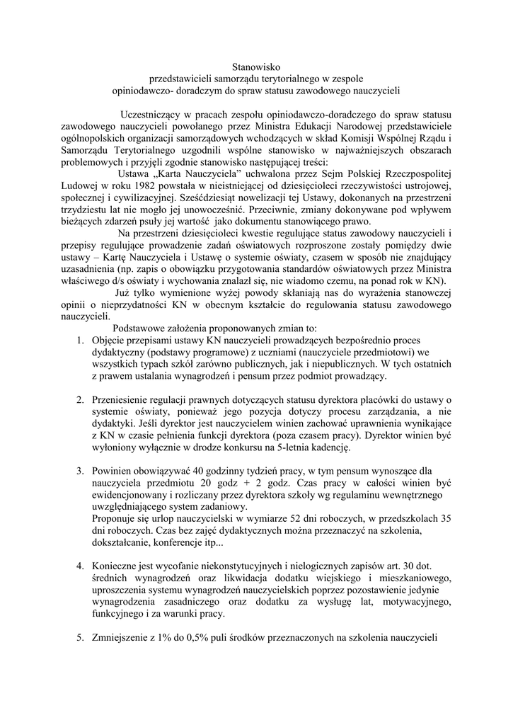 Stanowisko przedstawicieli samorządu terytorialnego w zespole opiniodawczo- doradczym do spraw statusu zawodowego nauczycieli Uczestniczący w pracach zespołu opiniodawczo-doradczego do spraw statusu zawodowego nauczycieli powołanego przez Ministra Edukacji Narodowej przedstawiciele ogólnopolskich organizacji samorządowych wchodzących w skład Komisji Wspólnej Rządu i Samorządu Terytorialnego uzgodnili wspólne stanowisko w najważniejszych obszarach problemowych i przyjęli zgodnie stanowisko następującej treści: Ustawa „Karta Nauczyciela” uchwalona przez Sejm Polskiej Rzeczpospolitej Ludowej w roku 1982 powstała w nieistniejącej od dziesięcioleci rzeczywistości ustrojowej, społecznej i cywilizacyjnej. Sześćdziesiąt nowelizacji tej Ustawy, dokonanych na przestrzeni trzydziestu lat nie mogło jej unowocześnić. Przeciwnie, zmiany dokonywane pod wpływem bieżących zdarzeń psuły jej wartość jako dokumentu stanowiącego prawo. Na przestrzeni dziesięcioleci kwestie regulujące status zawodowy nauczycieli i przepisy regulujące prowadzenie zadań oświatowych rozproszone zostały pomiędzy dwie ustawy – Kartę Nauczyciela i Ustawę o systemie oświaty, czasem w sposób nie znajdujący uzasadnienia (np. zapis o obowiązku przygotowania standardów oświatowych przez Ministra właściwego d/s oświaty i wychowania znalazł się, nie wiadomo czemu, na ponad rok w KN). Już tylko wymienione wyżej powody skłaniają nas do wyrażenia stanowczej opinii o nieprzydatności KN w obecnym kształcie do regulowania statusu zawodowego nauczycieli. Podstawowe założenia proponowanych zmian to: 1. Objęcie przepisami ustawy KN nauczycieli prowadzących bezpośrednio proces dydaktyczny (podstawy programowe) z uczniami (nauczyciele przedmiotowi) we wszystkich typach szkół zarówno publicznych, jak i niepublicznych. W tych ostatnich z prawem ustalania wynagrodzeń i pensum przez podmiot prowadzący. 2. Przeniesienie regulacji prawnych dotyczących statusu dyrektora placówki do ustawy o systemie oświaty, ponieważ jego pozycja dotyczy procesu zarządzania, a nie dydaktyki. Jeśli dyrektor jest nauczycielem winien zachować uprawnienia wynikające z KN w czasie pełnienia funkcji dyrektora (poza czasem pracy). Dyrektor winien być wyłoniony wyłącznie w drodze konkursu na 5-letnia kadencję. 3. Powinien obowiązywać 40 godzinny tydzień pracy, w tym pensum wynoszące dla nauczyciela przedmiotu 20 godz + 2 godz. Czas pracy w całości winien być ewidencjonowany i rozliczany przez dyrektora szkoły wg regulaminu wewnętrznego uwzględniającego system zadaniowy. Proponuje się urlop nauczycielski w wymiarze 52 dni roboczych, w przedszkolach 35 dni roboczych. Czas bez zajęć dydaktycznych można przeznaczyć na szkolenia, dokształcanie, konferencje itp... 4. Konieczne jest wycofanie niekonstytucyjnych i nielogicznych zapisów art. 30 dot. średnich wynagrodzeń oraz likwidacja dodatku wiejskiego i mieszkaniowego, uproszczenia systemu wynagrodzeń nauczycielskich poprzez pozostawienie jedynie wynagrodzenia zasadniczego oraz dodatku za wysługę lat, motywacyjnego, funkcyjnego i za warunki pracy. 5. Zmniejszenie z 1% do 0,5% puli środków przeznaczonych na szkolenia nauczycieli (obecnie jest wiele możliwości korzystania z innych środków na ten cel). Środki przesunąć na wynagrodzenia będące w gestii dyrektora szkoły, np. na dodatki motywacyjne. 6. Zmiana zasad udzielania urlopów dla poratowania zdrowia. Proponuje się udzielać ich wyłącznie w wyniku opinii zespołu orzekającego na czas roku szkolnego. Urlop finansowany przez ZUS. 7. Konieczne jest zmodyfikowanie zasad awansu zawodowego. Do zawodu nauczycielskiego winien trafiać stażysta z przygotowaniem praktycznym (praktyką odbytą podczas studiów) potwierdzonym egzaminem. Kolejny stopień to nauczyciel kontraktowy (6 lat), następnie mianowany (wg propozycji MEN). Proponujemy, aby stopień nauczyciela dyplomowanego był tytułem honorowym. Tytuł nauczyciela dyplomowanego nadawałby dyrektor szkoły po zasięgnięciu opinii organu prowadzącego. Nie wiązałby się on z wyższym wynagrodzeniem, ale upoważniałby do pełnienia funkcji np. opiekuna stażystów lub lidera projektów, co mogłoby się wiązać z dodatkową gratyfikacją. Konieczne jest powiązanie awansu zawodowego nauczycieli z podniesieniem jakości pracy szkoły. Przedstawiciele samorządu nie wypowiadają się na temat „Kodeksu etycznego nauczycieli”. W okresie przejściowym prawa nabyte powinny być zachowane. Opracował zespół: Lucyna Ekkert Jolanta Lipszyc Ewa Dumkiewicz – Sprawka Marek Wójcik Piotr Mróż Andrzej Jakubiec Marek Olszewski Andrzej Porawski Hanna Hendrysiak ZW RP UMP UMP ZPP ZMP UmP ZGW RP sekretarz KWRiST sekretariat KWRiST