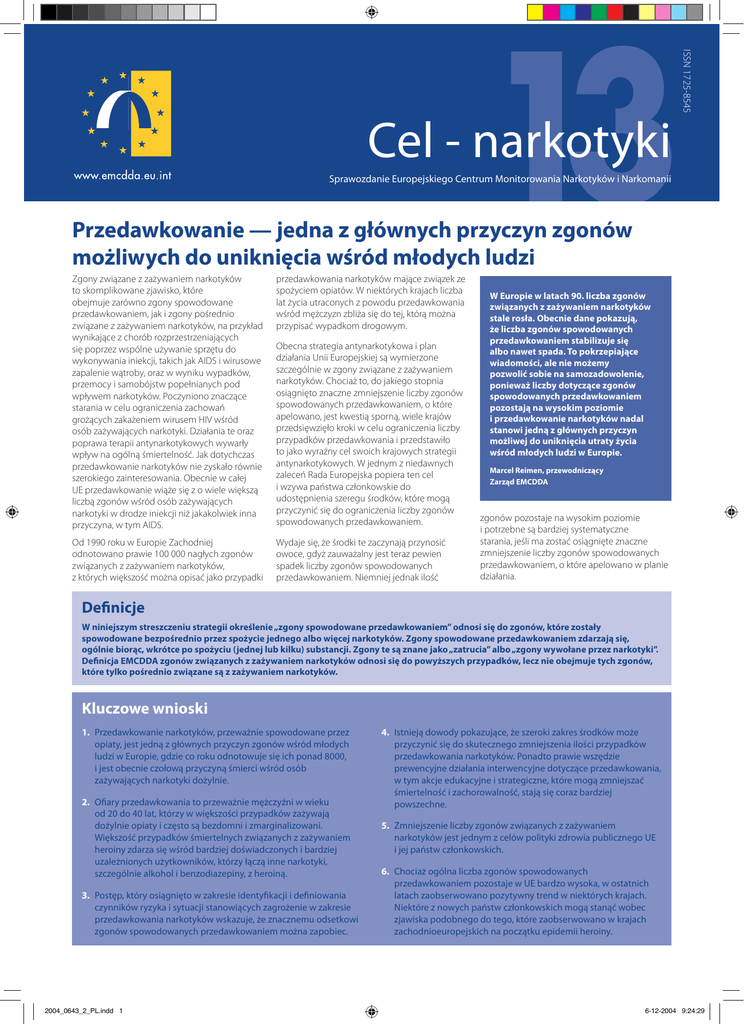 ISSN 1725-8545 Cel - narkotyki Sprawozdanie Europejskiego Centrum Monitorowania Narkotyków i Narkomanii Przedawkowanie — jedna z głównych przyczyn zgonów możliwych do uniknięcia wśród młodych ludzi przedawkowania narkotyków mające związek ze spożyciem opiatów. W niektórych krajach liczba lat życia utraconych z powodu przedawkowania wśród mężczyzn zbliża się do tej, którą można przypisać wypadkom drogowym. Zgony związane z zażywaniem narkotyków to skomplikowane zjawisko, które obejmuje zarówno zgony spowodowane przedawkowaniem, jak i zgony pośrednio związane z zażywaniem narkotyków, na przykład wynikające z chorób rozprzestrzeniających się poprzez wspólne używanie sprzętu do wykonywania iniekcji, takich jak AIDS i wirusowe zapalenie wątroby, oraz w wyniku wypadków, przemocy i samobójstw popełnianych pod wpływem narkotyków. Poczyniono znaczące starania w celu ograniczenia zachowań grożących zakażeniem wirusem HIV wśród osób zażywających narkotyki. Działania te oraz poprawa terapii antynarkotykowych wywarły wpływ na ogólną śmiertelność. Jak dotychczas przedawkowanie narkotyków nie zyskało równie szerokiego zainteresowania. Obecnie w całej UE przedawkowanie wiąże się z o wiele większą liczbą zgonów wśród osób zażywających narkotyki w drodze iniekcji niż jakakolwiek inna przyczyna, w tym AIDS. Obecna strategia antynarkotykowa i plan działania Unii Europejskiej są wymierzone szczególnie w zgony związane z zażywaniem narkotyków. Chociaż to, do jakiego stopnia osiągnięto znaczne zmniejszenie liczby zgonów spowodowanych przedawkowaniem, o które apelowano, jest kwestią sporną, wiele krajów przedsięwzięło kroki w celu ograniczenia liczby przypadków przedawkowania i przedstawiło to jako wyraźny cel swoich krajowych strategii antynarkotykowych. W jednym z niedawnych zaleceń Rada Europejska popiera ten cel i wzywa państwa członkowskie do udostępnienia szeregu środków, które mogą przyczynić się do ograniczenia liczby zgonów spowodowanych przedawkowaniem. Od 1990 roku w Europie Zachodniej odnotowano prawie 100 000 nagłych zgonów związanych z zażywaniem narkotyków, z których większość można opisać jako przypadki Wydaje się, że środki te zaczynają przynosić owoce, gdyż zauważalny jest teraz pewien spadek liczby zgonów spowodowanych przedawkowaniem. Niemniej jednak ilość W Europie w latach 90. liczba zgonów związanych z zażywaniem narkotyków stale rosła. Obecnie dane pokazują, że liczba zgonów spowodowanych przedawkowaniem stabilizuje się albo nawet spada. To pokrzepiające wiadomości, ale nie możemy pozwolić sobie na samozadowolenie, ponieważ liczby dotyczące zgonów spowodowanych przedawkowaniem pozostają na wysokim poziomie i przedawkowanie narkotyków nadal stanowi jedną z głównych przyczyn możliwej do uniknięcia utraty życia wśród młodych ludzi w Europie. Marcel Reimen, przewodniczący Zarząd EMCDDA zgonów pozostaje na wysokim poziomie i potrzebne są bardziej systematyczne starania, jeśli ma zostać osiągnięte znaczne zmniejszenie liczby zgonów spowodowanych przedawkowaniem, o które apelowano w planie działania. Definicje W niniejszym streszczeniu strategii określenie „zgony spowodowane przedawkowaniem” odnosi się do zgonów, które zostały spowodowane bezpośrednio przez spożycie jednego albo więcej narkotyków. Zgony spowodowane przedawkowaniem zdarzają się, ogólnie biorąc, wkrótce po spożyciu (jednej lub kilku) substancji. Zgony te są znane jako „zatrucia” albo „zgony wywołane przez narkotyki”. Definicja EMCDDA zgonów związanych z zażywaniem narkotyków odnosi się do powyższych przypadków, lecz nie obejmuje tych zgonów, które tylko pośrednio związane są z zażywaniem narkotyków. Kluczowe wnioski 1. Przedawkowanie narkotyków, przeważnie spowodowane przez opiaty, jest jedną z głównych przyczyn zgonów wśród młodych ludzi w Europie, gdzie co roku odnotowuje się ich ponad 8000, i jest obecnie czołową przyczyną śmierci wśród osób zażywających narkotyki dożylnie. 2. Ofiary przedawkowania to przeważnie mężczyźni w wieku od 20 do 40 lat, którzy w większości przypadków zażywają dożylnie opiaty i często są bezdomni i zmarginalizowani. Większość przypadków śmiertelnych związanych z zażywaniem heroiny zdarza się wśród bardziej doświadczonych i bardziej uzależnionych użytkowników, którzy łączą inne narkotyki, szczególnie alkohol i benzodiazepiny, z heroiną. 3. Postęp, który osiągnięto w zakresie identyfikacji i definiowania czynników ryzyka i sytuacji stanowiących zagrożenie w zakresie przedawkowania narkotyków wskazuje, że znacznemu odsetkowi zgonów spowodowanych przedawkowaniem można zapobiec. 2004_0643_2_PL.indd 1 4. Istnieją dowody pokazujące, że szeroki zakres środków może przyczynić się do skutecznego zmniejszenia ilości przypadków przedawkowania narkotyków. Ponadto prawie wszędzie prewencyjne działania interwencyjne dotyczące przedawkowania, w tym akcje edukacyjne i strategiczne, które mogą zmniejszać śmiertelność i zachorowalność, stają się coraz bardziej powszechne. 5. Zmniejszenie liczby zgonów związanych z zażywaniem narkotyków jest jednym z celów polityki zdrowia publicznego UE i jej państw członkowskich. 6. Chociaż ogólna liczba zgonów spowodowanych przedawkowaniem pozostaje w UE bardzo wysoka, w ostatnich latach zaobserwowano pozytywny trend w niektórych krajach. Niektóre z nowych państw członkowskich mogą stanąć wobec zjawiska podobnego do tego, które zaobserwowano w krajach zachodnioeuropejskich na początku epidemii heroiny. 6-12-2004 9:24:29 Cel - narkotyki N° 2/2004 1. Zgony spowodowane przedawkowaniem i wywołujące je substancje Co roku odnotowuje się w Europie ponad 8000 nagłych zgonów związanych z zażywaniem narkotyków. W latach 1990-2002 w 15 starych państwach członkowski